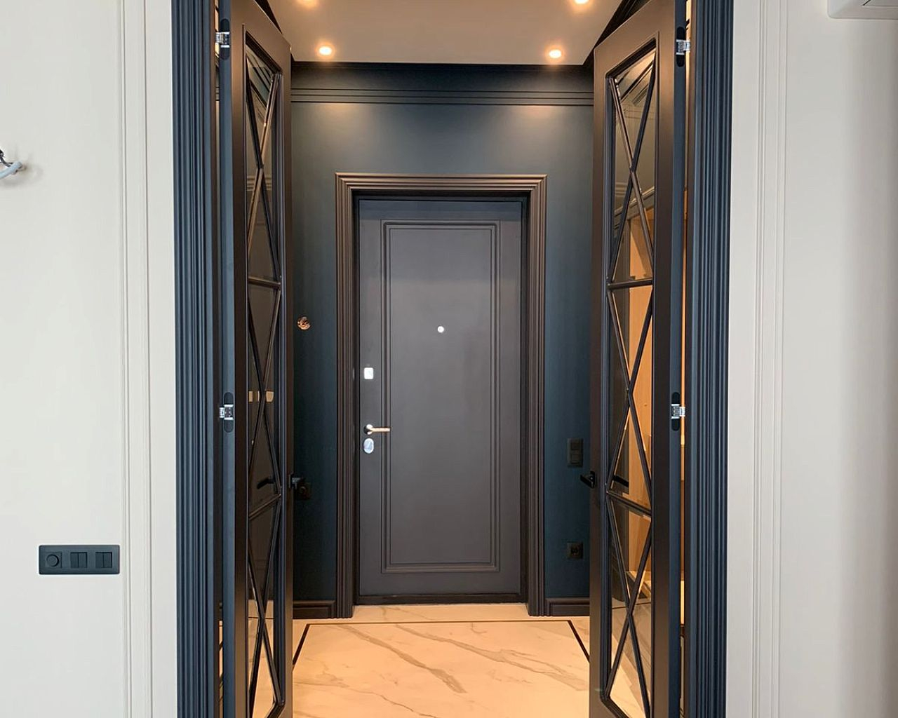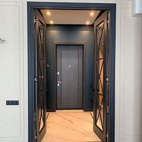 Декоративная накладка на входную дверь — важный элемент входной группы. Накладка может повторить дизайн межкомнатных дверей, тем самым создать единый интерьерный ансамбль Вашего дома. Благодаря большому разнообразию вариантов дизайна, покрытий, цветовой гамме Вы можете сделать ее акцентной или наоборот незаметной. В накладках возможно повторить те же элементы, что используются и в межкомнатных дверях: зеркала, алюминиевые молдинги, стеклянные вставки, художественная наборка шпона. Вы можете выбрать тот дизайн, который нравится именно Вам.