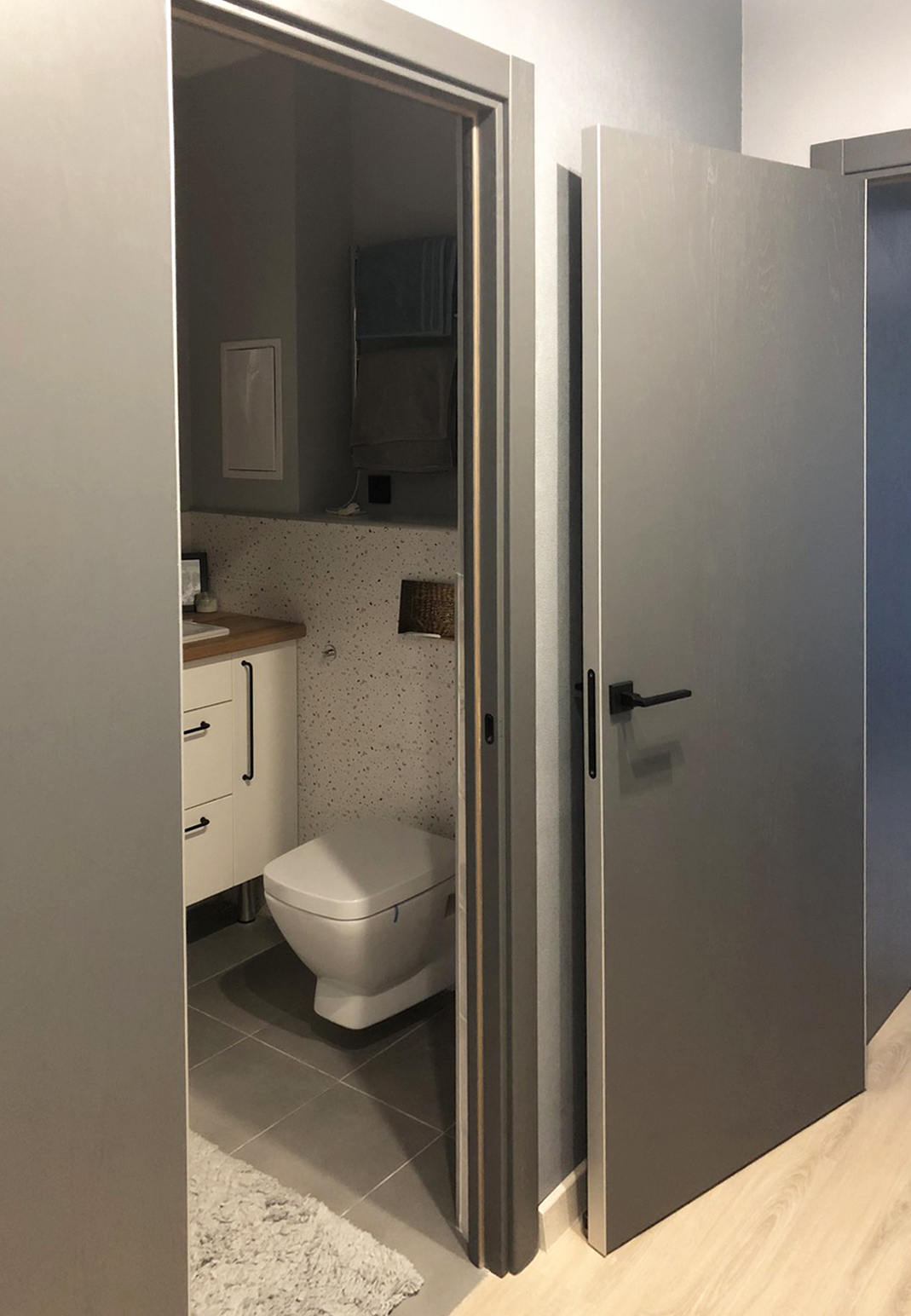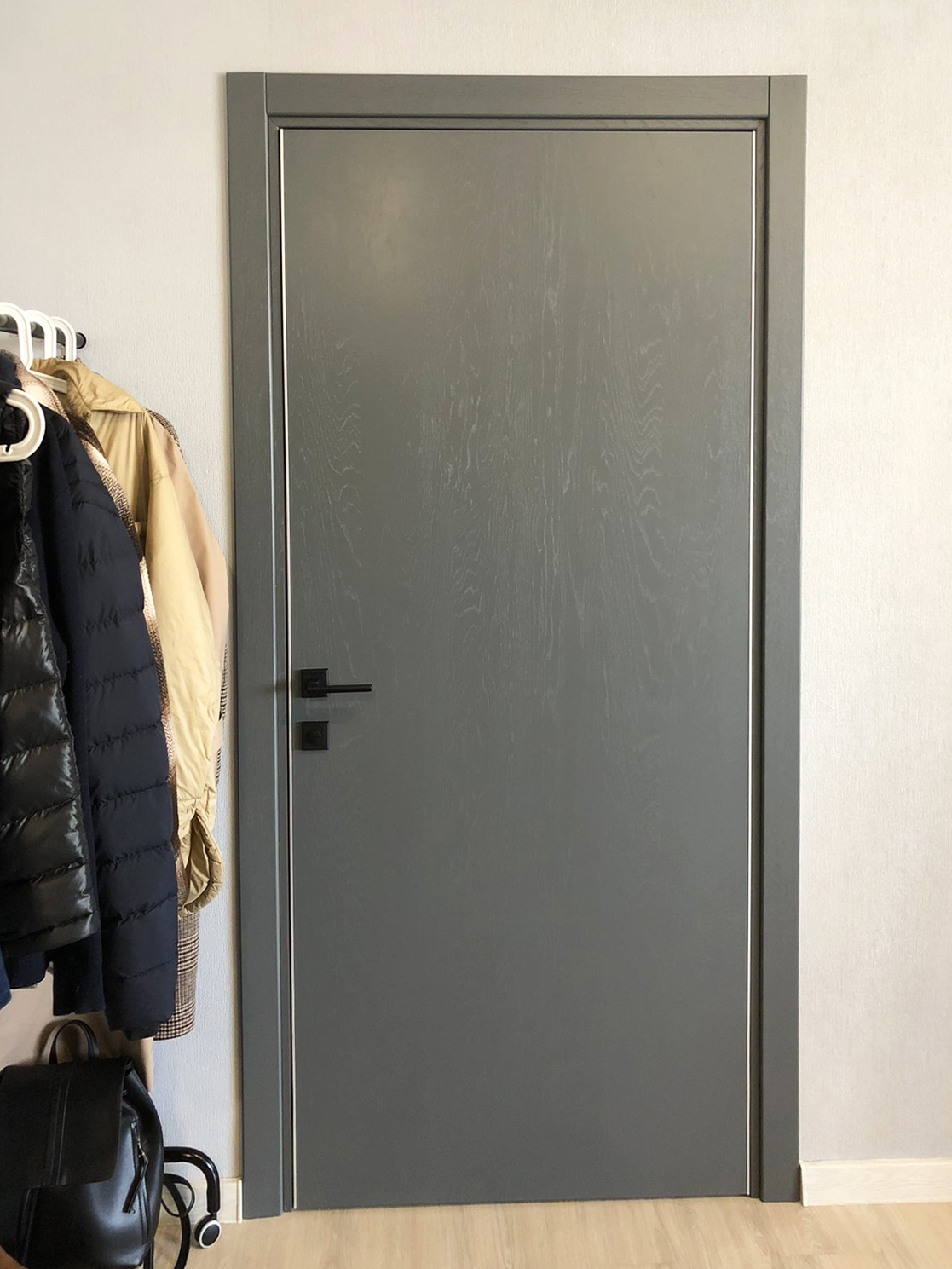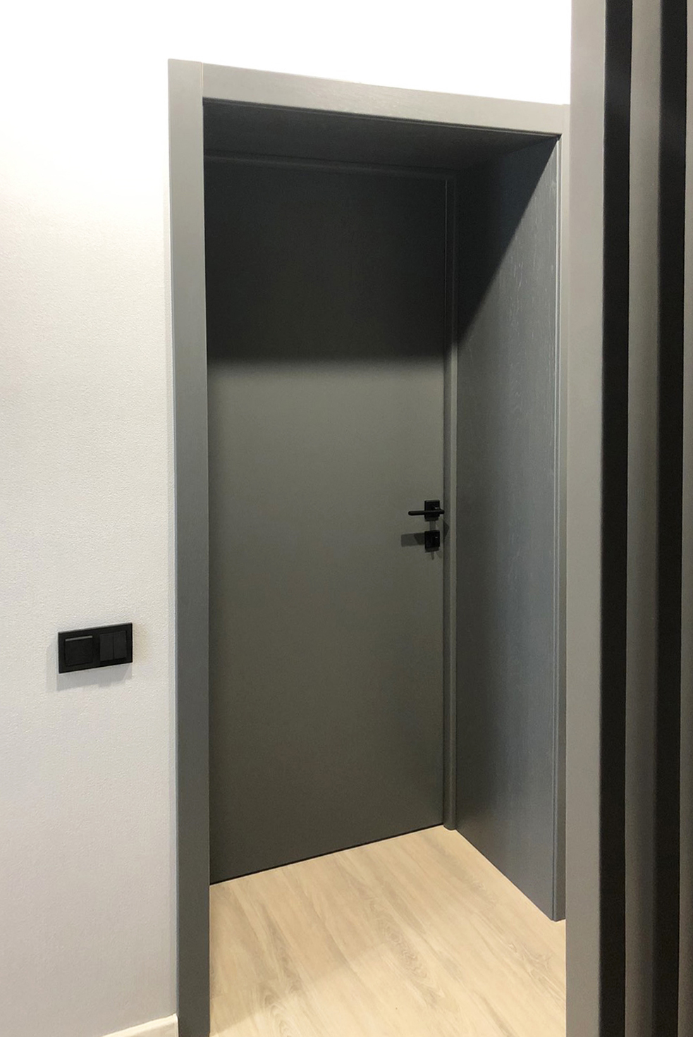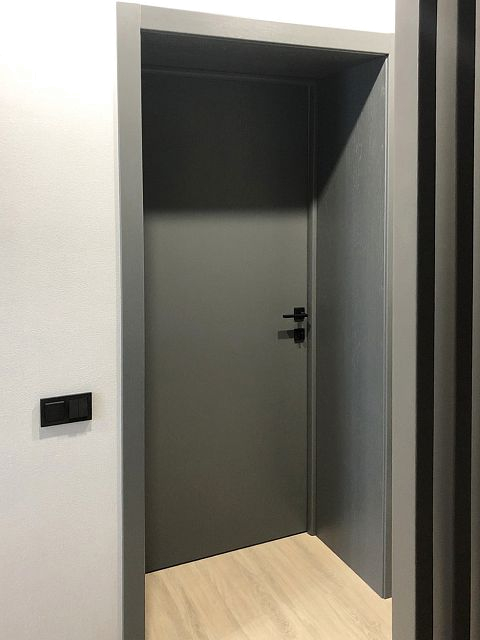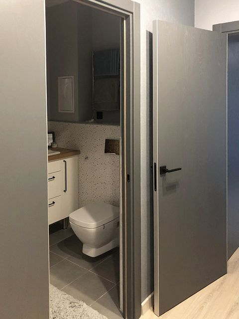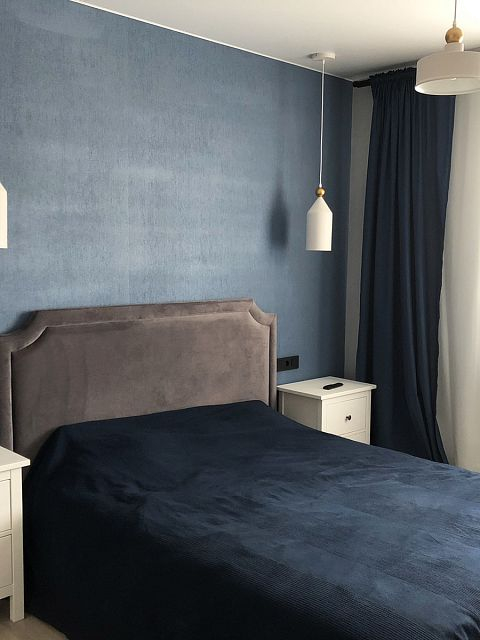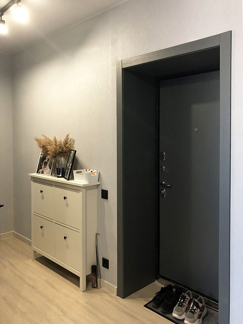 Дизайн-проект квартиры в ЖК "На Владимирской" был создан для молодой семьи. Бюджет был ограничен, но с помощью хозяйки квартиры, обладающей отличным вкусом, удалось получить хороший результат. Ее любимый цвет - синий - был использован в интерьере как акцент, к нему в пару отлично подошли серые двери фабрики Терем. Лаконичный дизайн всего интерьера продиктовал выбор соответствующей модели с гладким полотном, легкой текстурой дерева и черными ручками, поддерживающими люстры и выключатели.