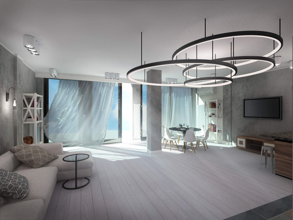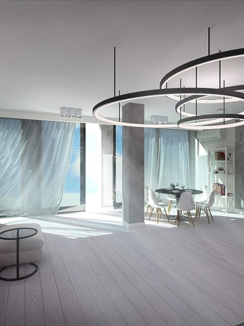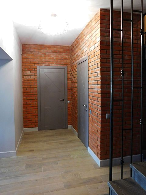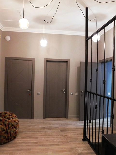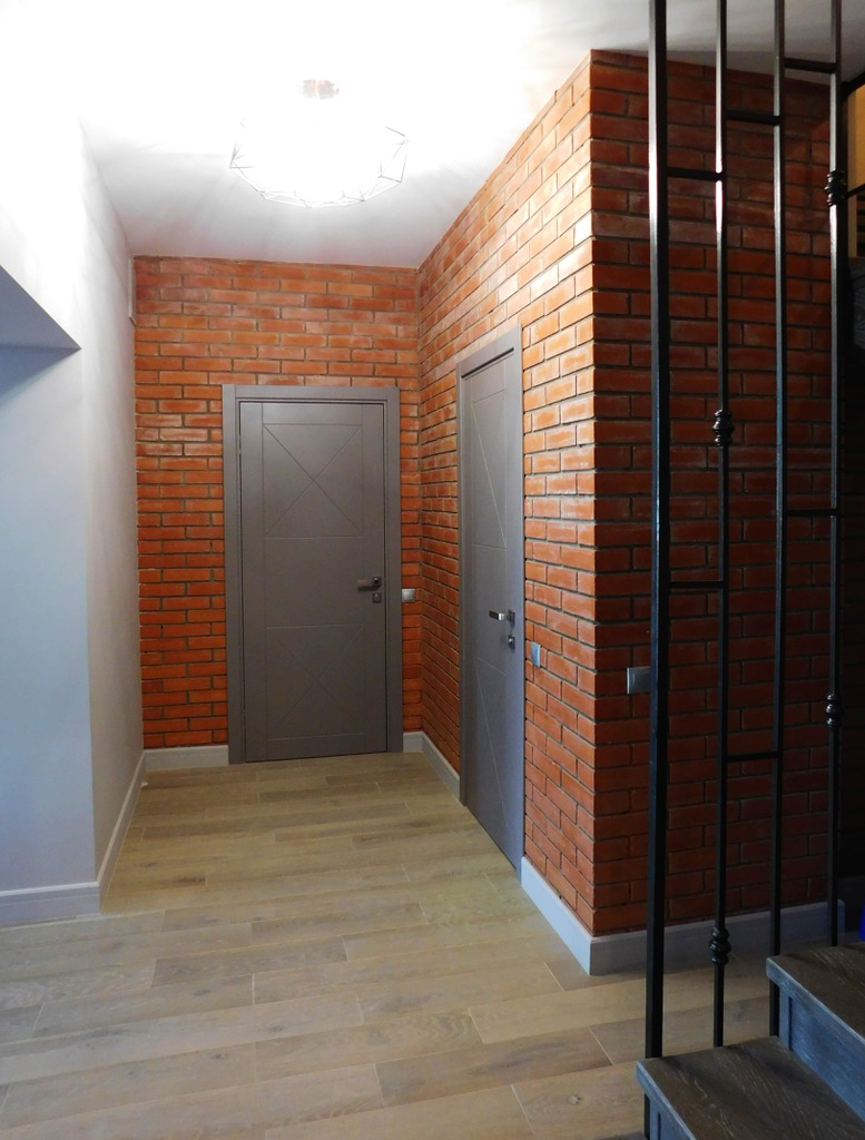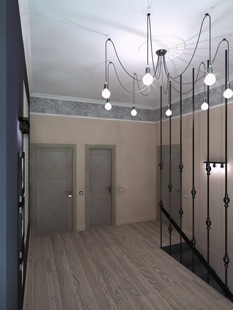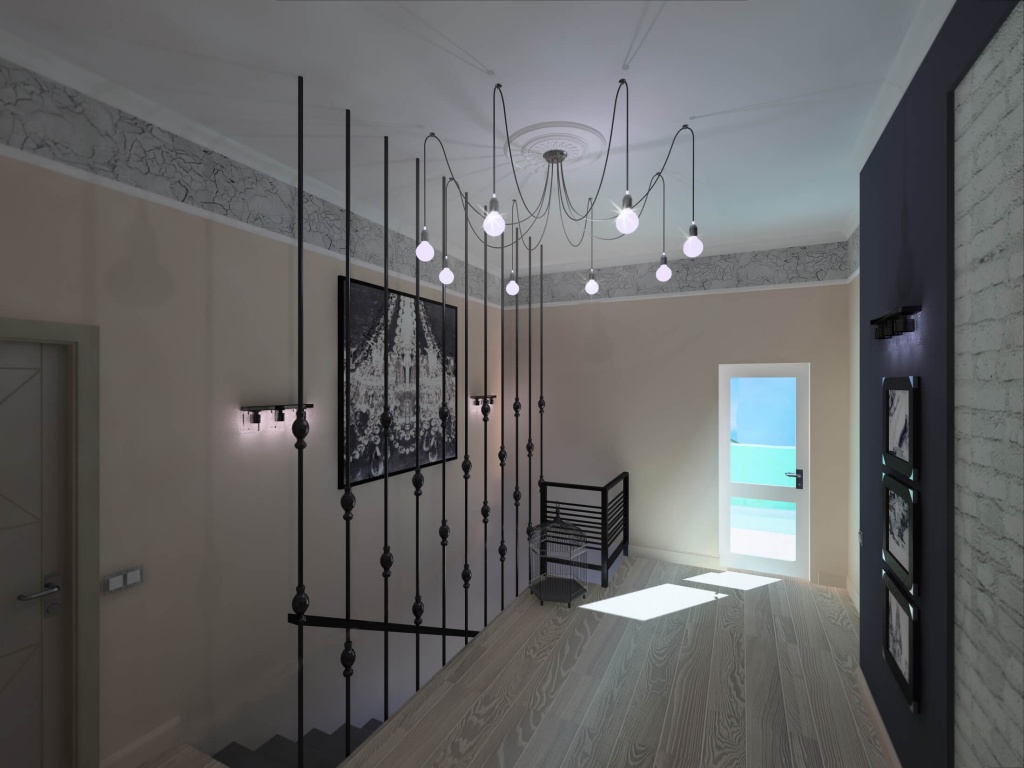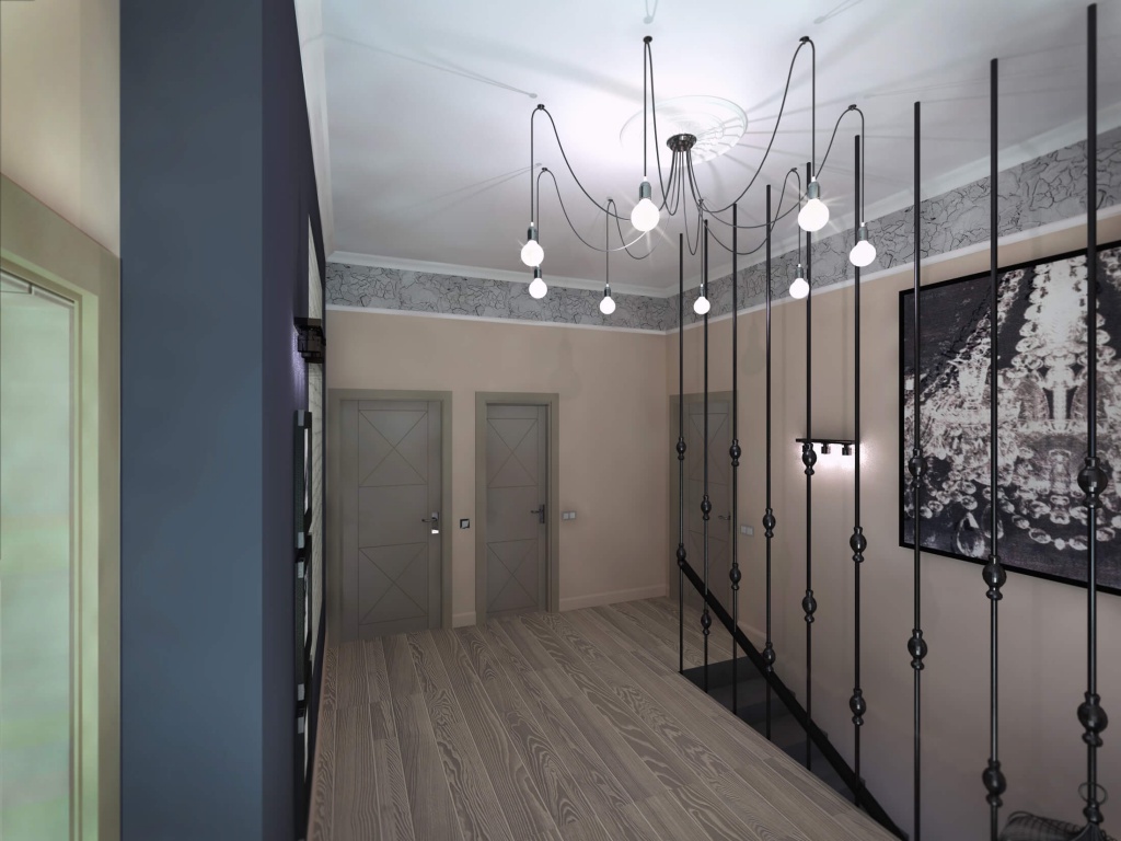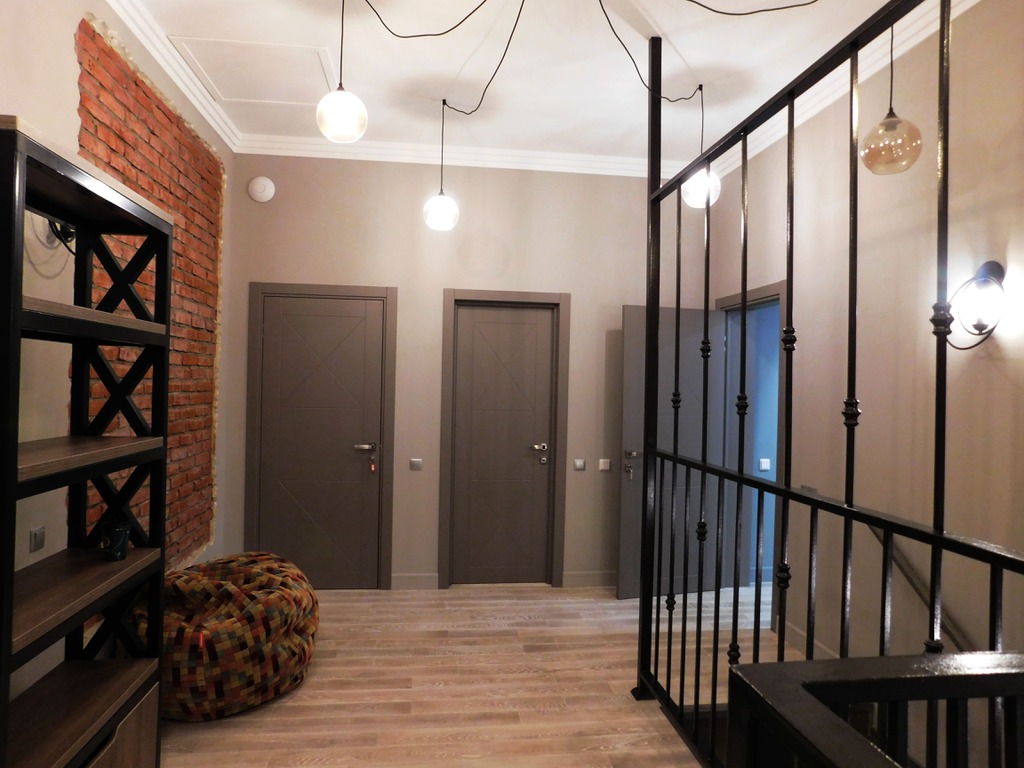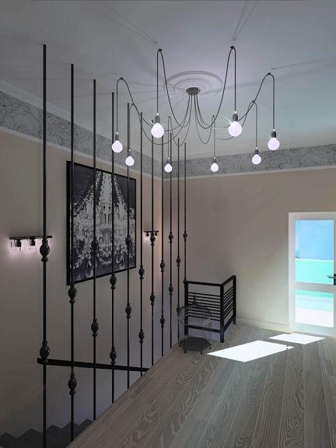 Пожелания заказчиков были следующими: серый цвет - основа палитры, пол - преимущественно паркетная доска под выбеленный сероватый дуб, штукатурка под бетон, голые кирпичные стены, стилистика loft. Конечно, чисто к лофту этот проект отнести сложно, но у нас получился интересный микс фактур, светильников и видов отделки. Особенно мне нравится лестничный холл, для которого мы придумали ограждение из чёрного металла. Эта конструкция смотрится как отдельный арт-объект и отлично сочетается со светильником «пауком» на потолке.