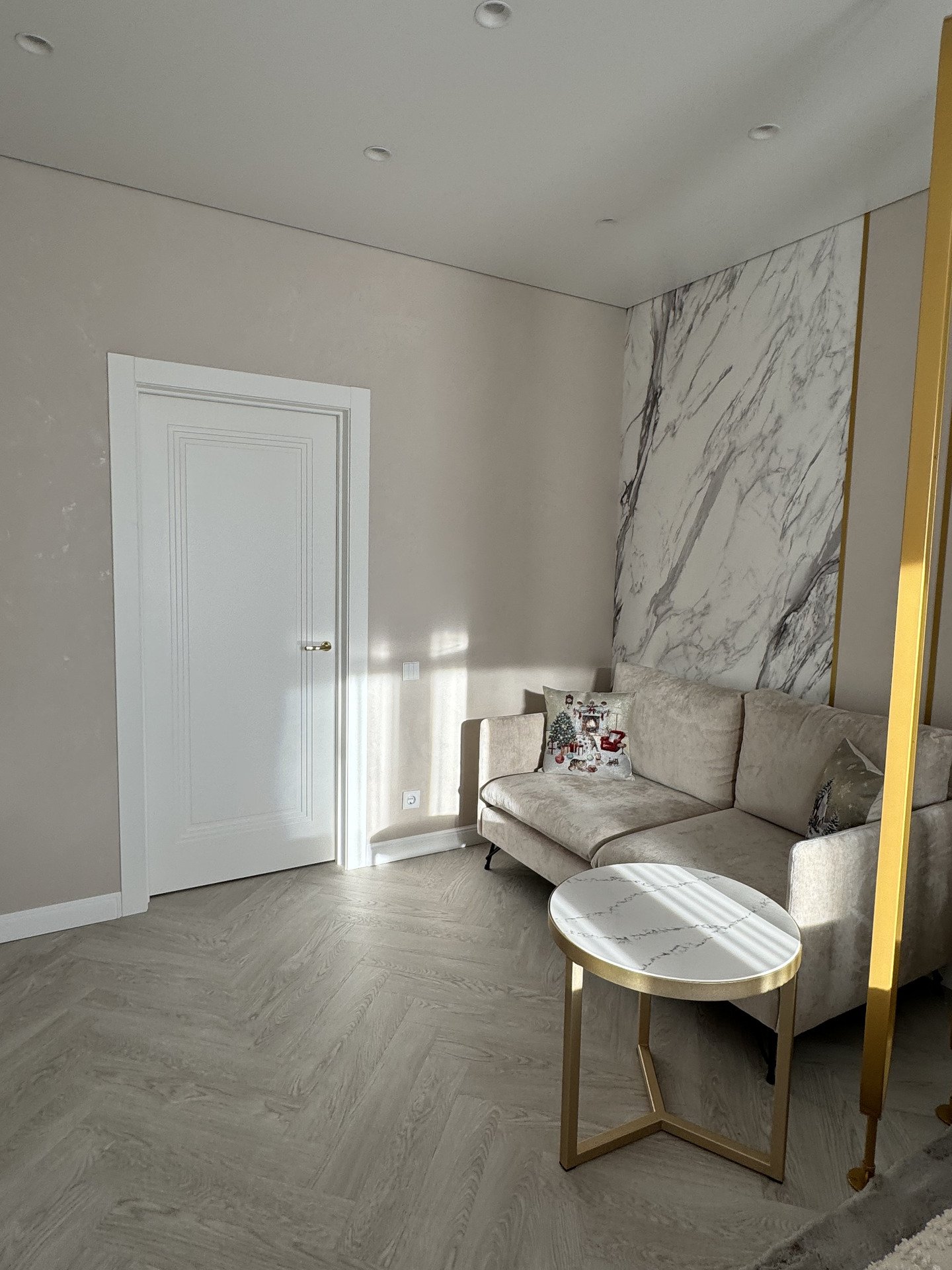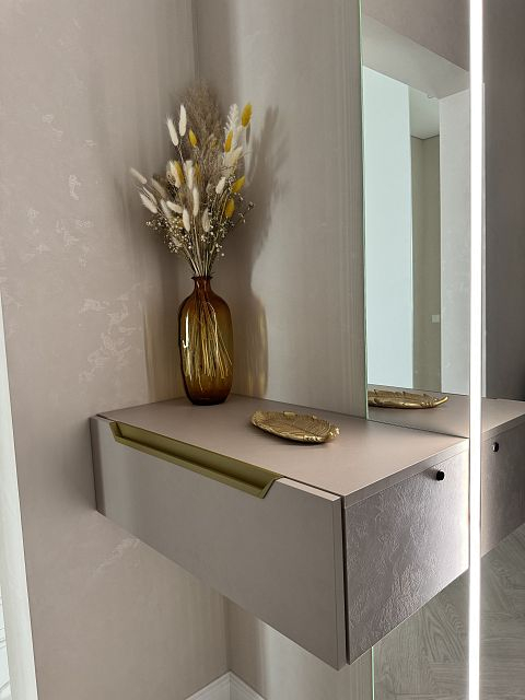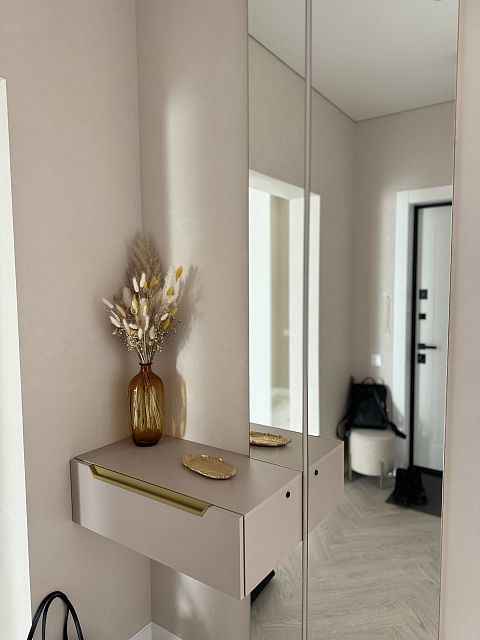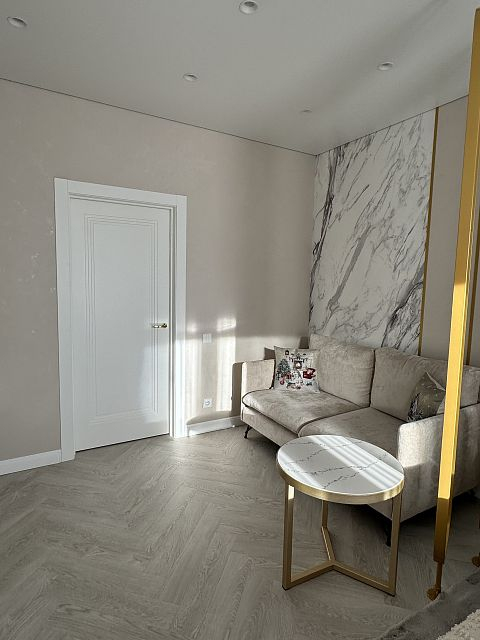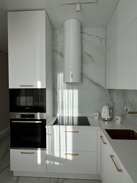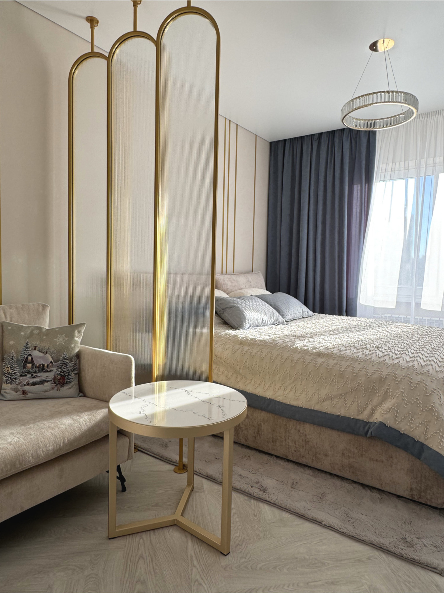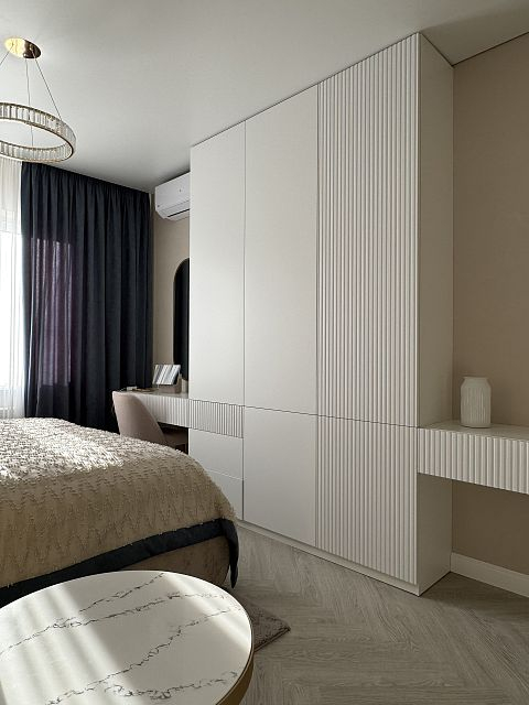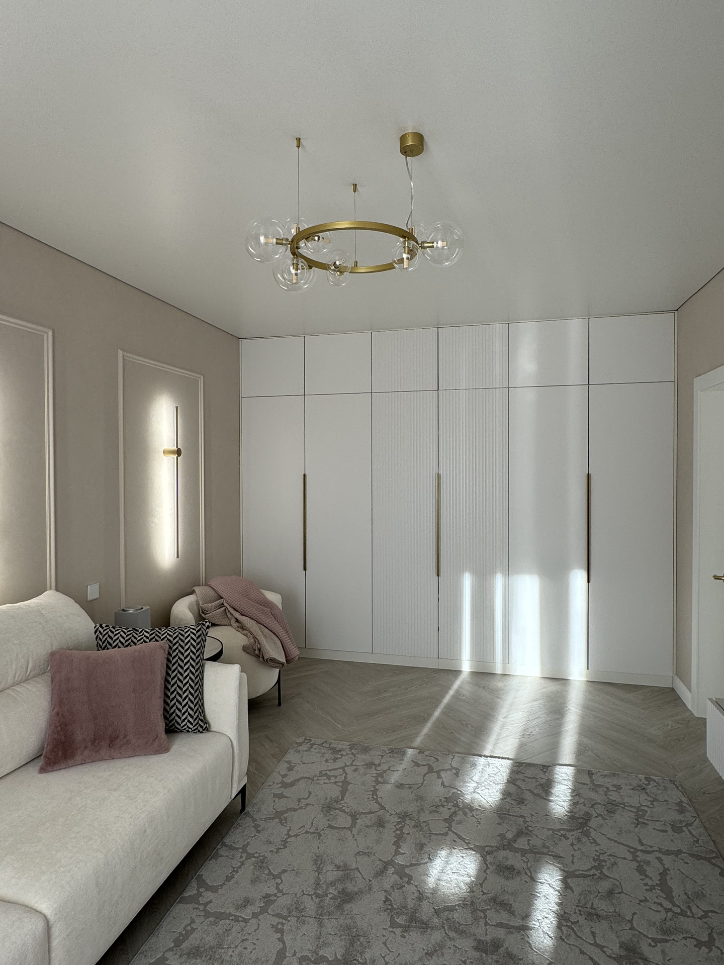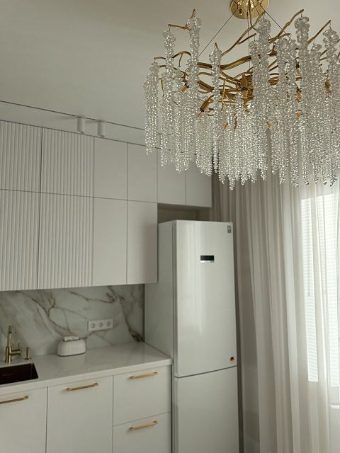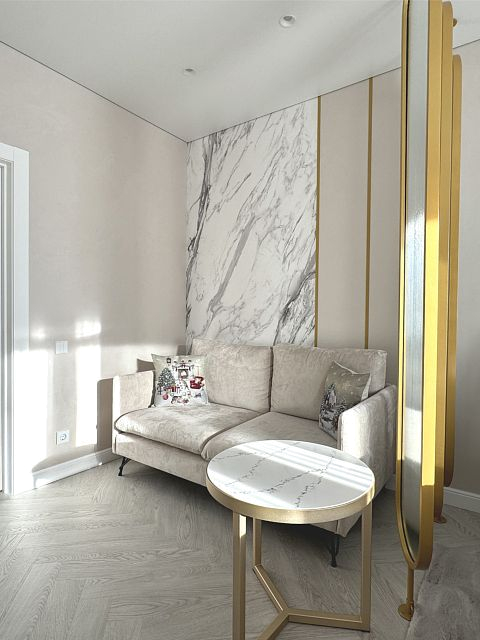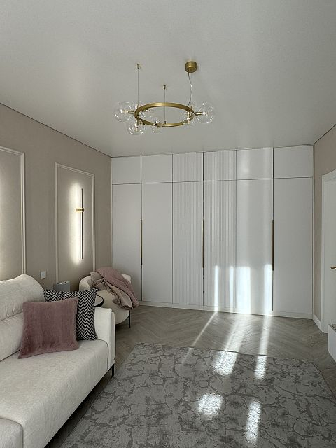 Проект "Золотое сечение" выполнен в стильных светлых тонах, создавая атмосферу легкости и спокойствия. Главным акцентом стали золотые элементы, которые добавляют изысканности и утонченности в общий интерьер.