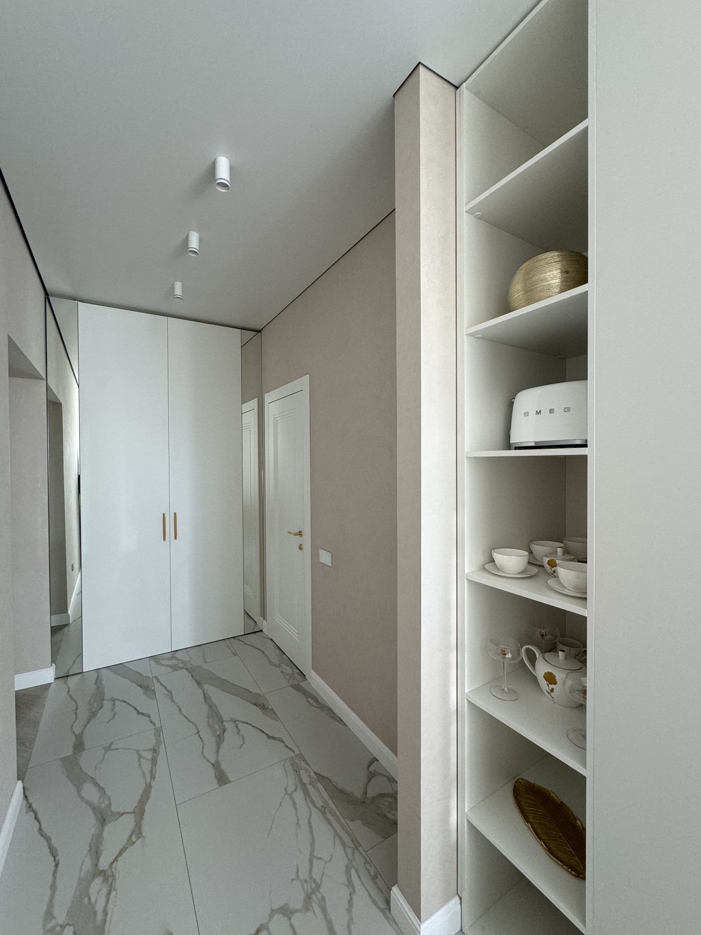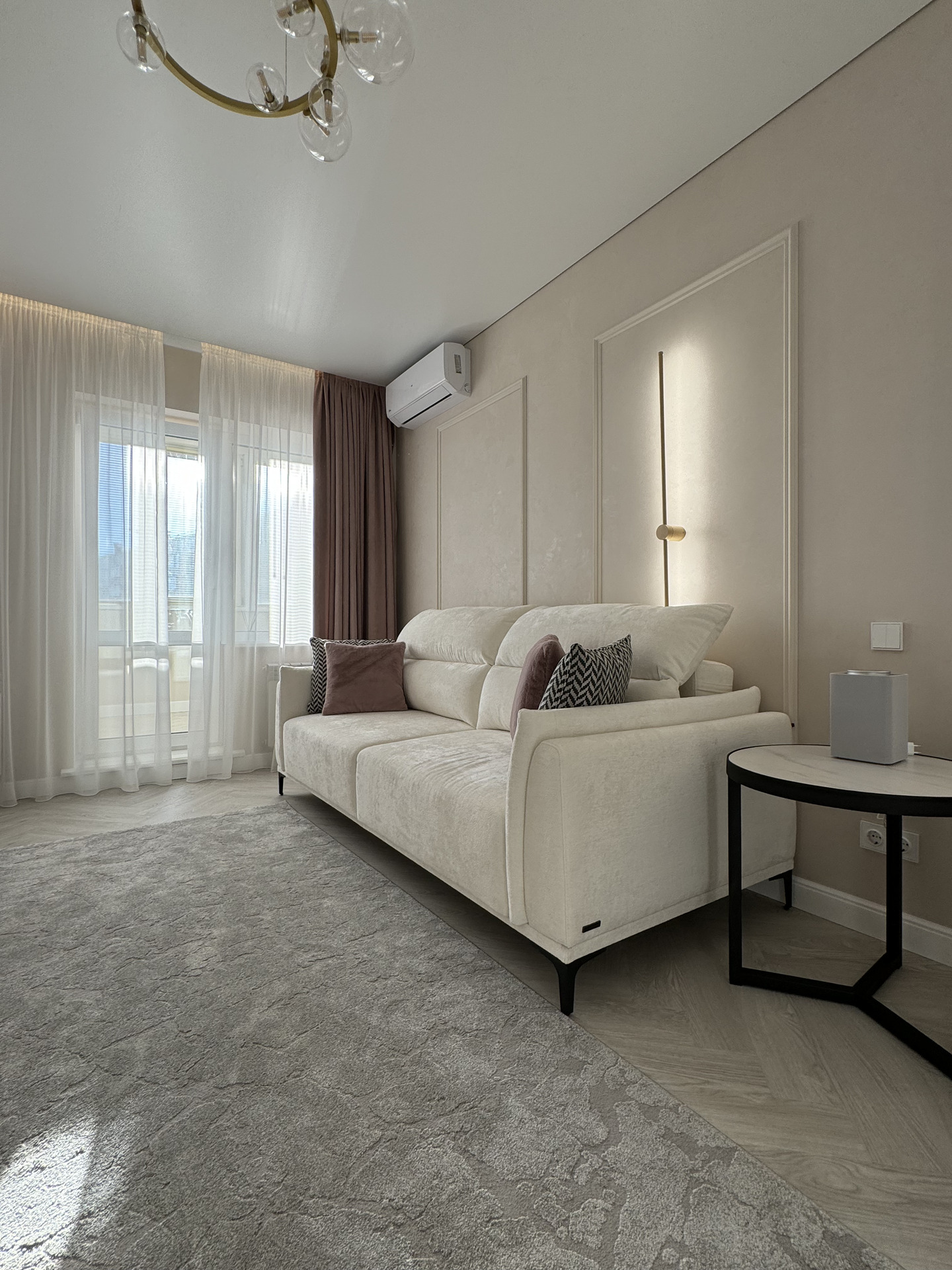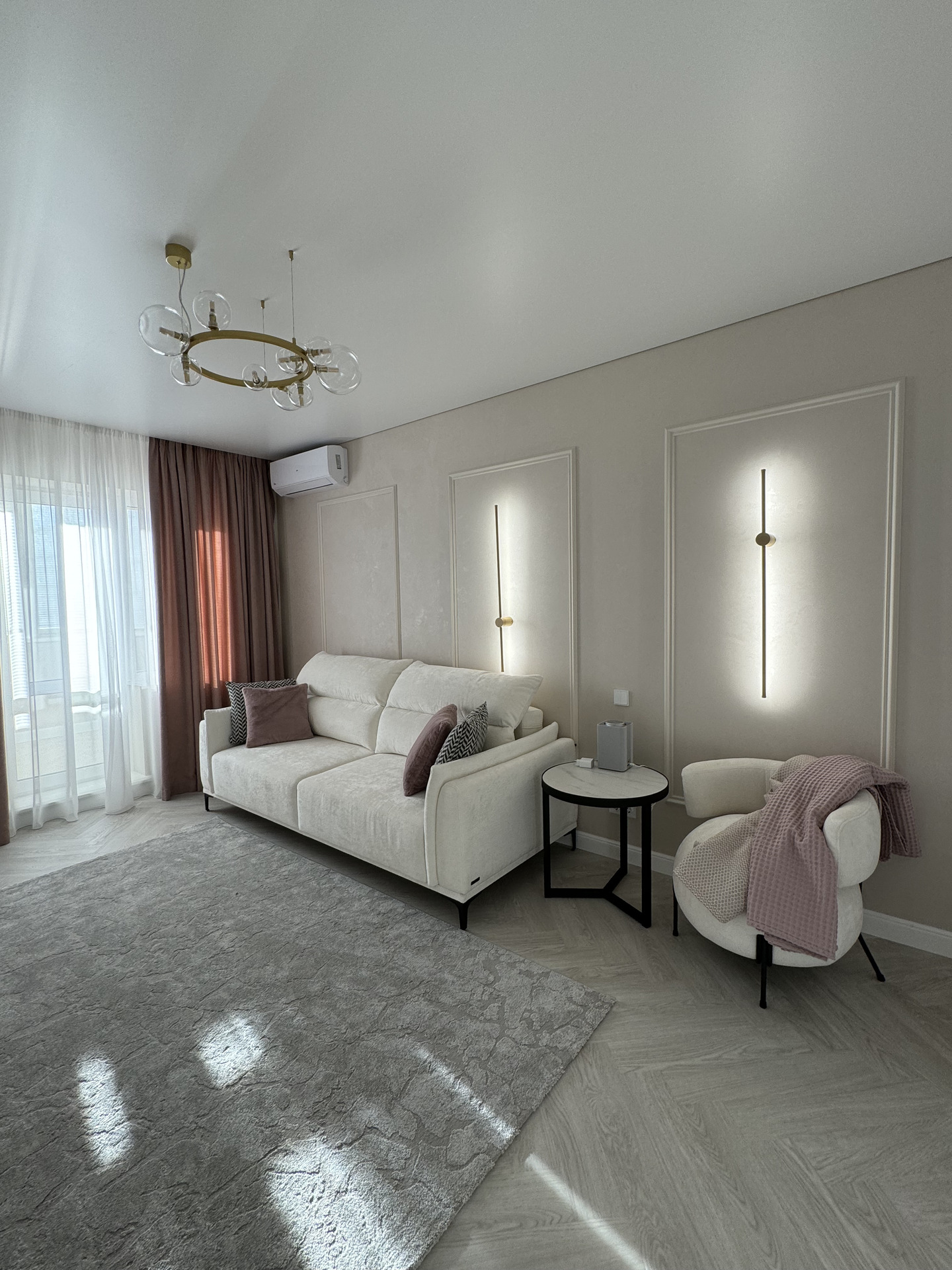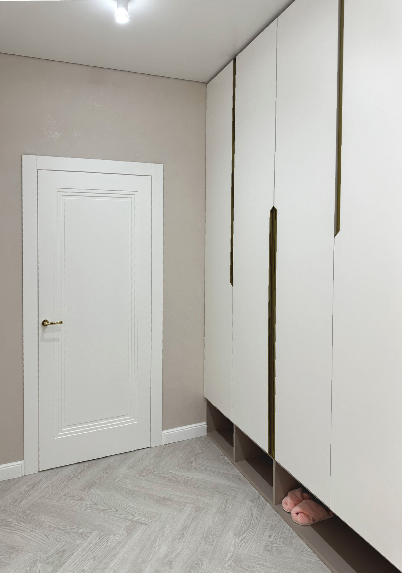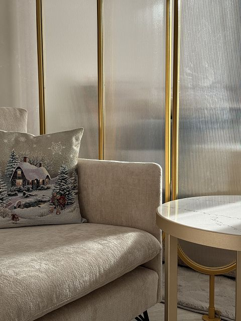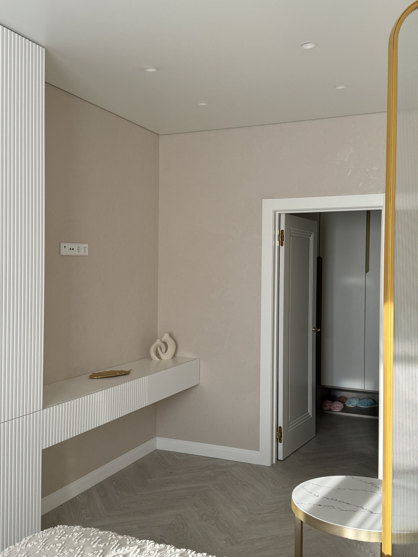 Проект "Золотое сечение" выполнен в стильных светлых тонах, создавая атмосферу легкости и спокойствия. Главным акцентом стали золотые элементы, которые добавляют изысканности и утонченности в общий интерьер.