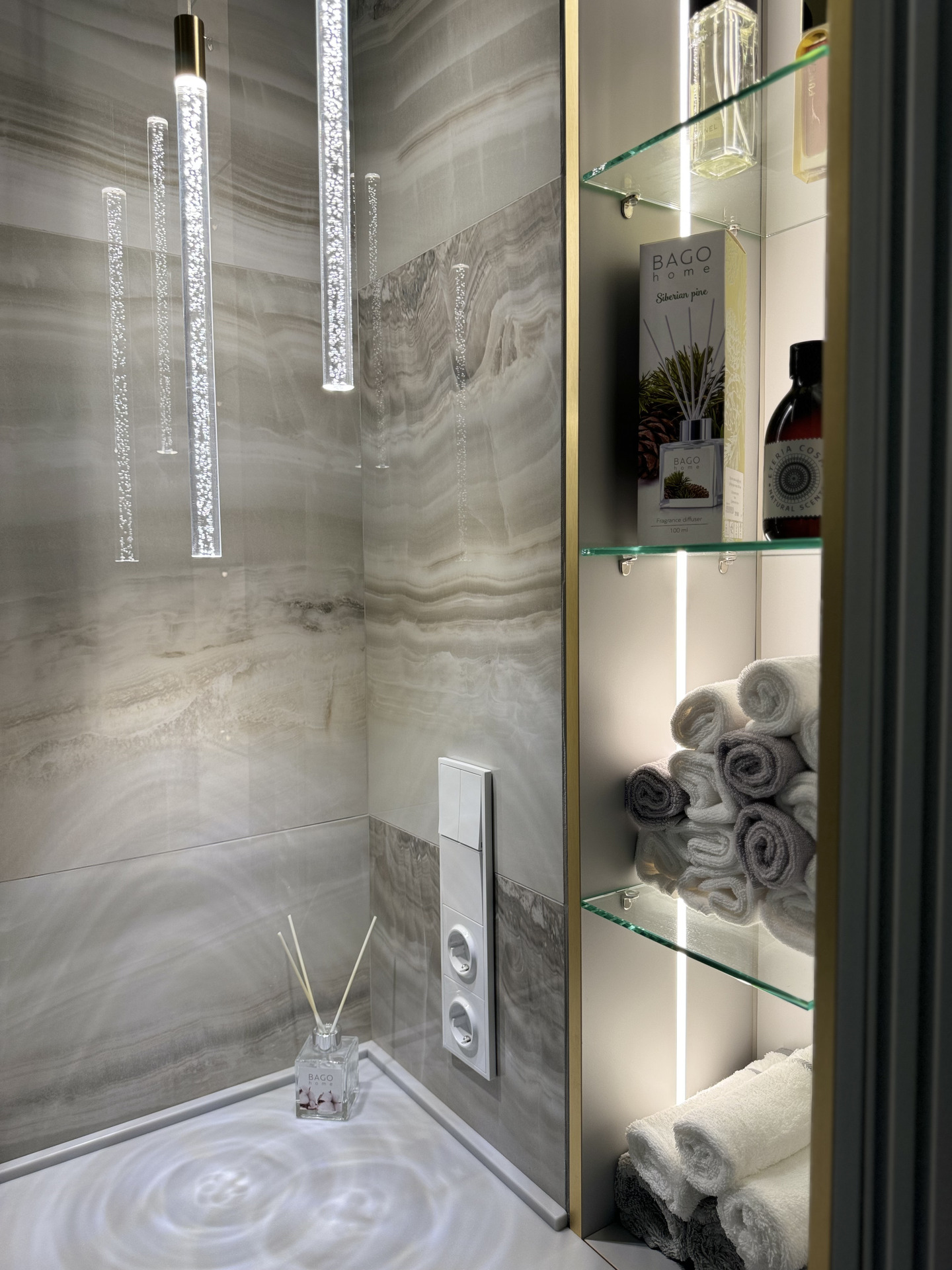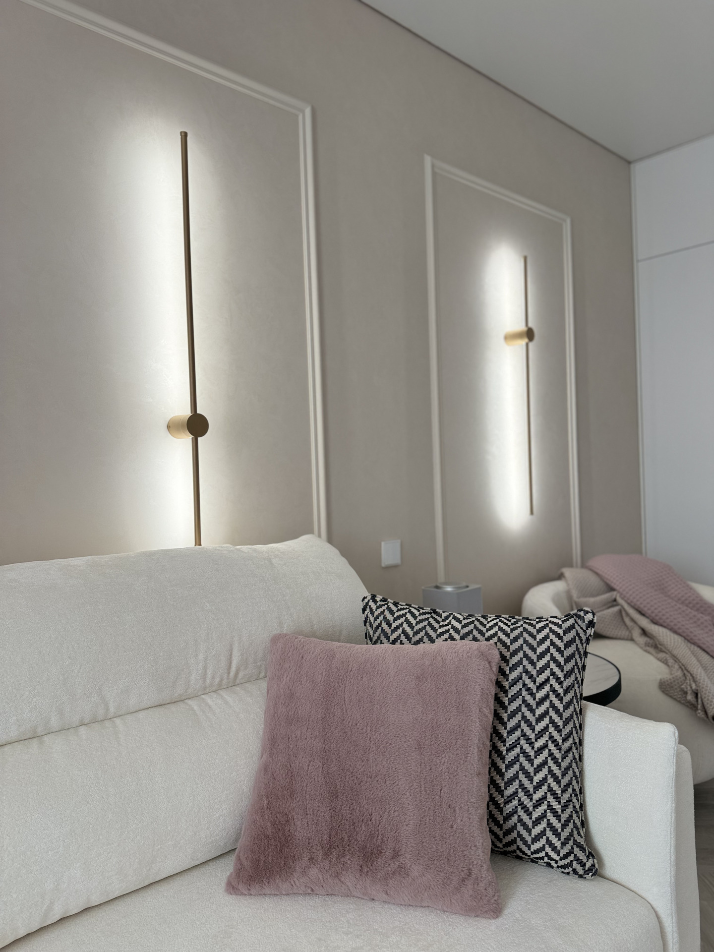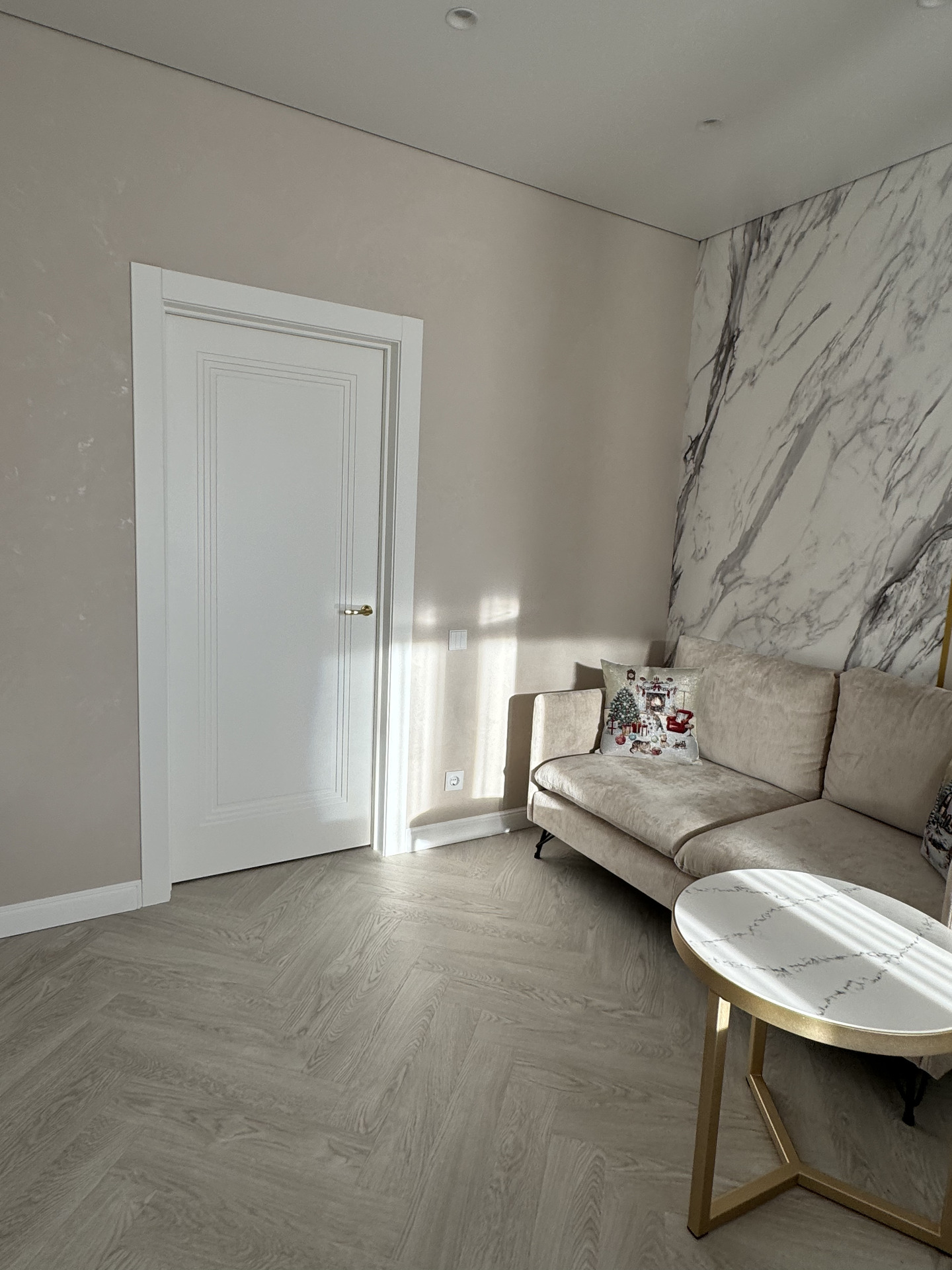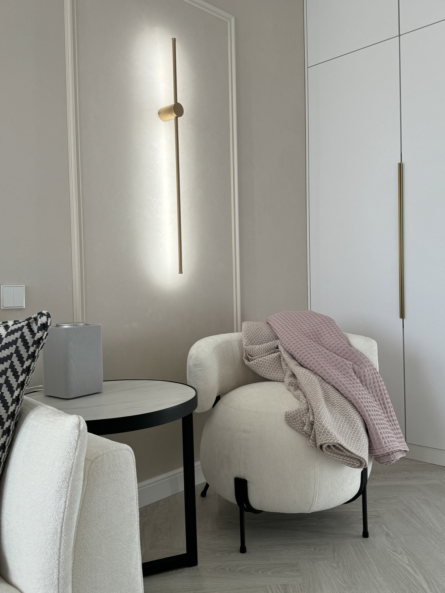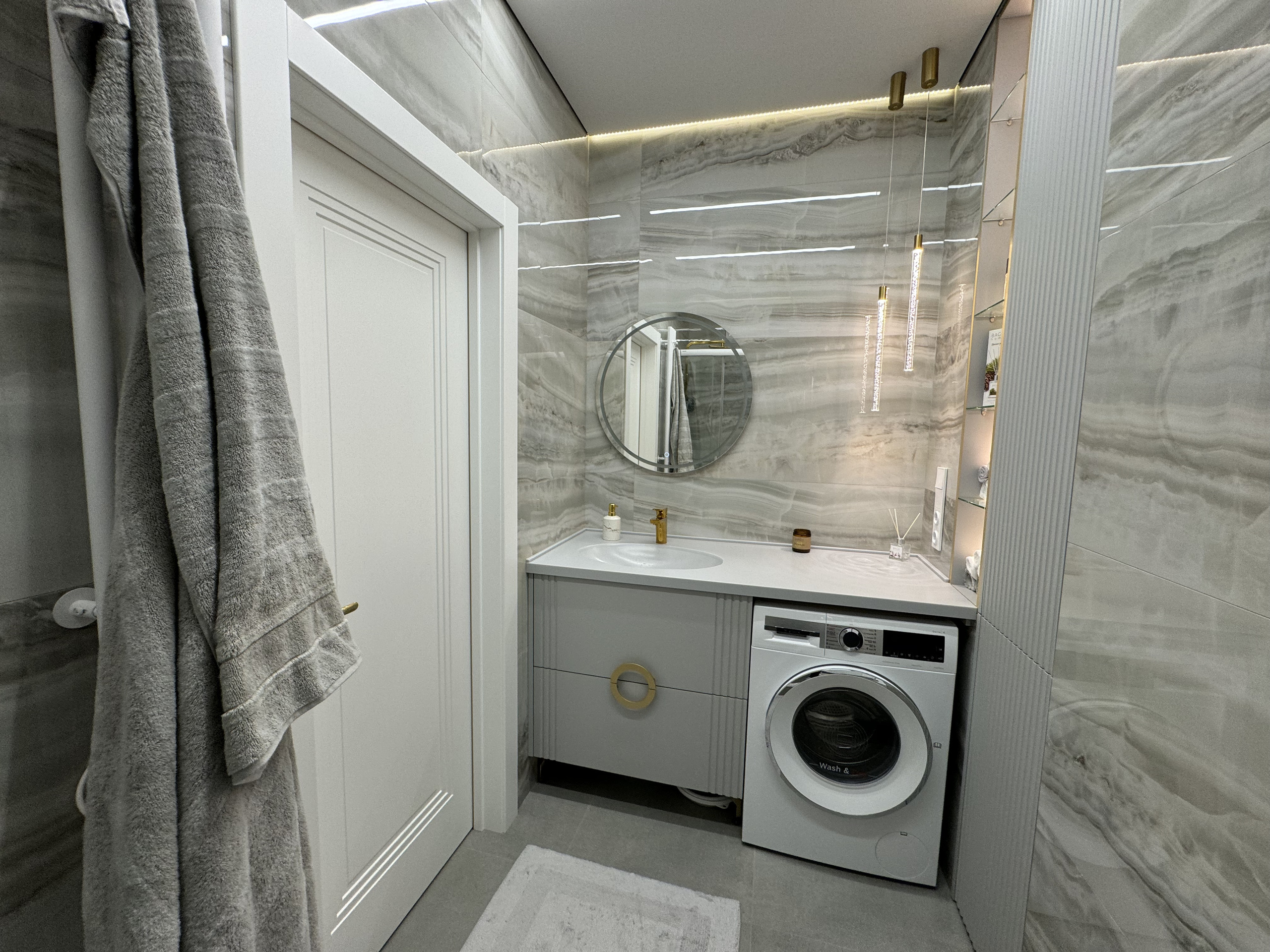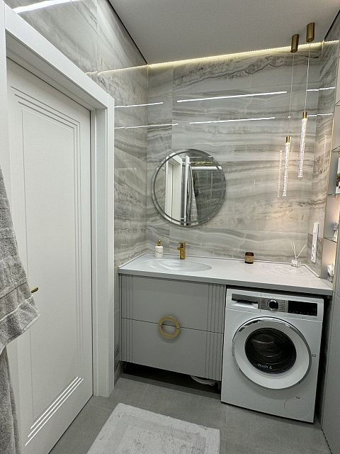 Проект "Золотое сечение" выполнен в стильных светлых тонах, создавая атмосферу легкости и спокойствия. Главным акцентом стали золотые элементы, которые добавляют изысканности и утонченности в общий интерьер.