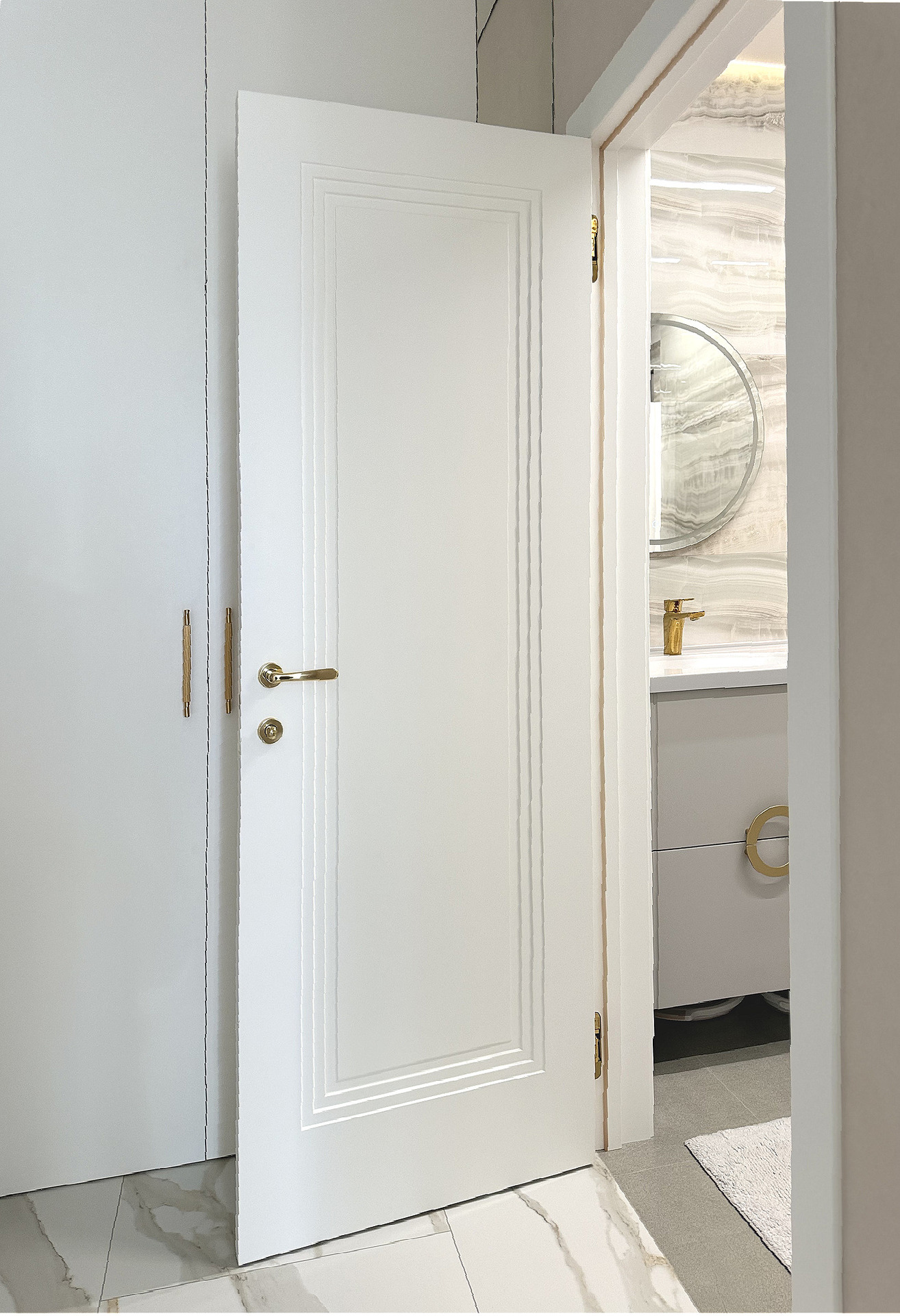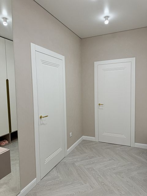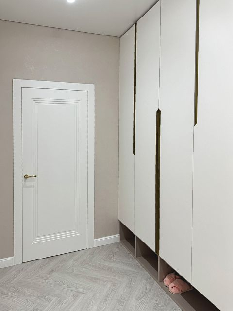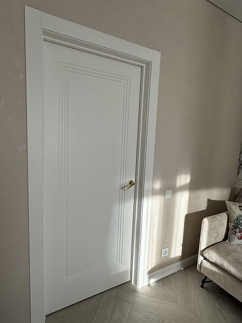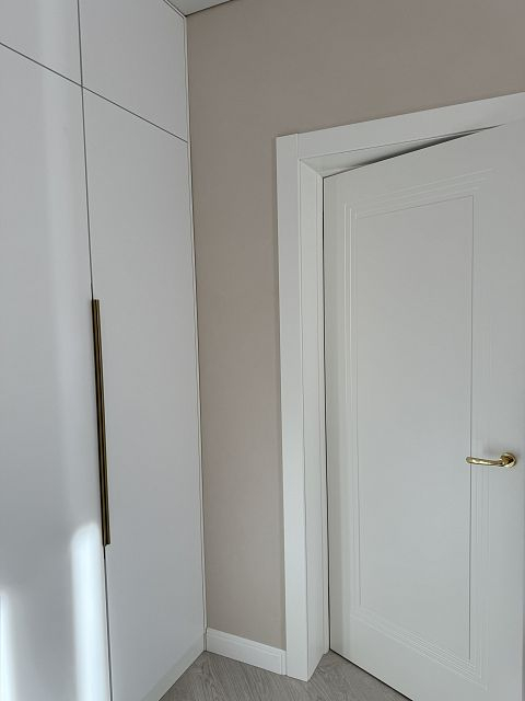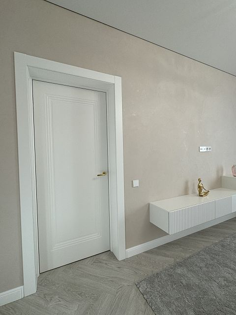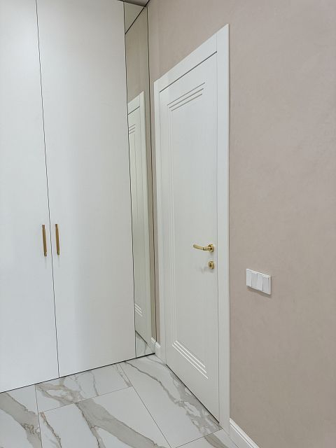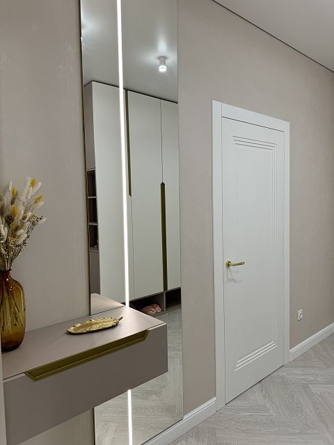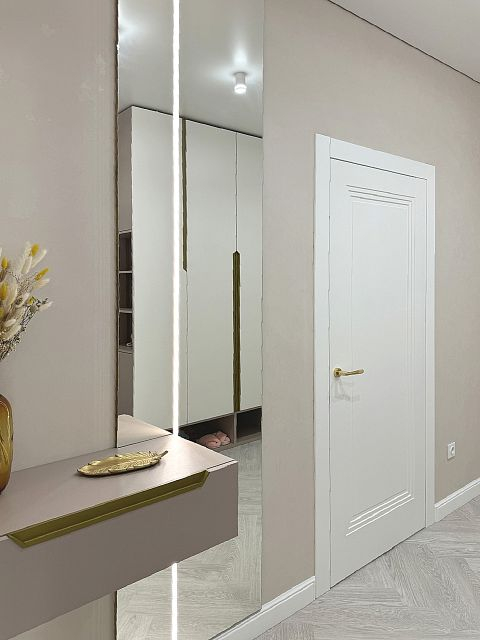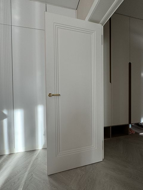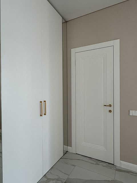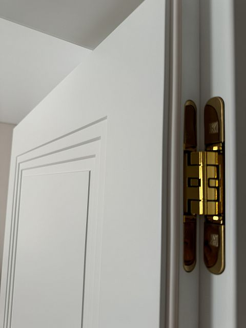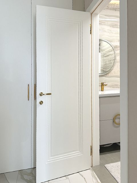 В этом проекте использована трендовая межкомнатная дверь Step 01, обладающая глубокой ступенчатой фрезеровкой. Дверь выполнена в популярном покрытии белая эмаль, что придает ей современный вид. Золотые скрытые петли и ручки подчеркивают стильный подход к деталям, делая каждую деталь гармоничной и уместной в общем дизайне.