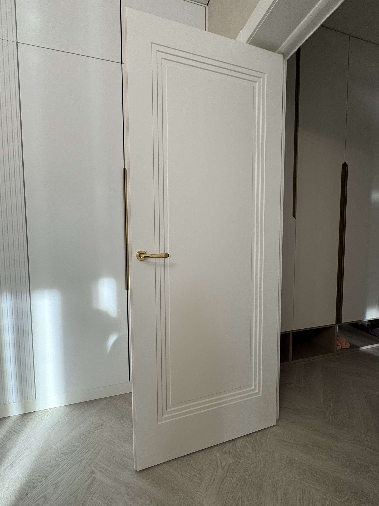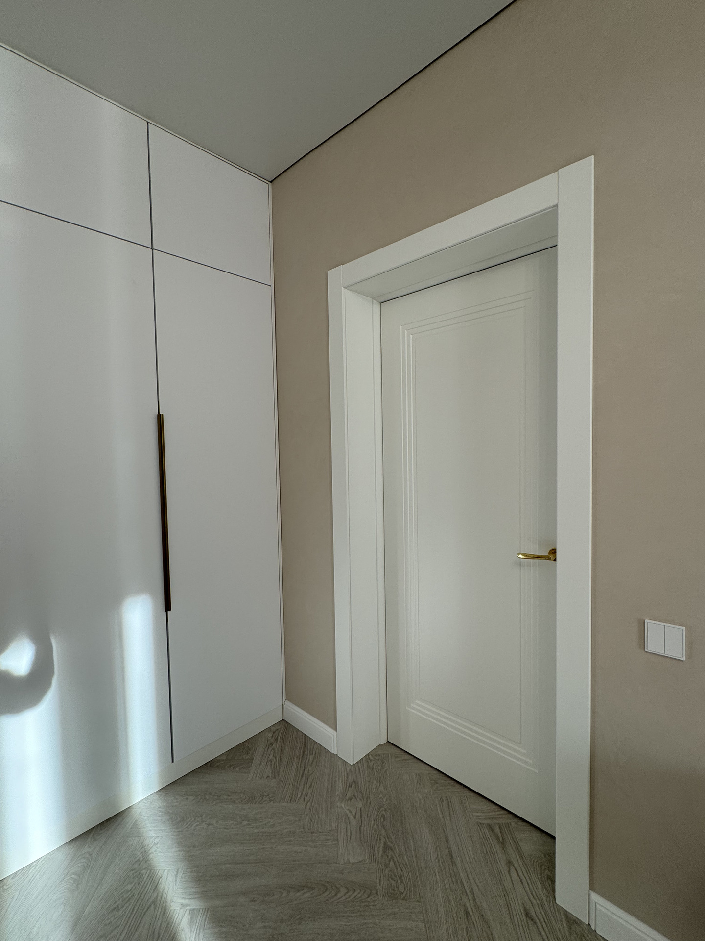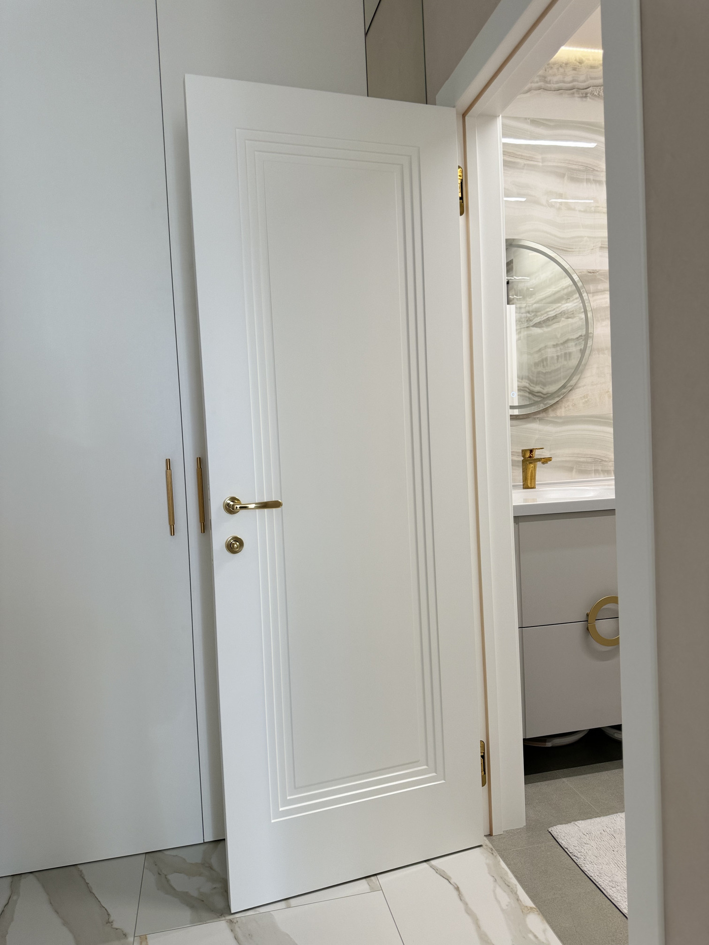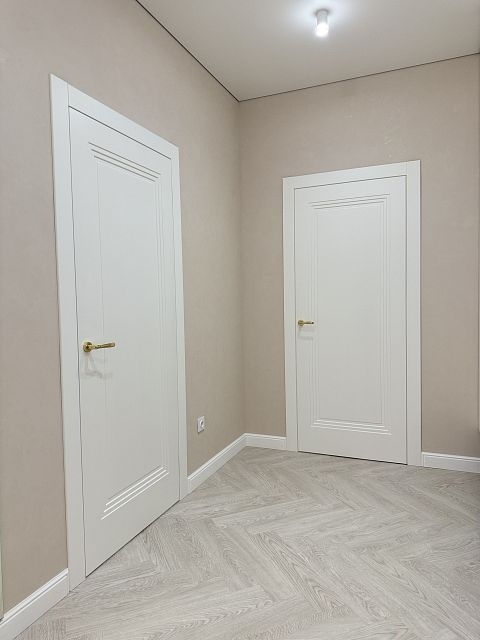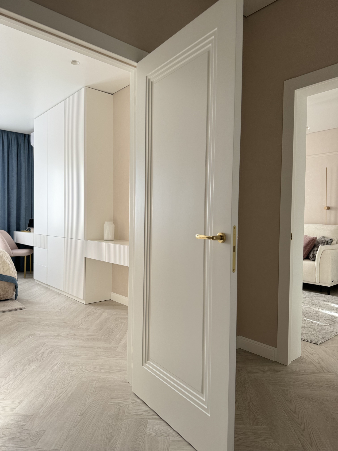 В этом проекте использована трендовая межкомнатная дверь Step 01, обладающая глубокой ступенчатой фрезеровкой. Дверь выполнена в популярном покрытии белая эмаль, что придает ей современный вид. Золотые скрытые петли и ручки подчеркивают стильный подход к деталям, делая каждую деталь гармоничной и уместной в общем дизайне.