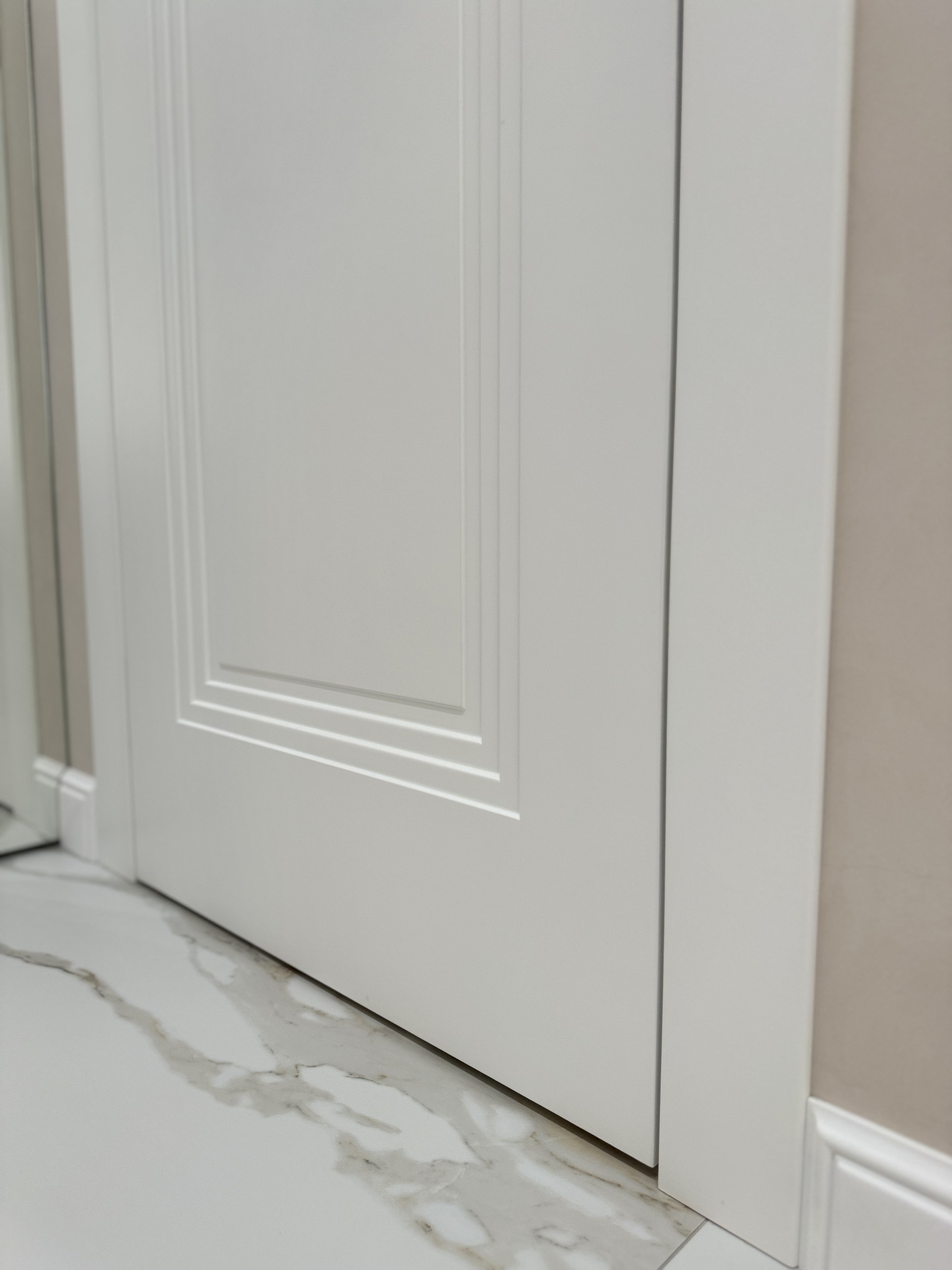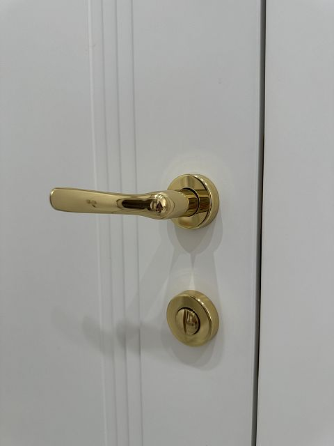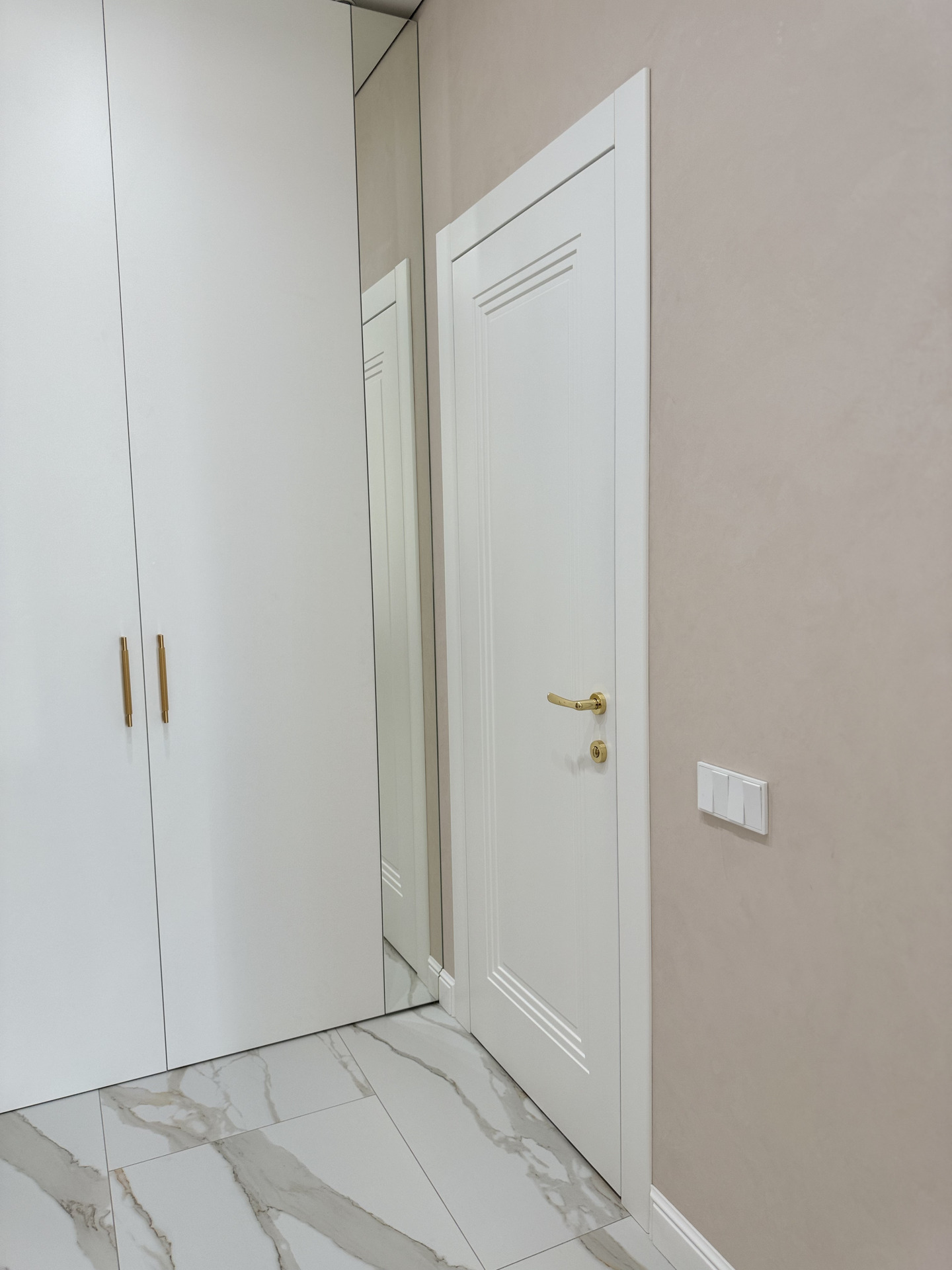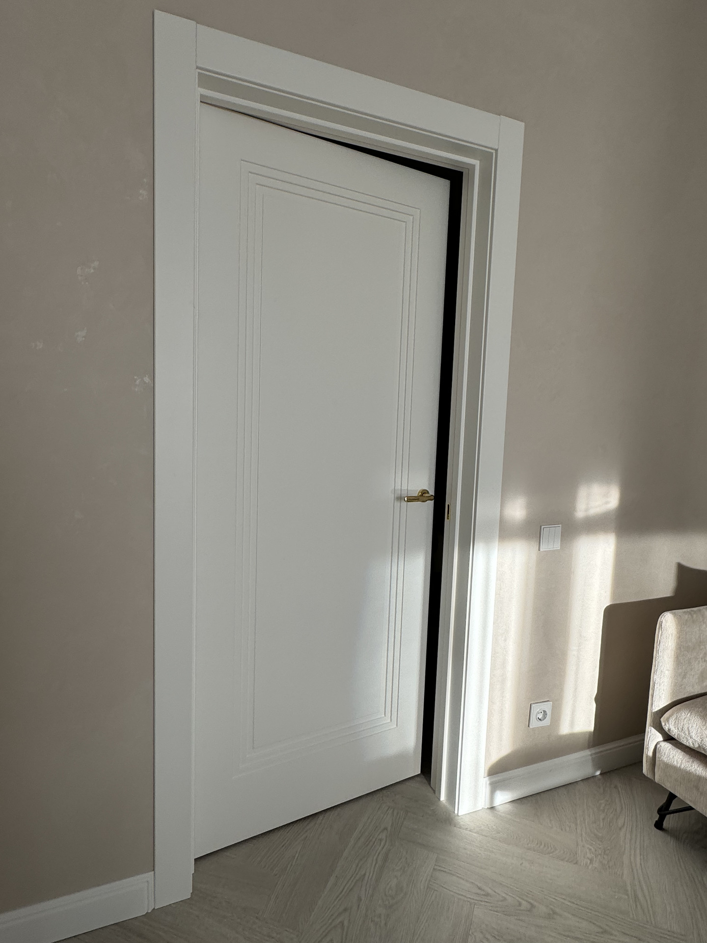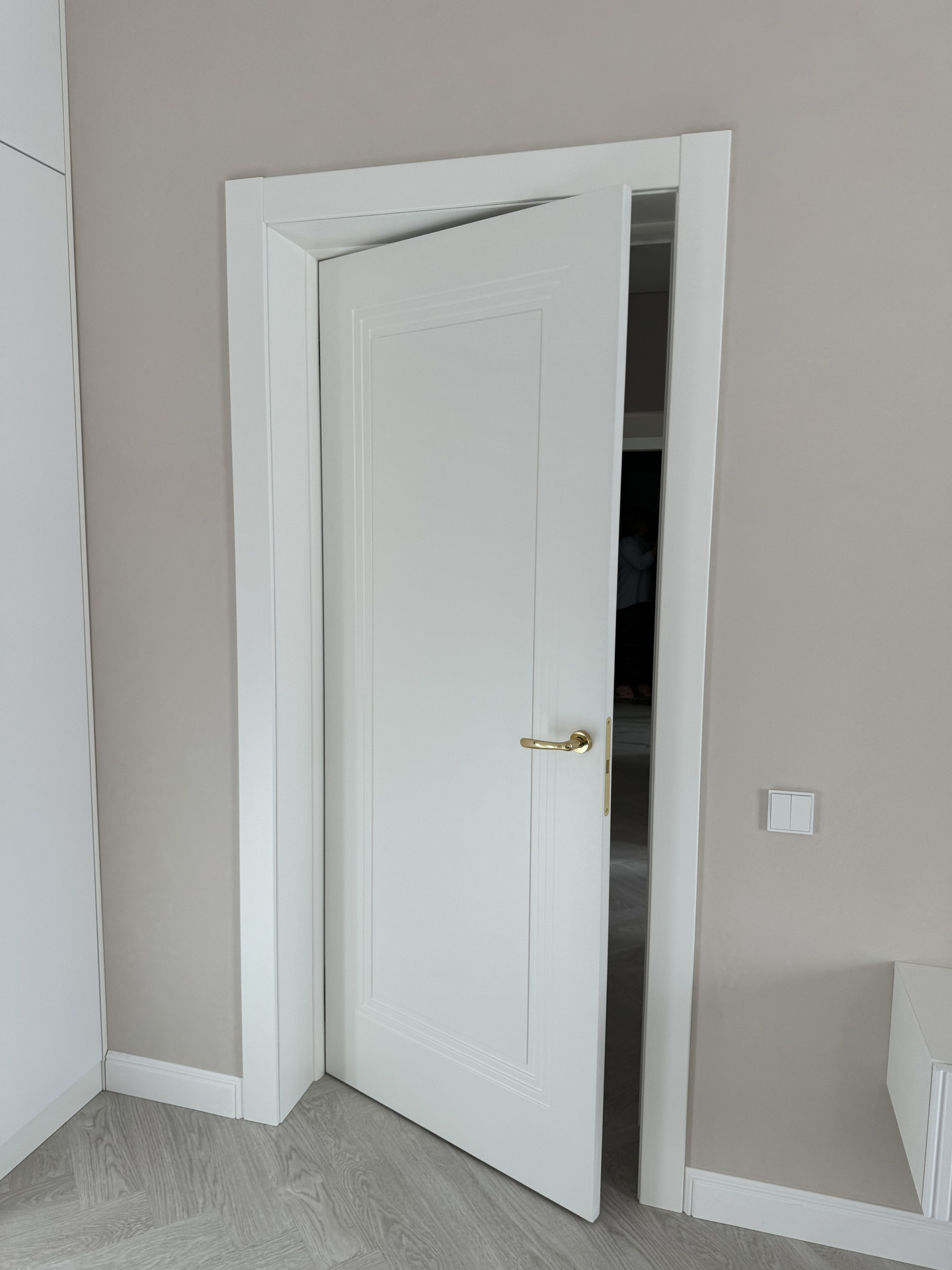 В этом проекте использована трендовая межкомнатная дверь Step 01, обладающая глубокой ступенчатой фрезеровкой. Дверь выполнена в популярном покрытии белая эмаль, что придает ей современный вид. Золотые скрытые петли и ручки подчеркивают стильный подход к деталям, делая каждую деталь гармоничной и уместной в общем дизайне.