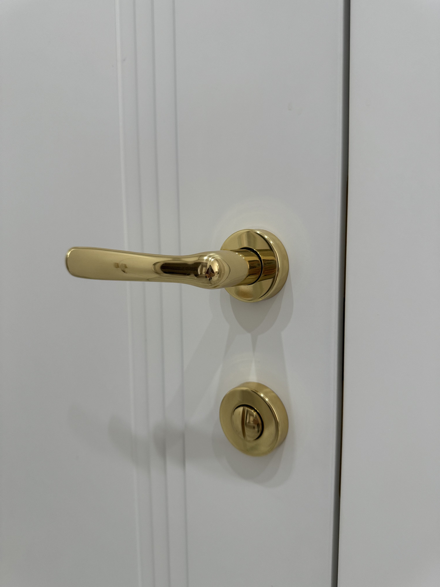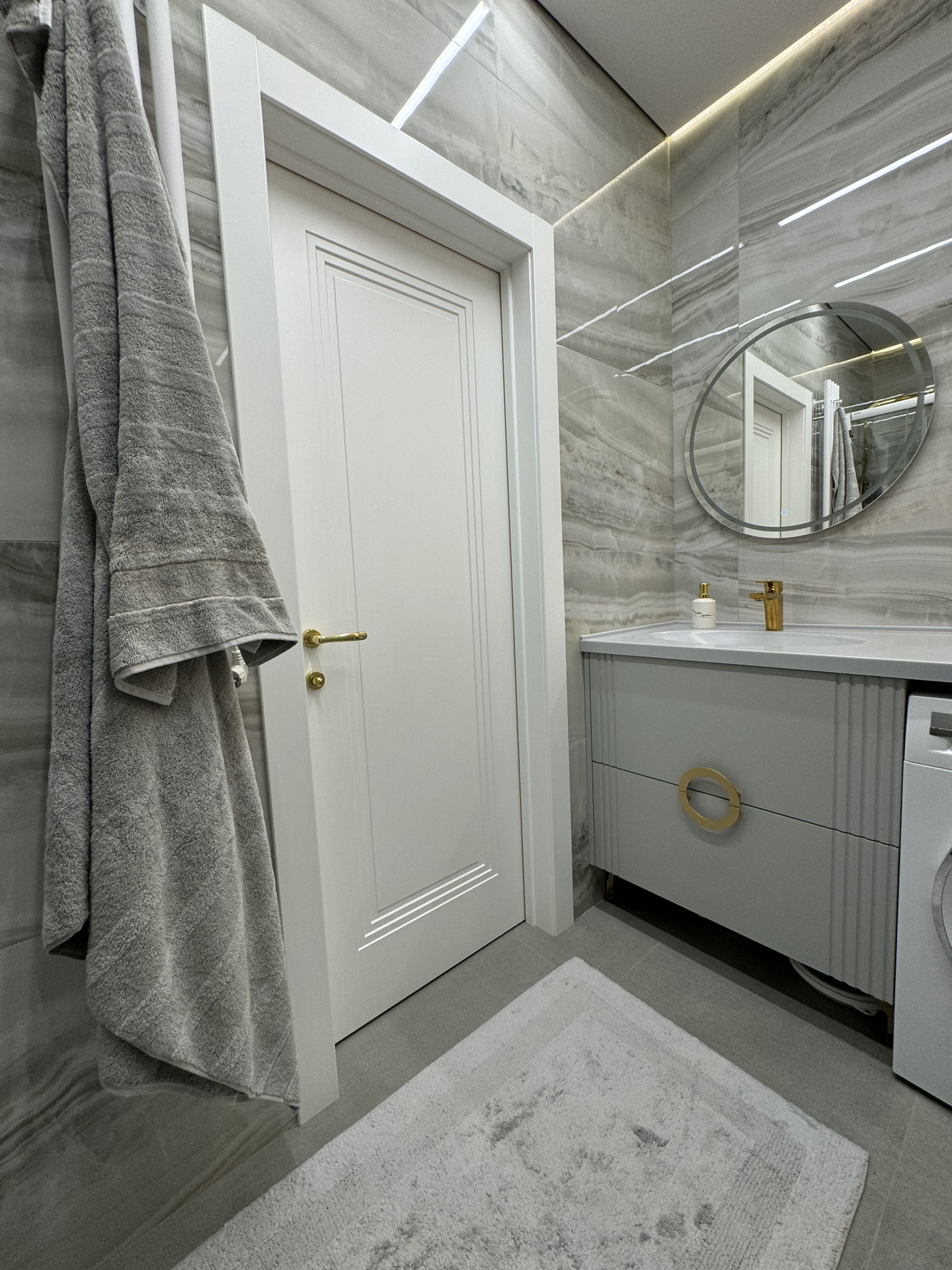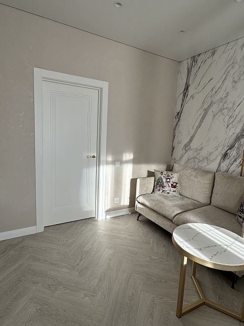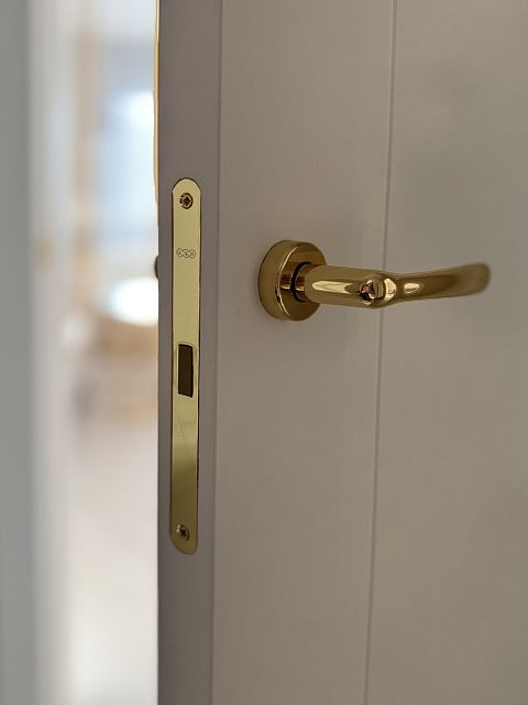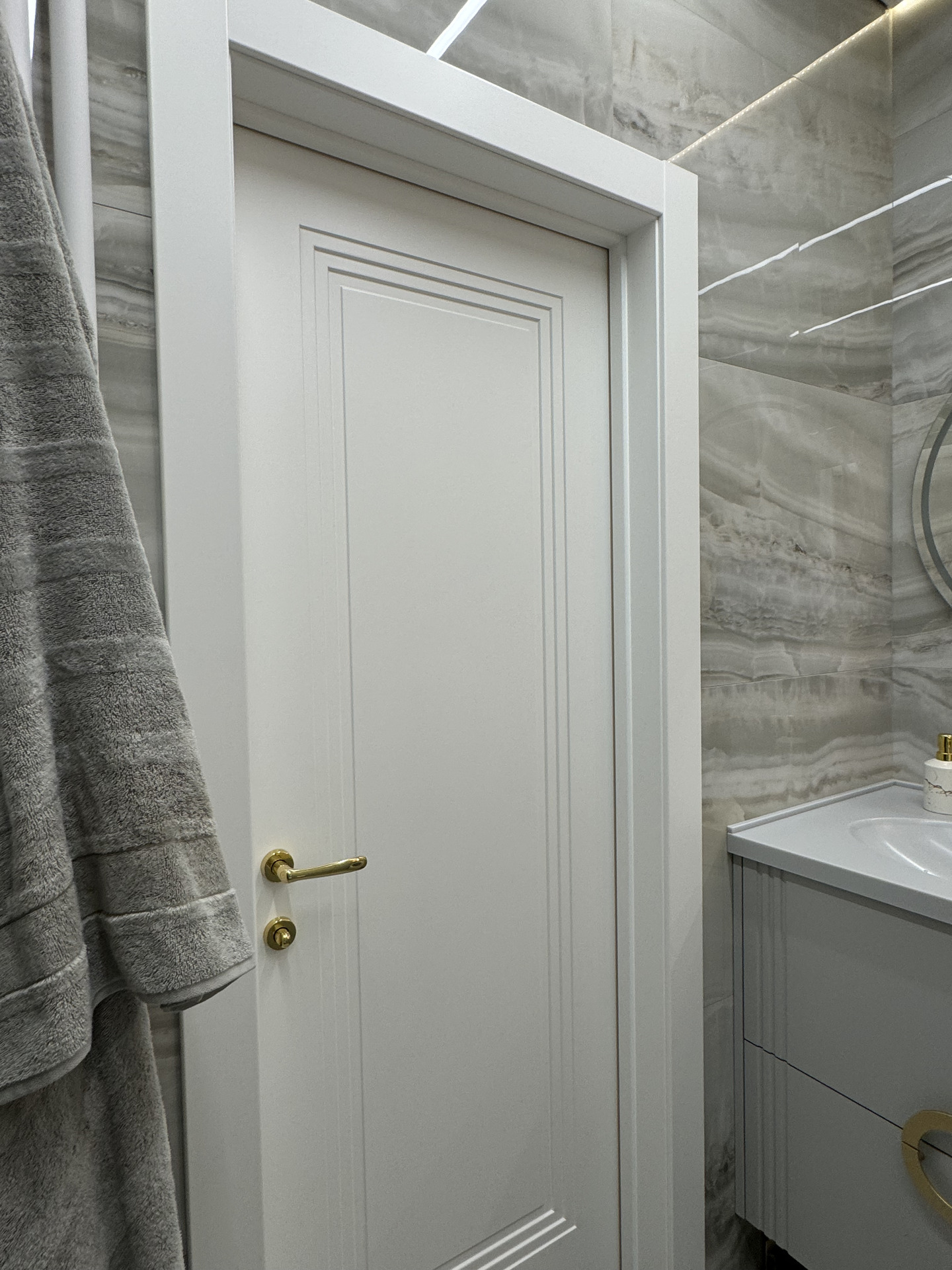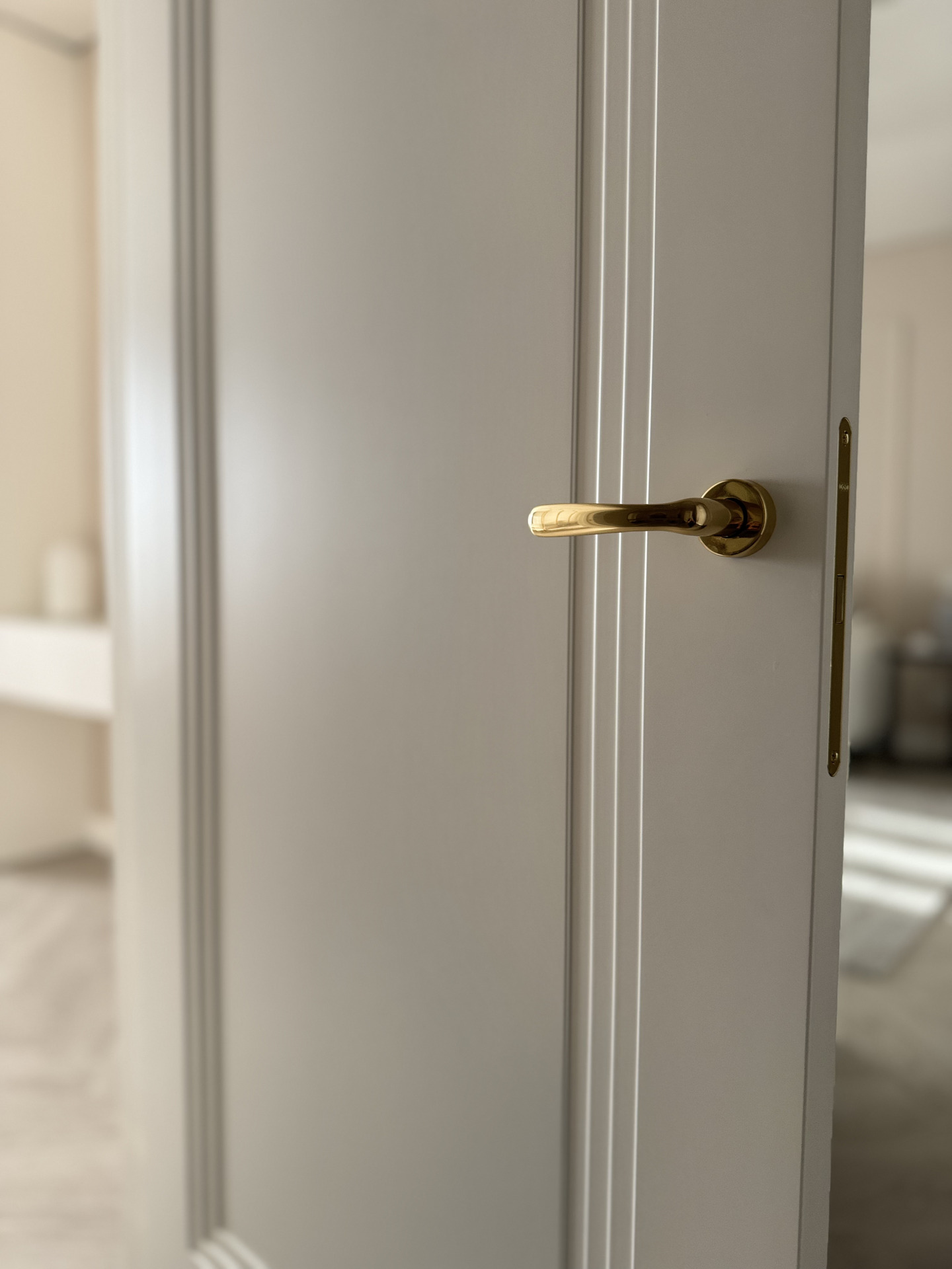 В этом проекте использована трендовая межкомнатная дверь Step 01, обладающая глубокой ступенчатой фрезеровкой. Дверь выполнена в популярном покрытии белая эмаль, что придает ей современный вид. Золотые скрытые петли и ручки подчеркивают стильный подход к деталям, делая каждую деталь гармоничной и уместной в общем дизайне.