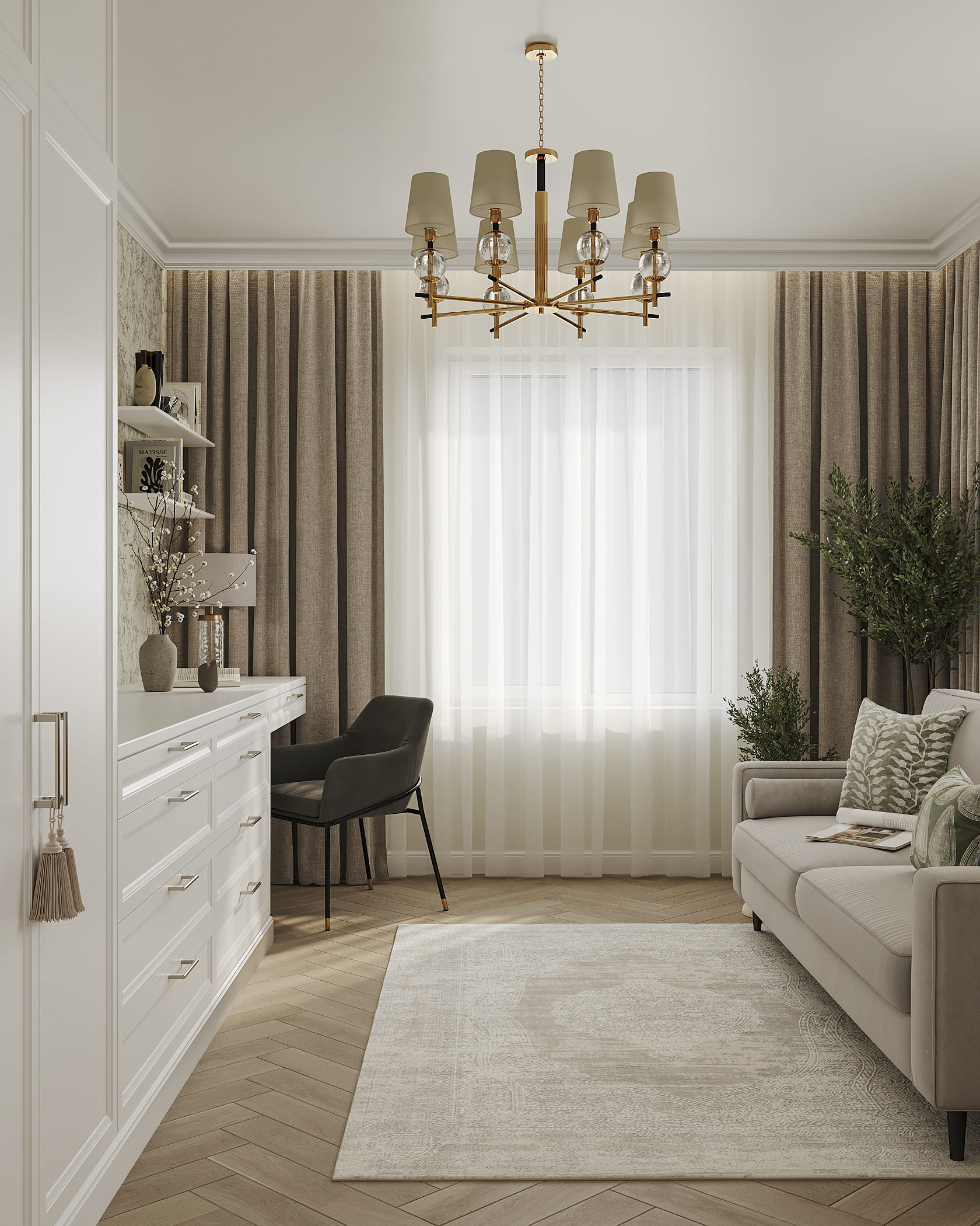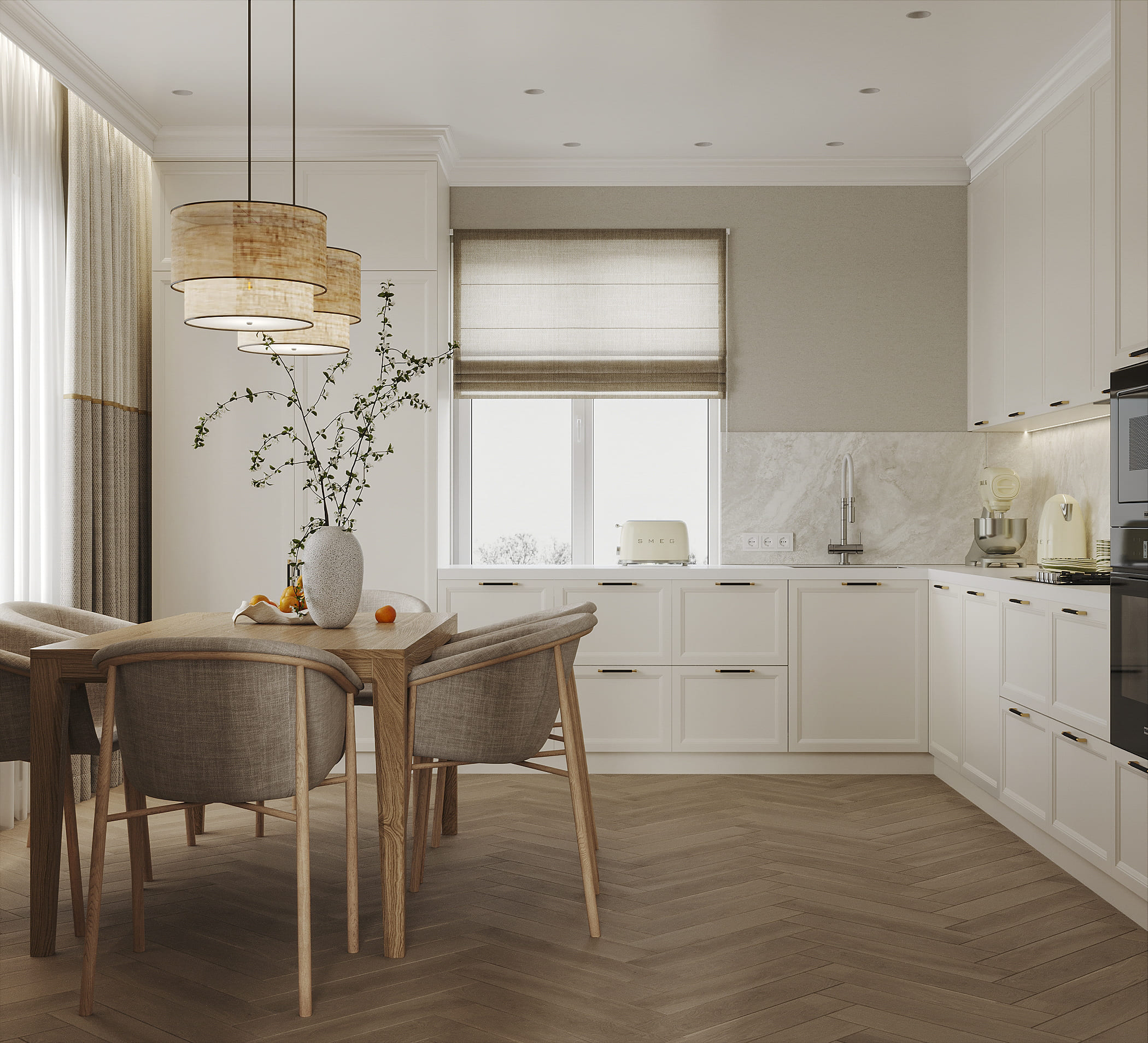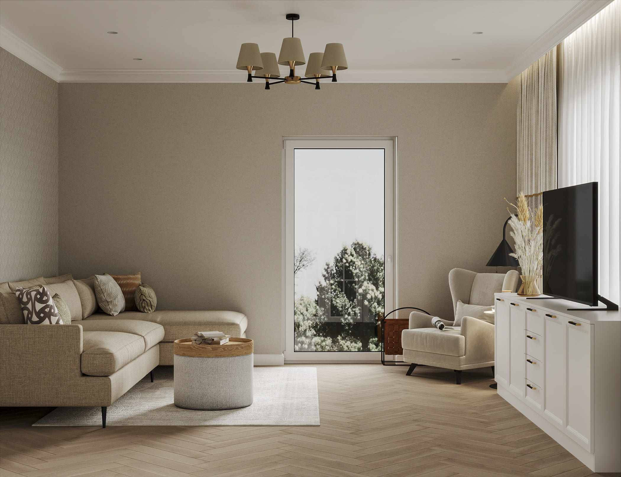 В этом проекте загородного дома особое внимание уделено созданию светлой и уютной атмосферы, используя теплые оттенки белого и бежевого цветов. Основным элементом, который подчеркивает стиль и изящество интерьера, стала межкомнатная дверь Stripe 1, выполненная в покрытии белая эмаль.
