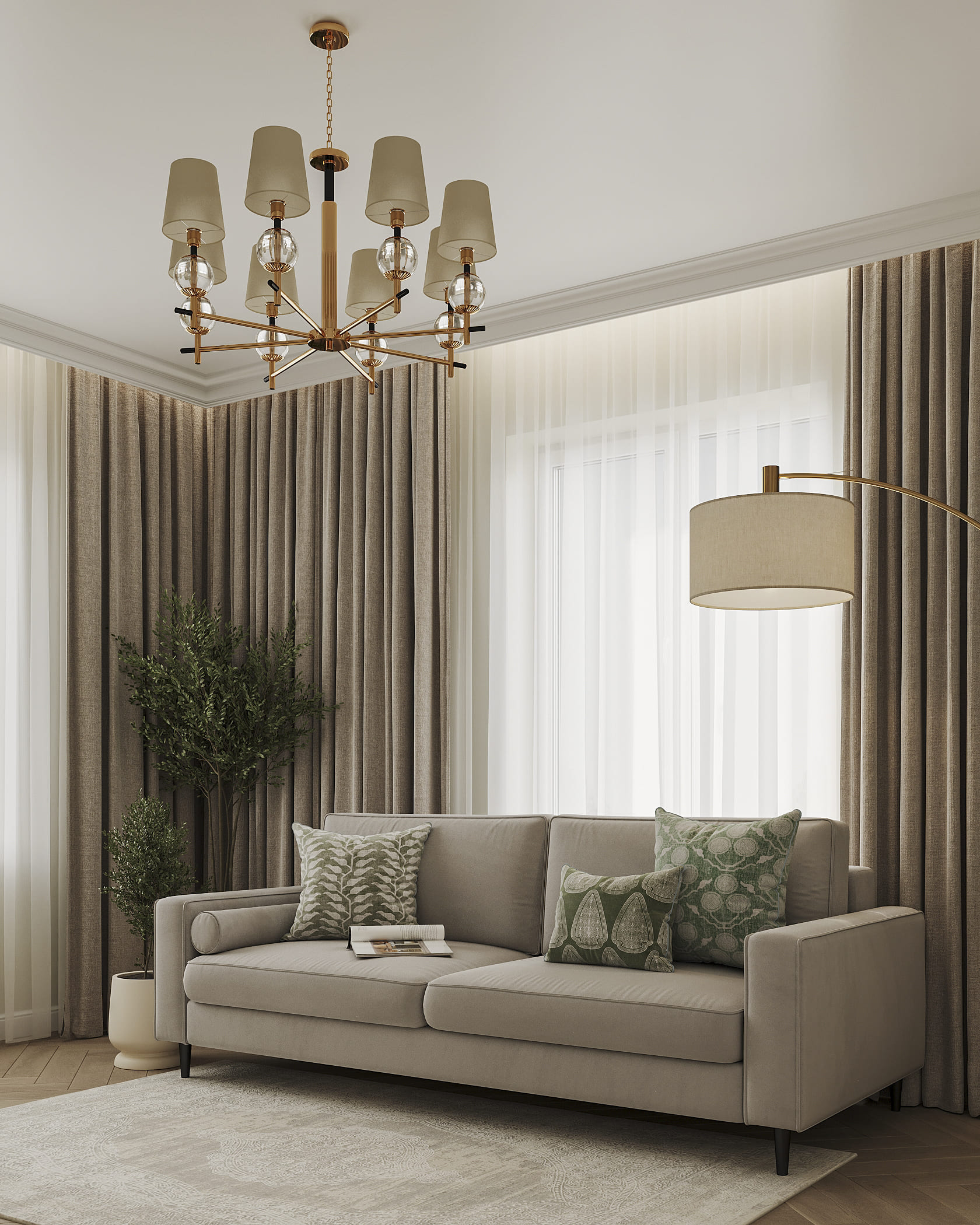 Интерьер наполнен светом благодаря большим окнам, которые открывают вид на природу. Такой проект стал идеальным примером того, как современные решения могут сочетаться с теплотой и комфортом загородной жизни.