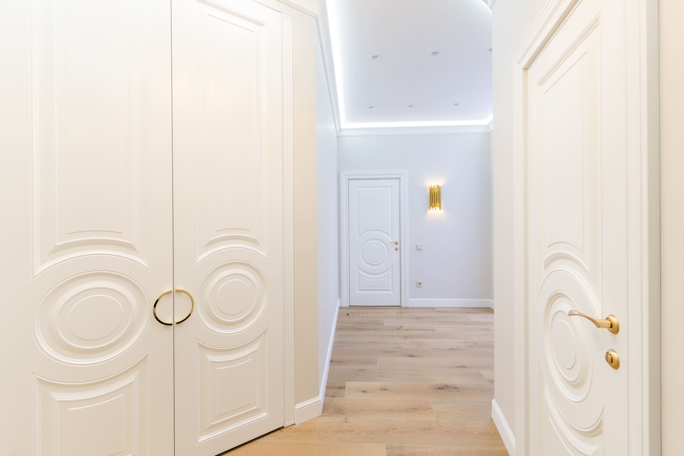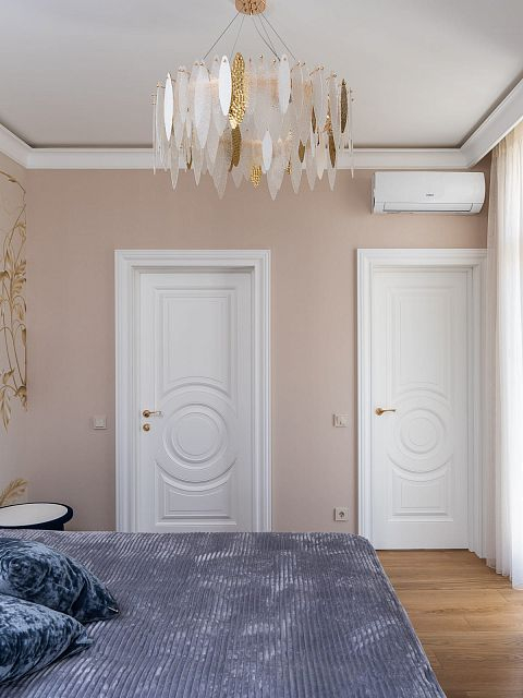 Для оформления дверных проемов они выбрали белоснежные Bergamo6, с модной многоярусной фрезеровкой. Кстати, хозяевам так понравился дизайн полотен, что и двери для входа в гардеробную они индивидуально заказывали с таким же рисунком.