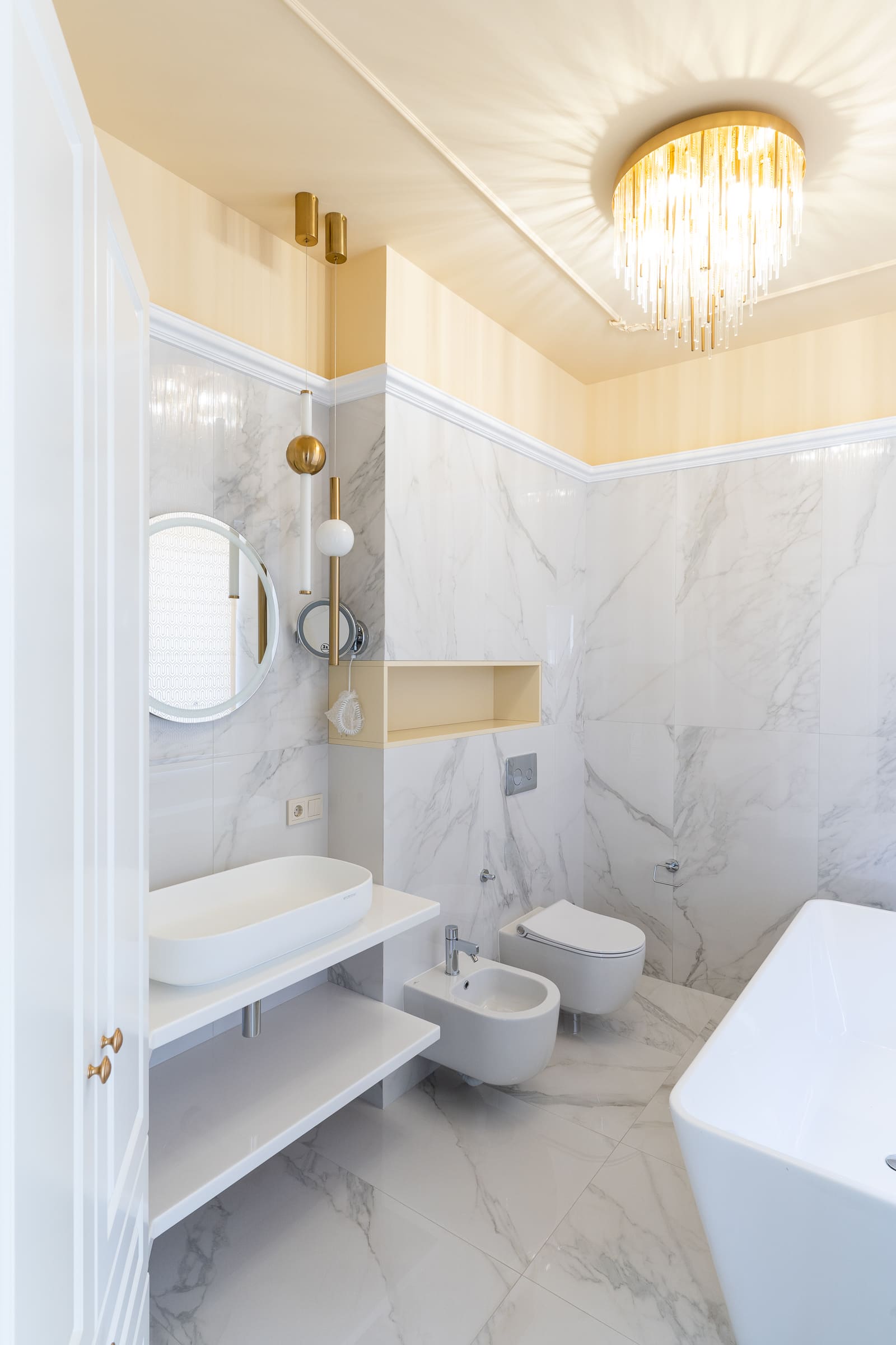 Остальные детали интерьера под стать: обои ручной работы с золотыми узорами, дизайнерские светильники и мебель.