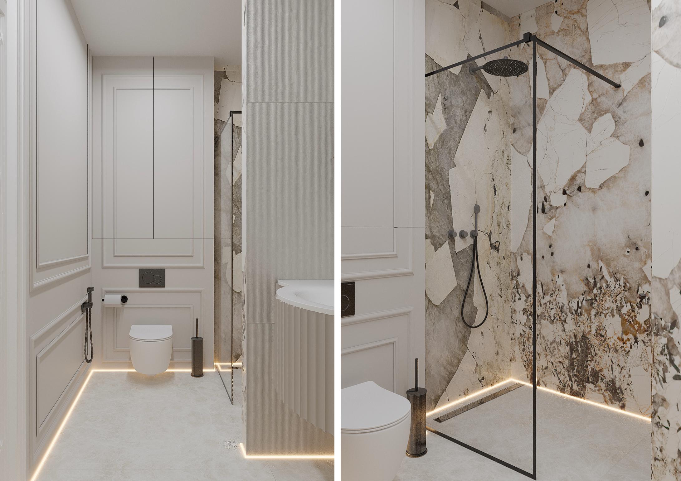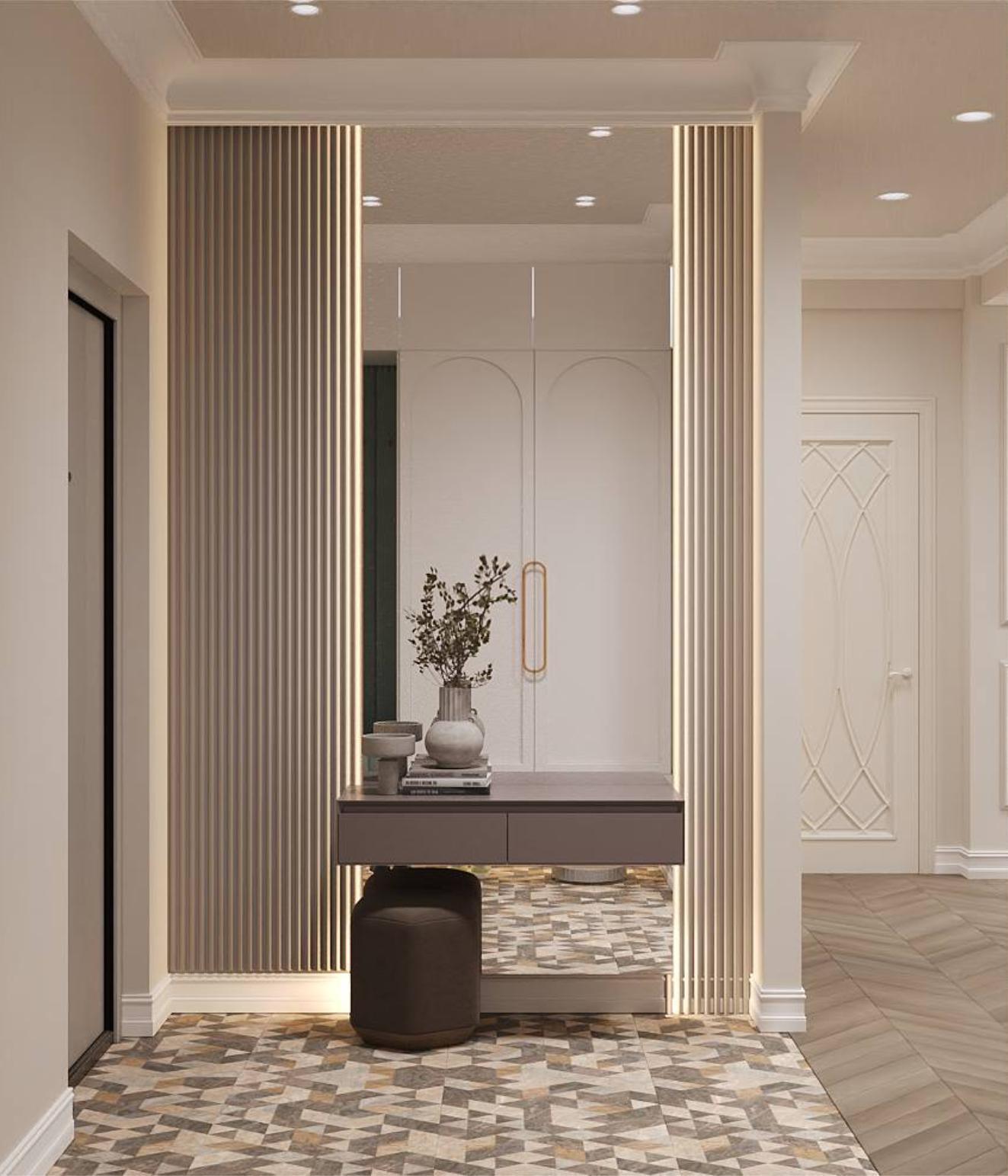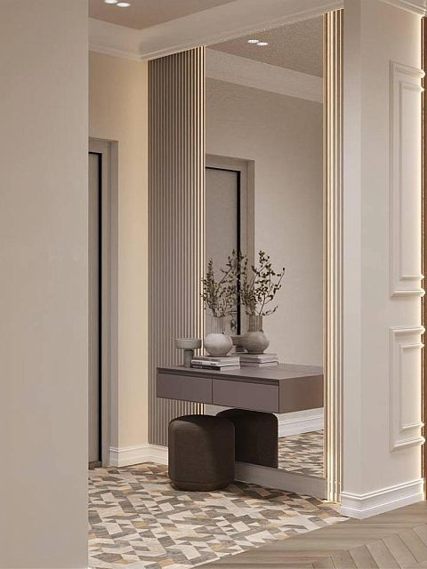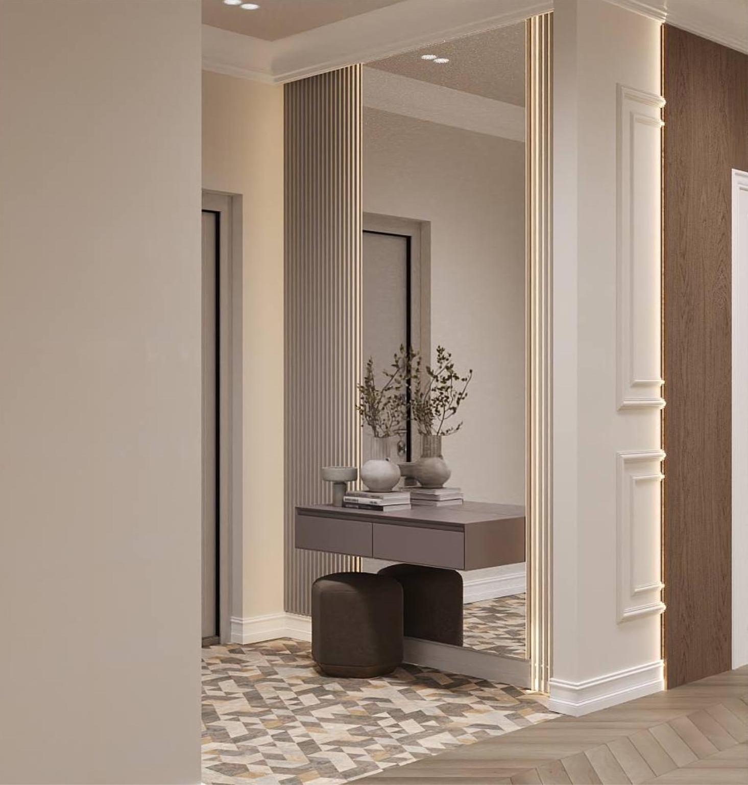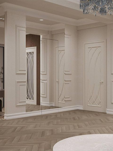 Особое внимание было уделено напольному покрытию и дверям, так как это является основой дизайн проекта, на фоне которого играют все декоративные элементы.