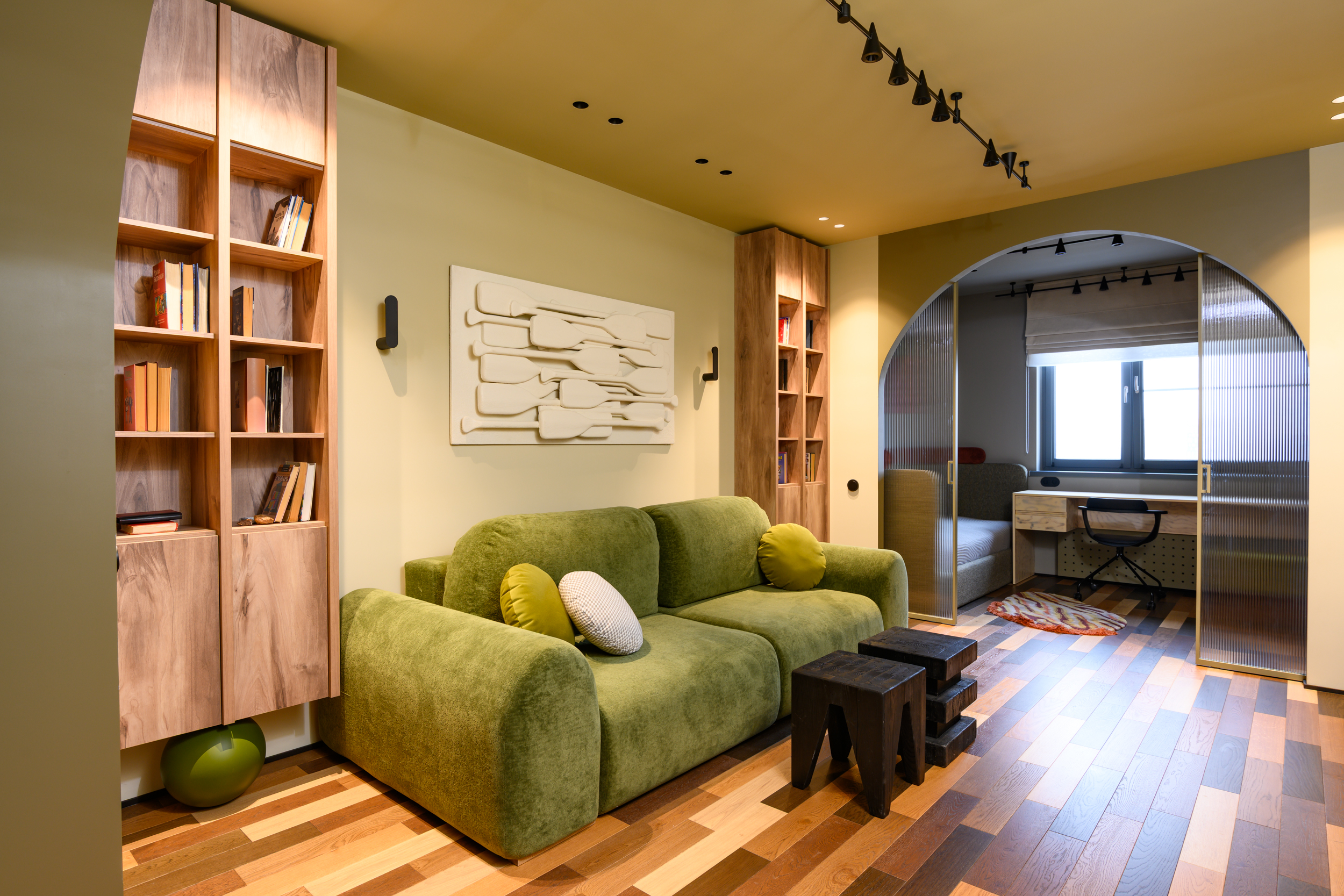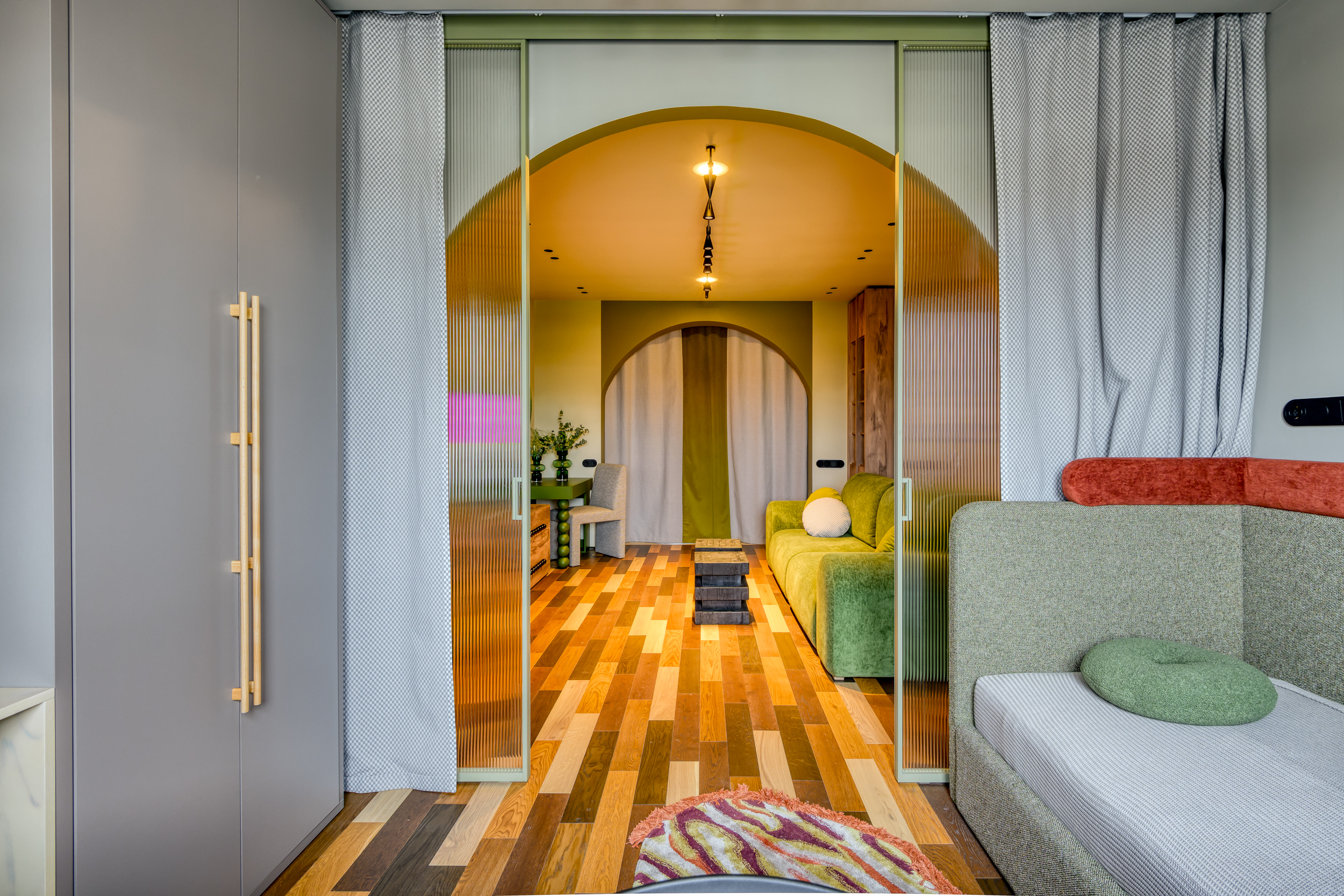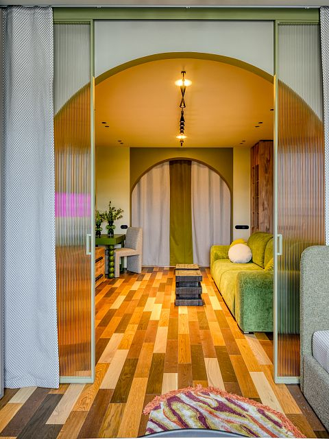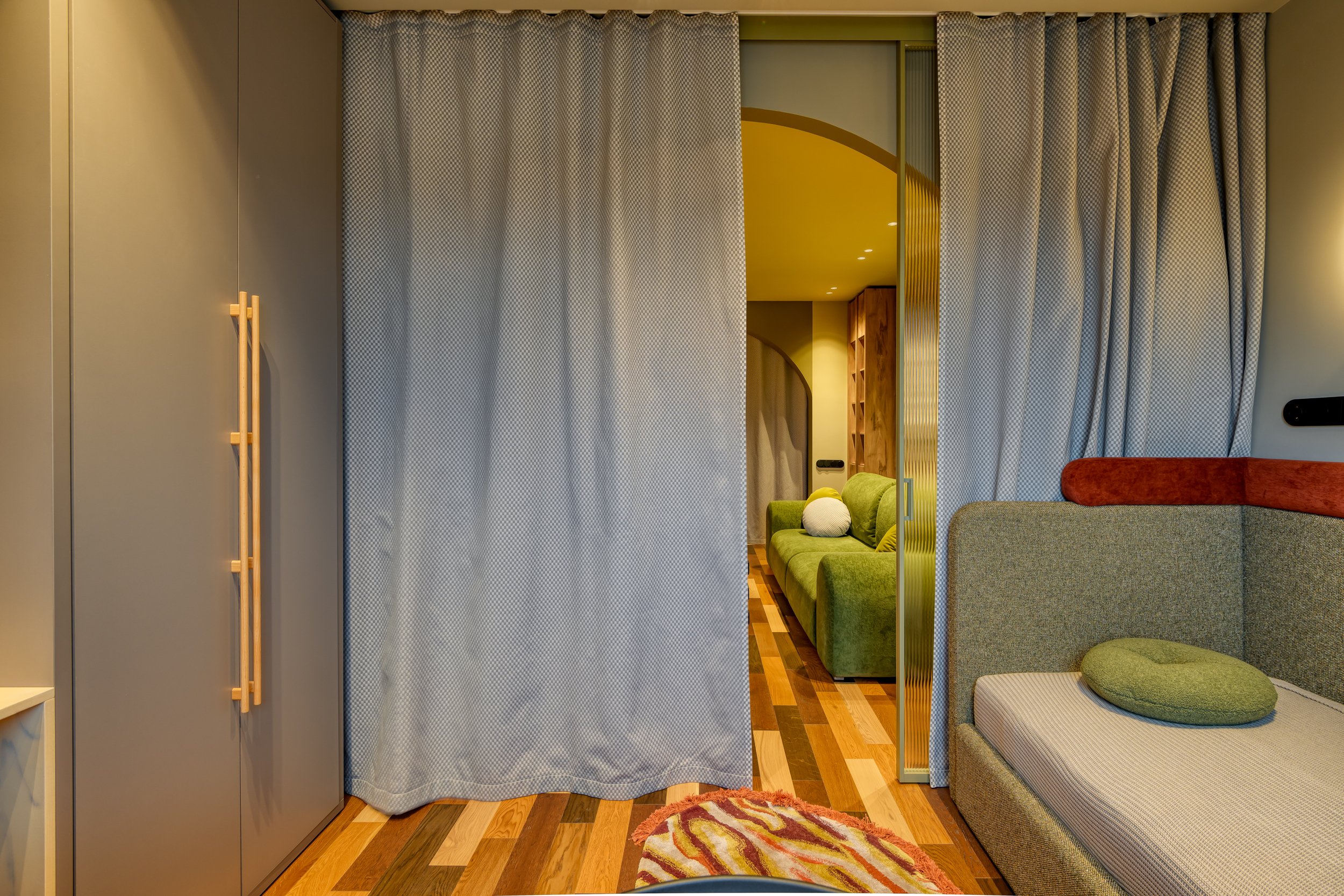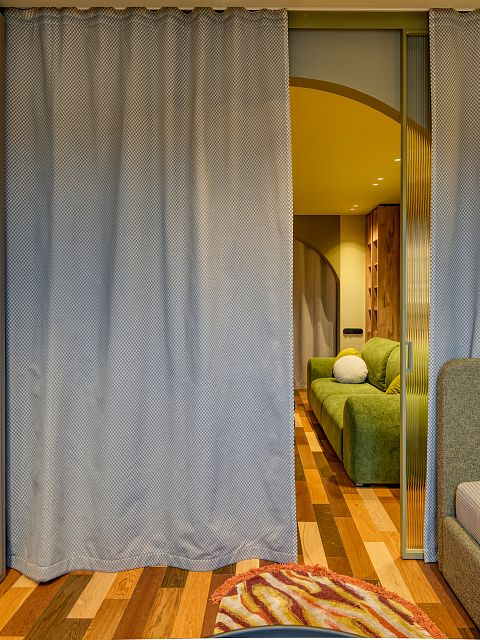 В проекте реализовано разделение 24‑метрового помещения на две функциональные зоны: гостиную и комнату подростка. Для обеспечения приватности установлена раздвижная перегородка «Meta» производства ульяновской фабрики «Терем».