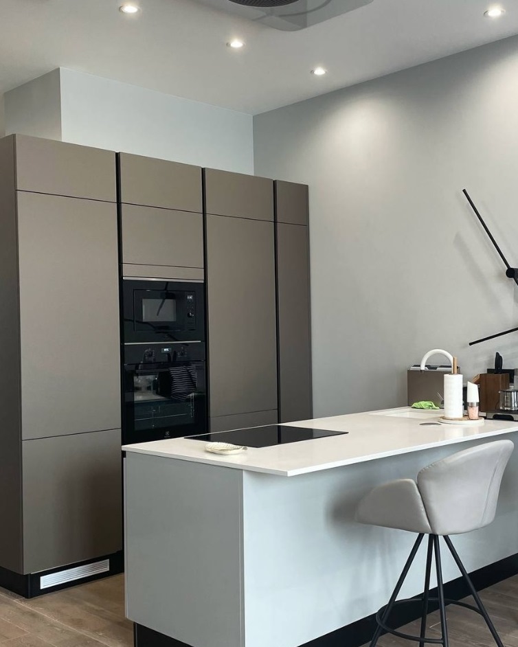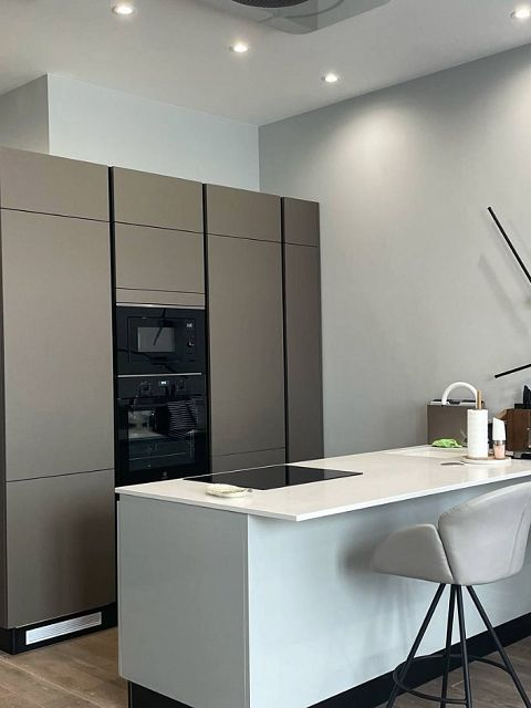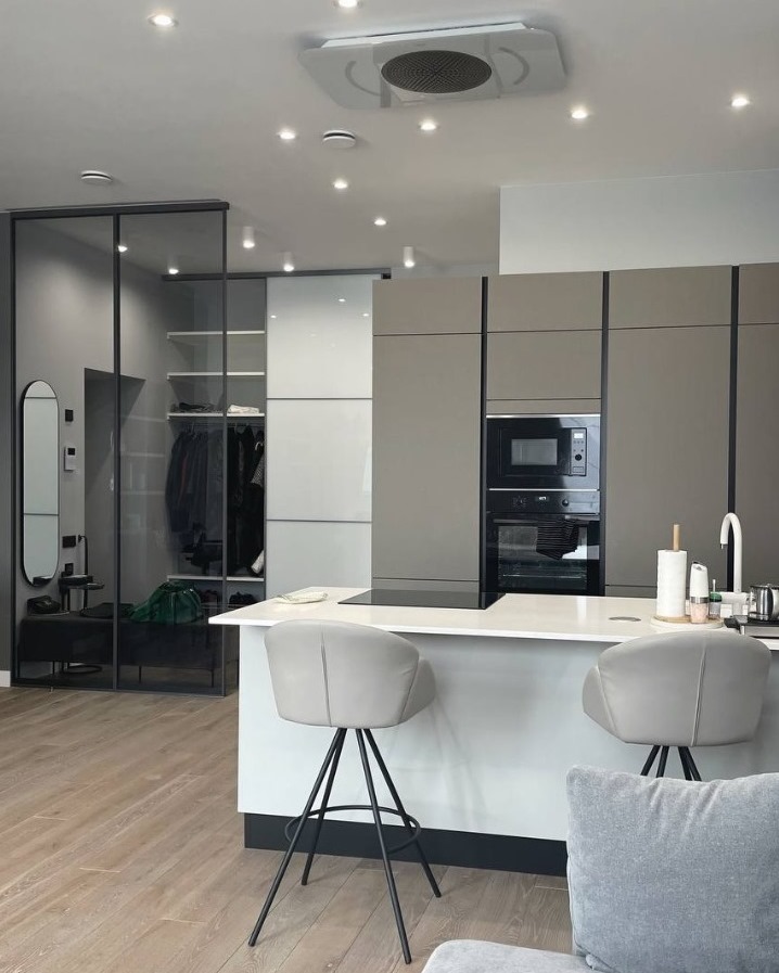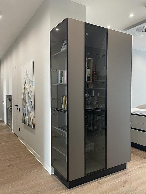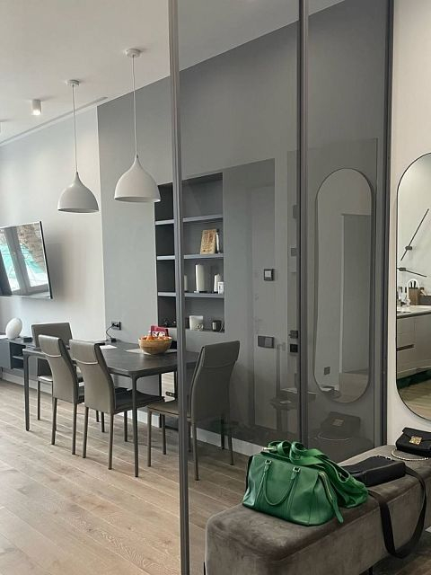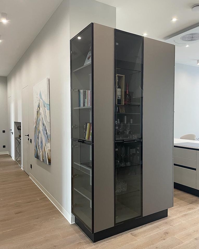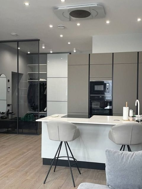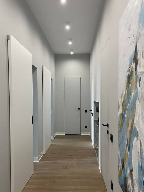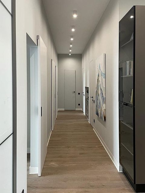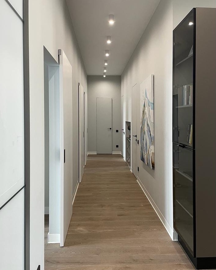 Наилучшим образом в интерьер вписались очень популярные двери нашей фабрики - Porte из коллекции Techno. Несколько дверей смонтировали в скрытом коробе и покрыли эмалью в цвет стен. Другие установили на откатную систему открывания INVISIBLE и оставили белыми. Кстати, очень стильно смотрятся контрастные черные ручки.
