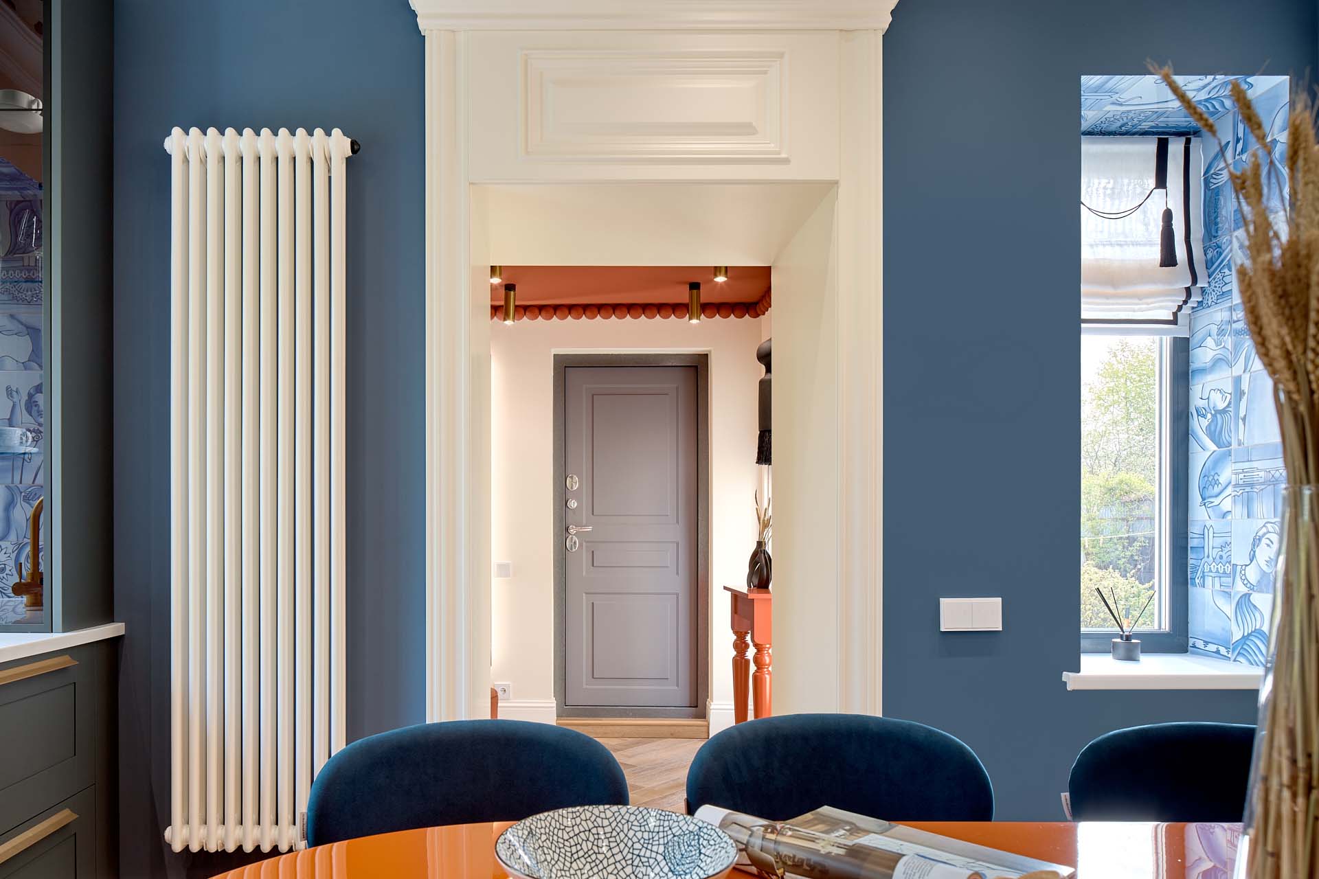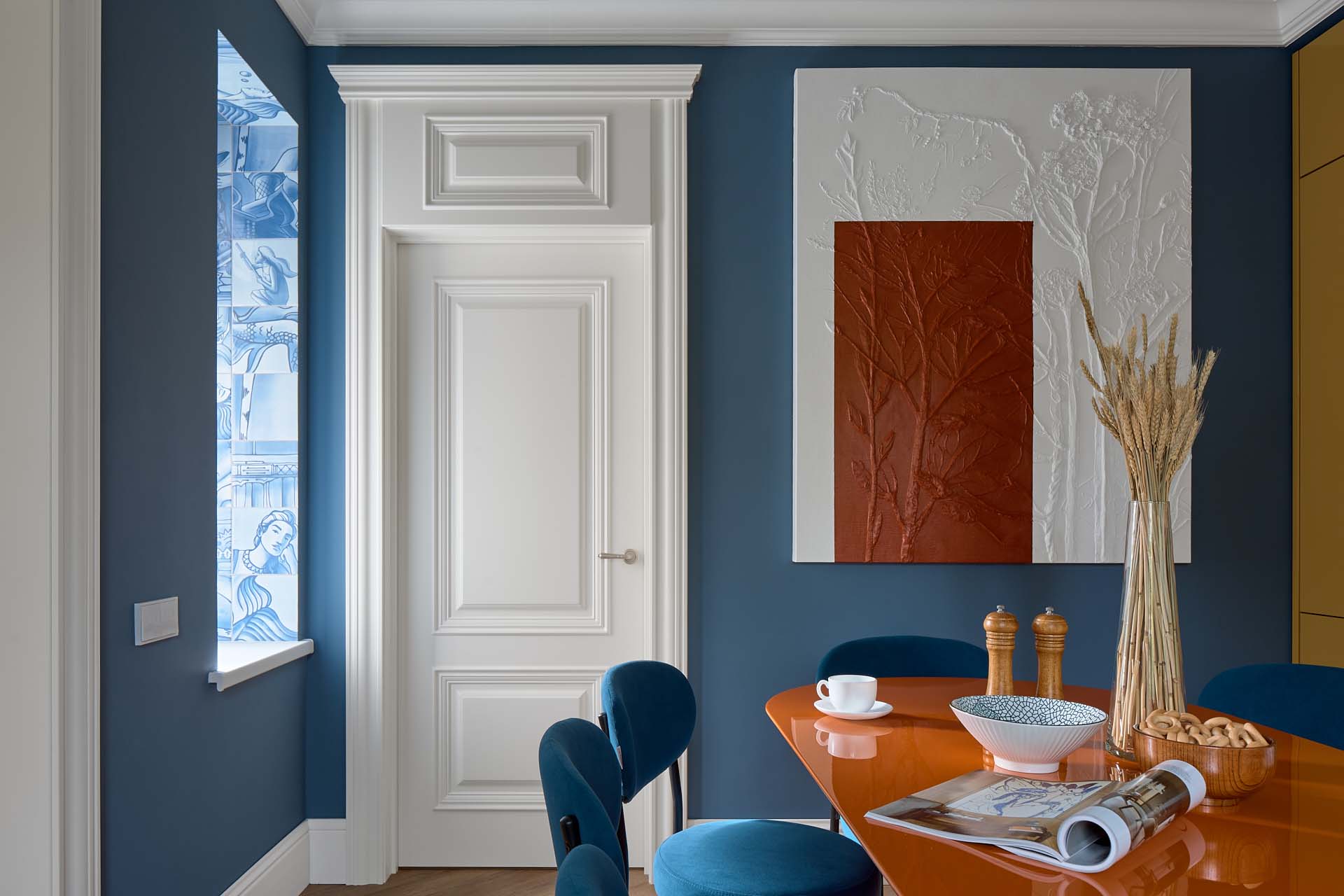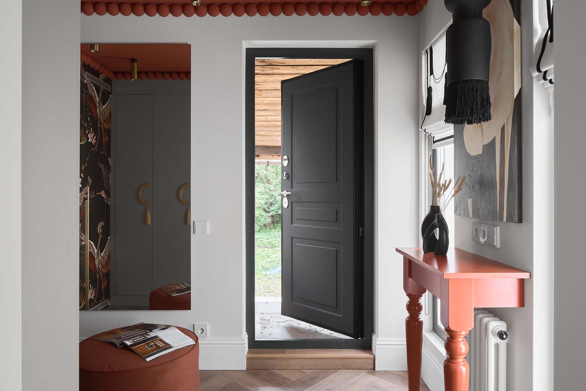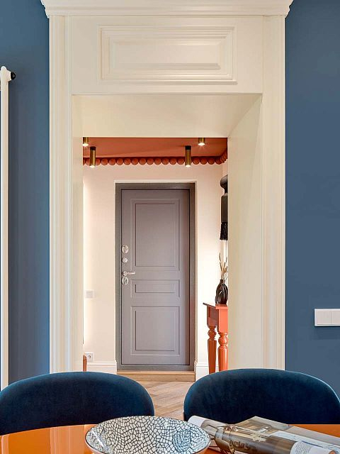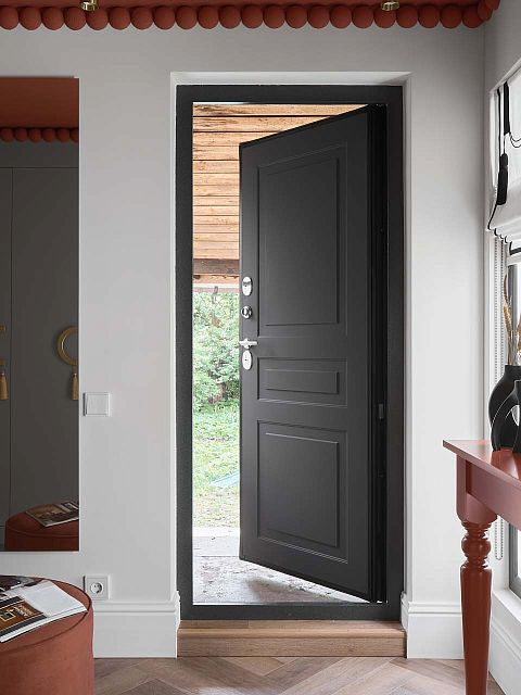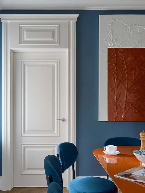 Фабрика «Терем» представила багетную дверь Palermo Полотно с рельефной фрезеровкой закрепили на золотистые петли. Покрыто полотно эмалью и дополнено акцентной ручкой. Для большей выразительности и гармоничности дверной проем оформили фигурными наличниками и фальшь-фрамугой. И такими же элементами украсили портал из прихожей в кухню.
