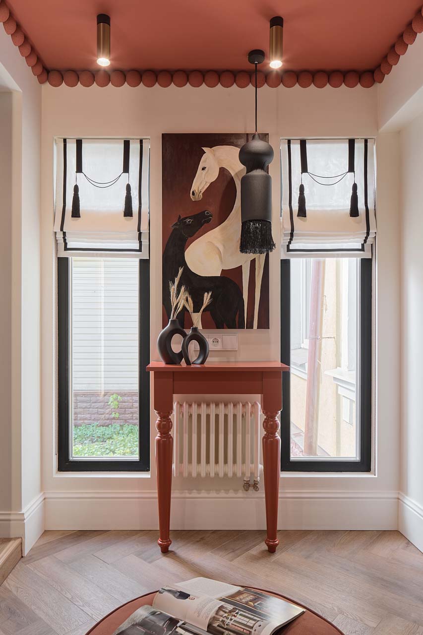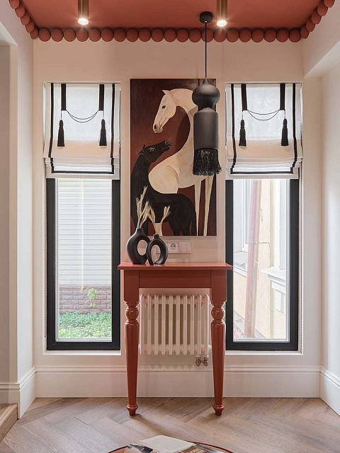 Прихожая оформлена в русском стиле, где терракотовый потолок и красная консоль с яркой картиной создают атмосферу уюта и тепла. Открытая кухня с Г-образным гарнитуром и природными мотивами на потолке вдохновляет на кулинарное творчество. Элементы декора, такие как лепные карнизы и стеклянные светильники, подчеркивают изысканность и уникальность интерьера, делая его идеальным решением для многодетной семьи.