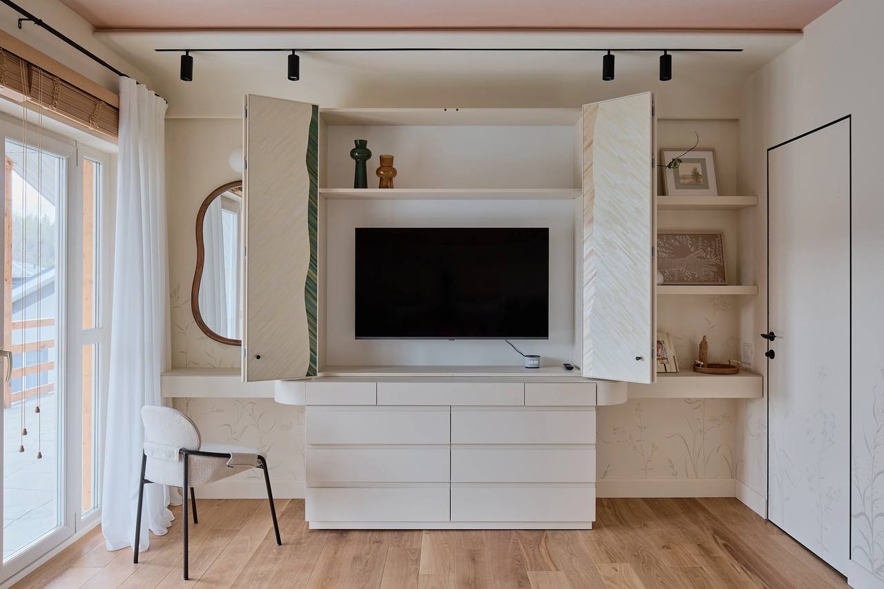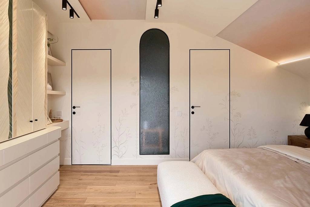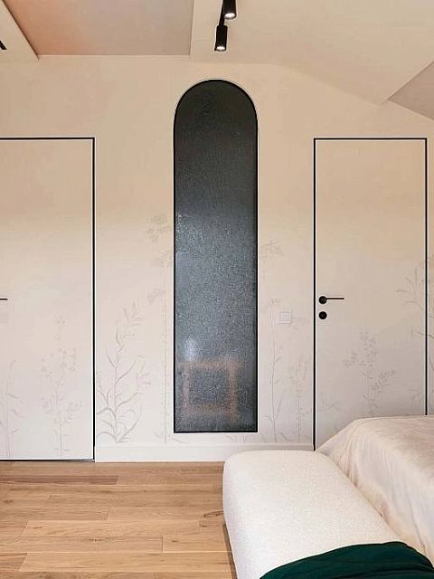 В создании уютного интерьера активно участвовала фабрика «Терем», установив двери модели Secret. Их система скрытого короба позволяет вписать полотна в единую плоскость со стеной без наличников, что придает интерьеру современный вид. Алюминиевая кромка защищает торцы дверей, а незаметные скрытые петли обеспечивают функциональность и эстетику.
