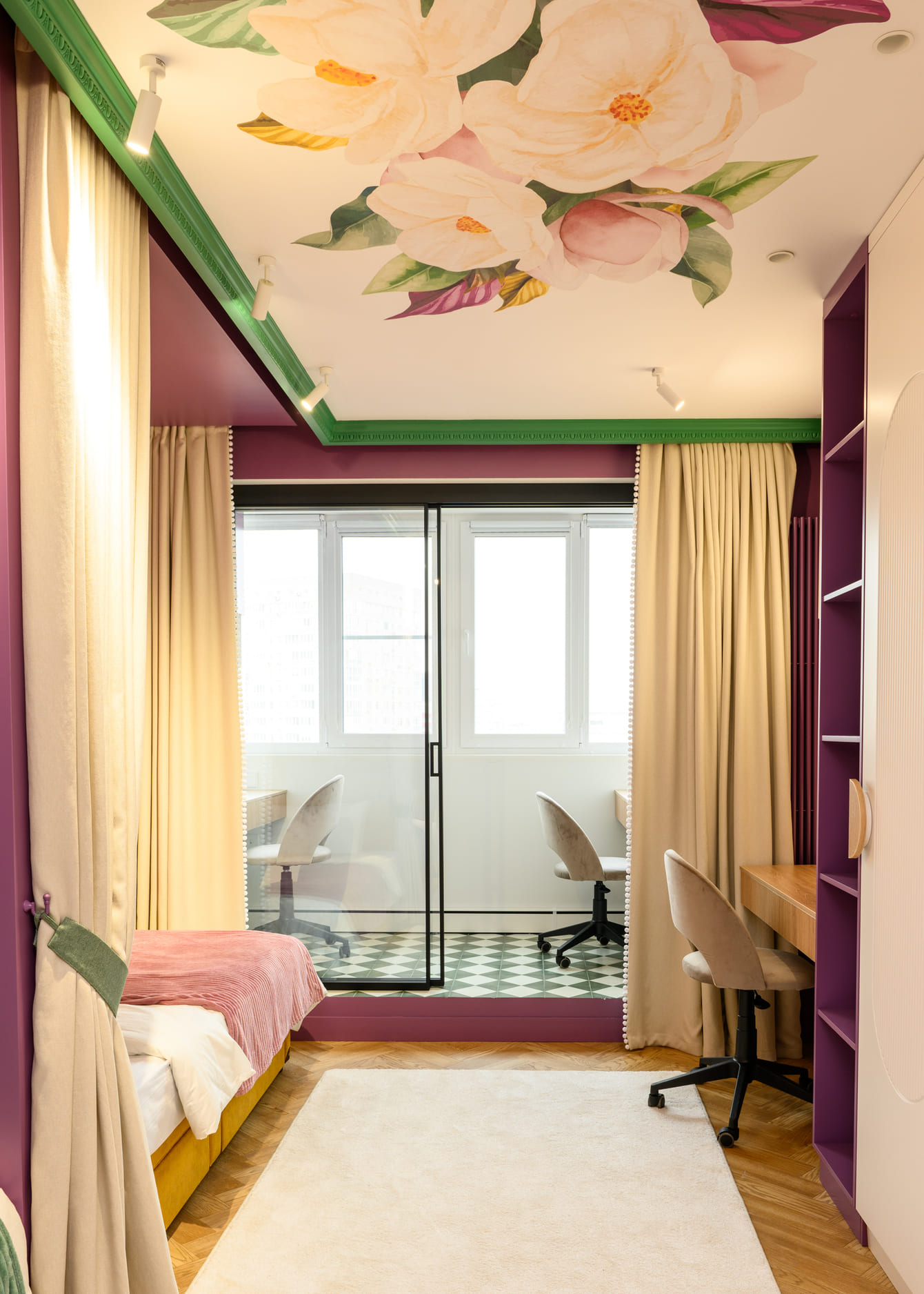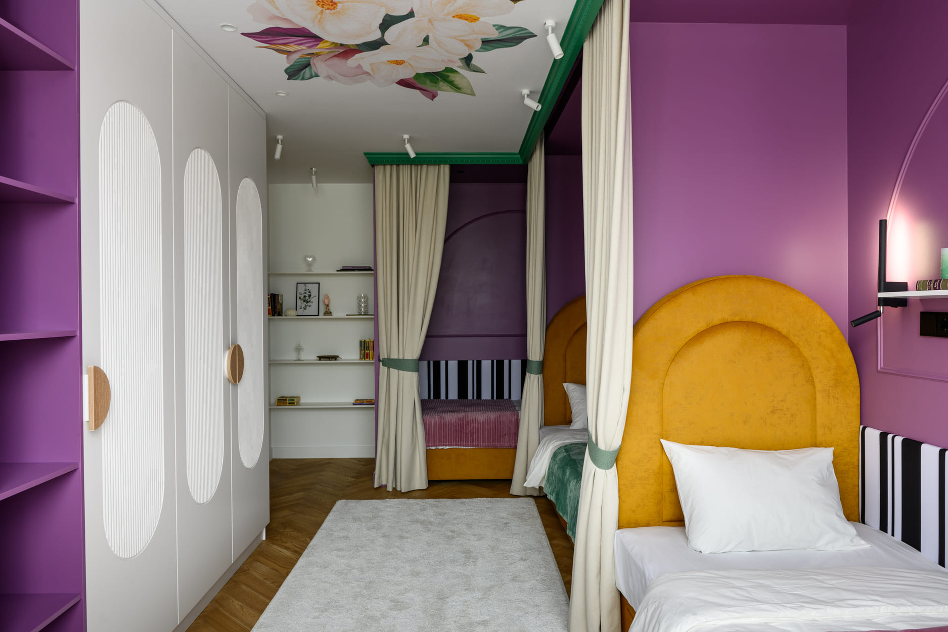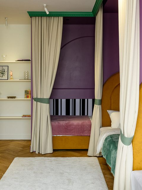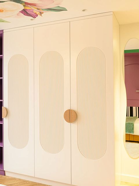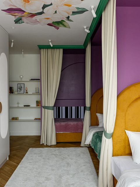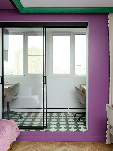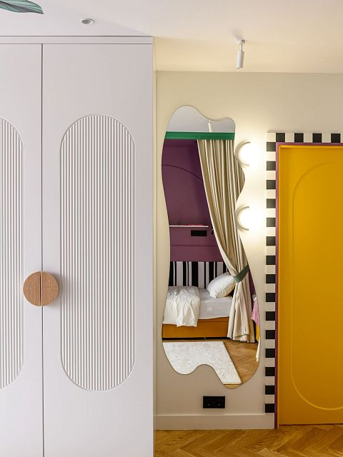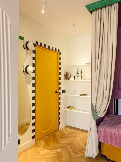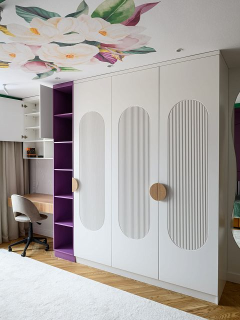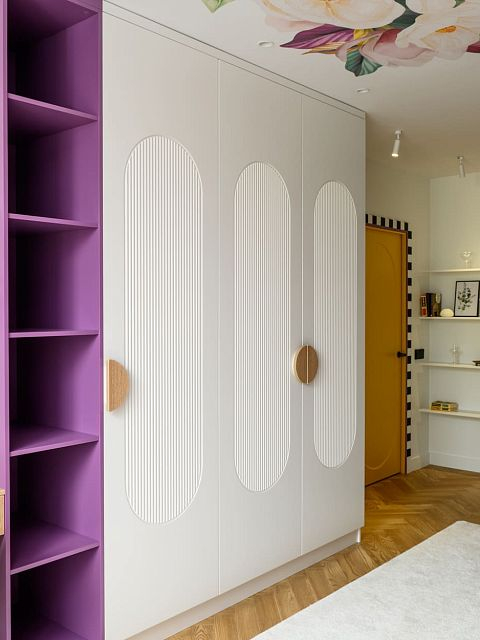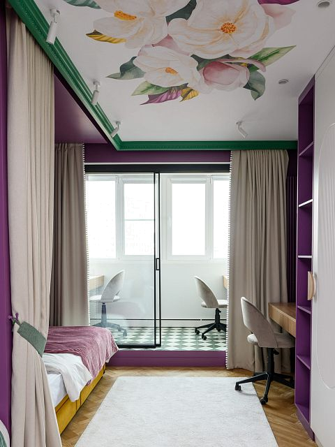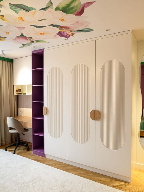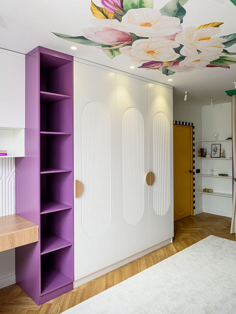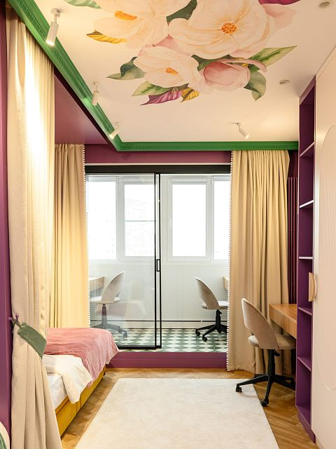 В этом проекте было принято смелое решение: вместо трех отдельных кроватей в детской были созданы три отдельные комнаты, где каждая из сестер сможет найти уединение. Был убран оконно-балконный блок, что позволило получить 23 квадратных метра вместе с лоджией. Простенок между пространствами был демонтирован, а получившийся проем немного уменьшили.