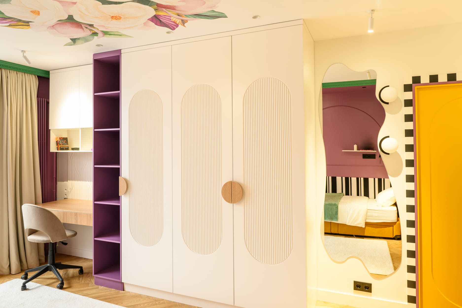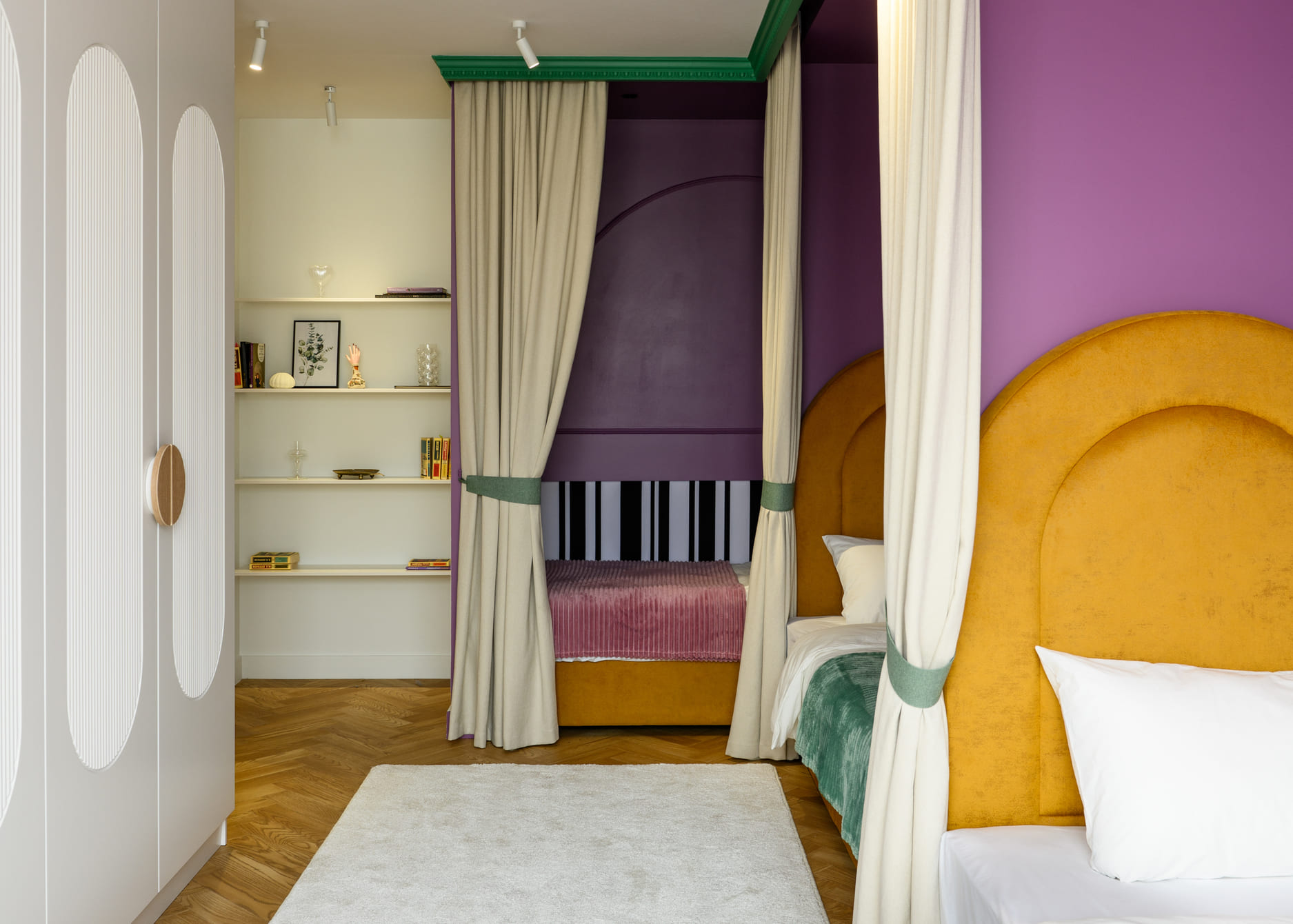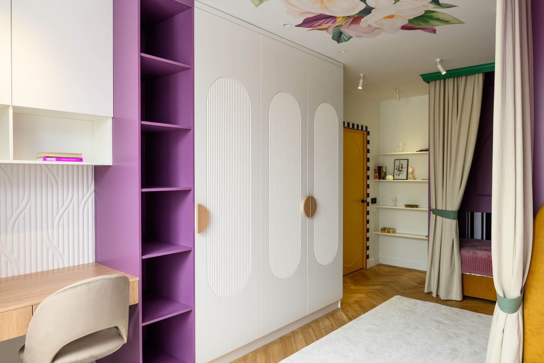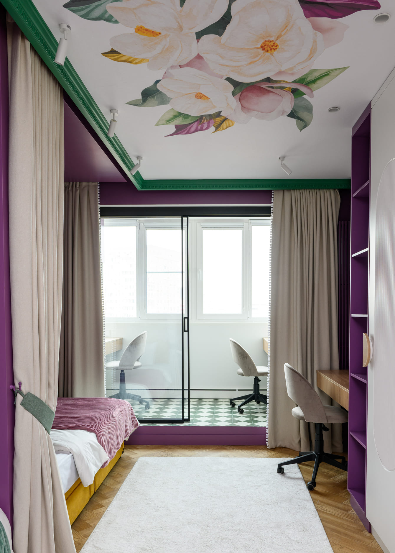 В этом проекте было принято смелое решение: вместо трех отдельных кроватей в детской были созданы три отдельные комнаты, где каждая из сестер сможет найти уединение. Был убран оконно-балконный блок, что позволило получить 23 квадратных метра вместе с лоджией. Простенок между пространствами был демонтирован, а получившийся проем немного уменьшили.