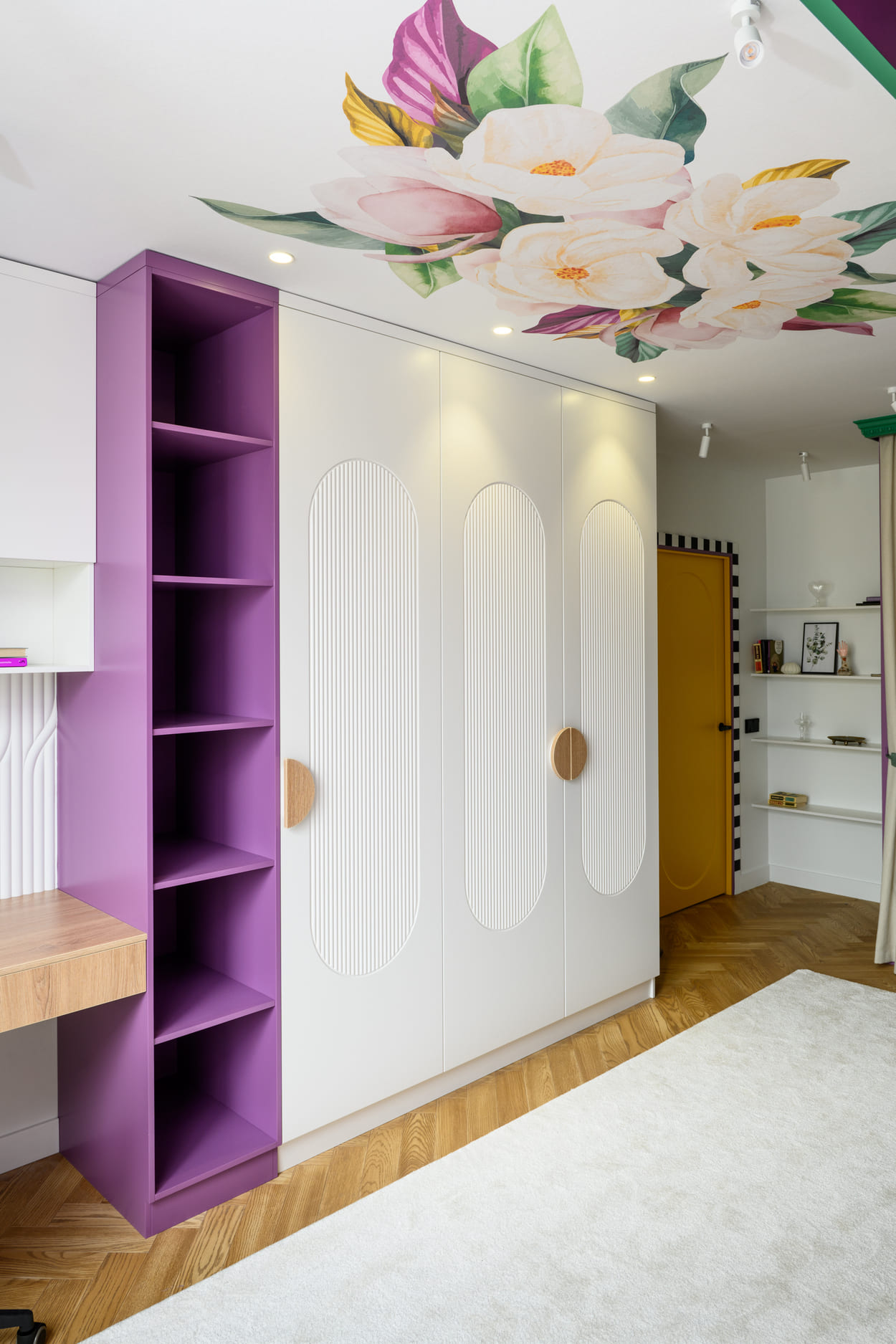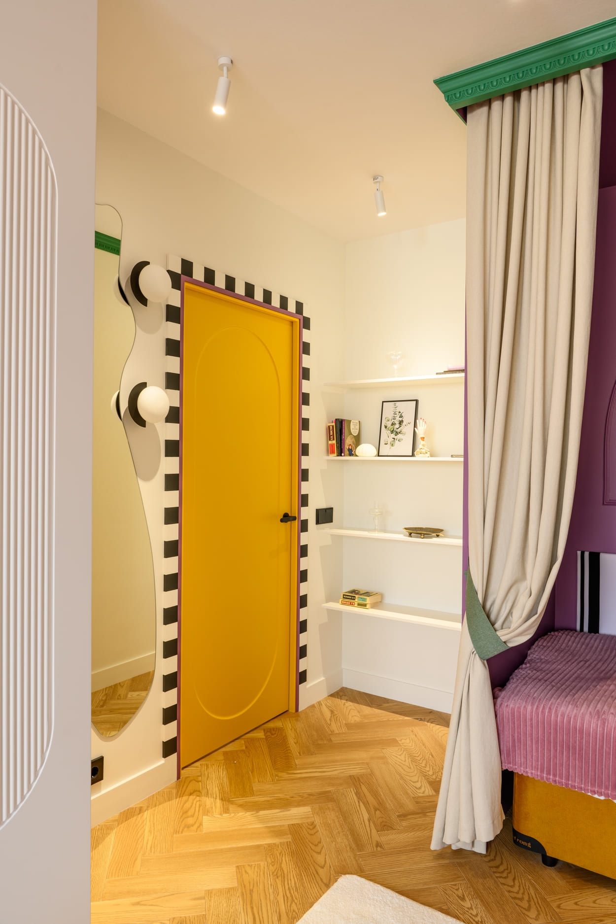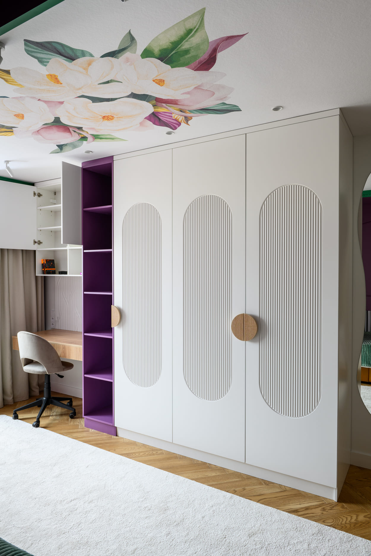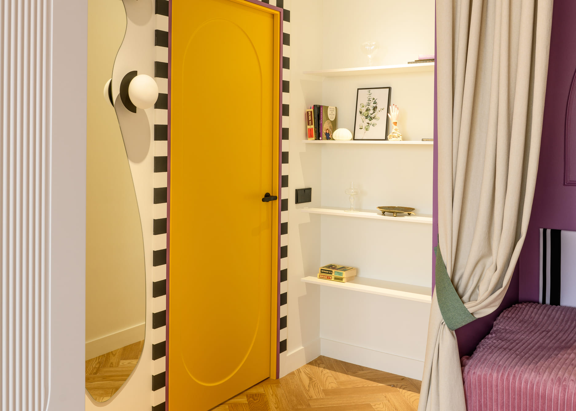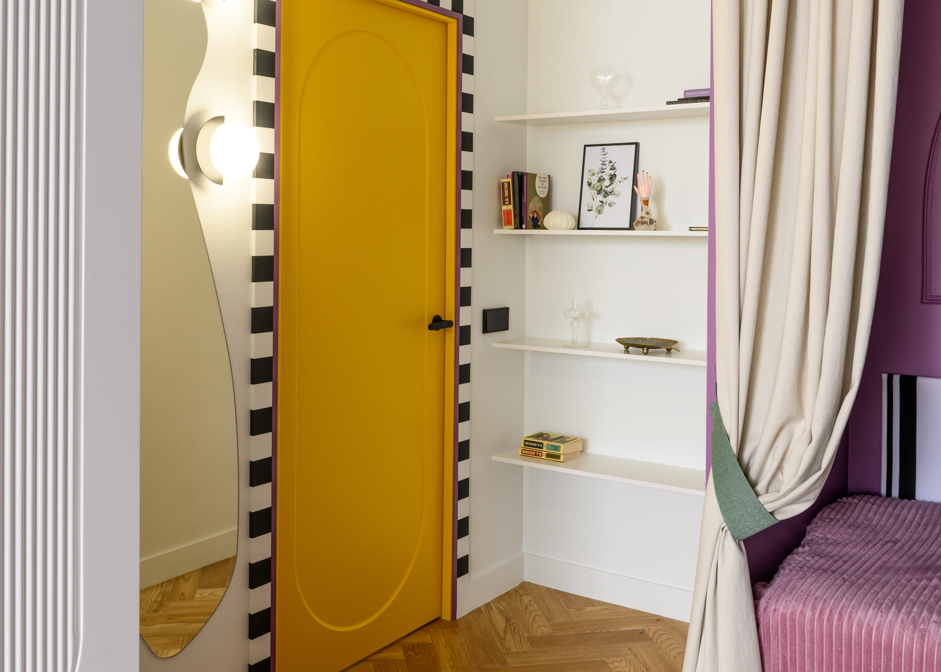 В этом проекте было принято смелое решение: вместо трех отдельных кроватей в детской были созданы три отдельные комнаты, где каждая из сестер сможет найти уединение. Был убран оконно-балконный блок, что позволило получить 23 квадратных метра вместе с лоджией. Простенок между пространствами был демонтирован, а получившийся проем немного уменьшили.