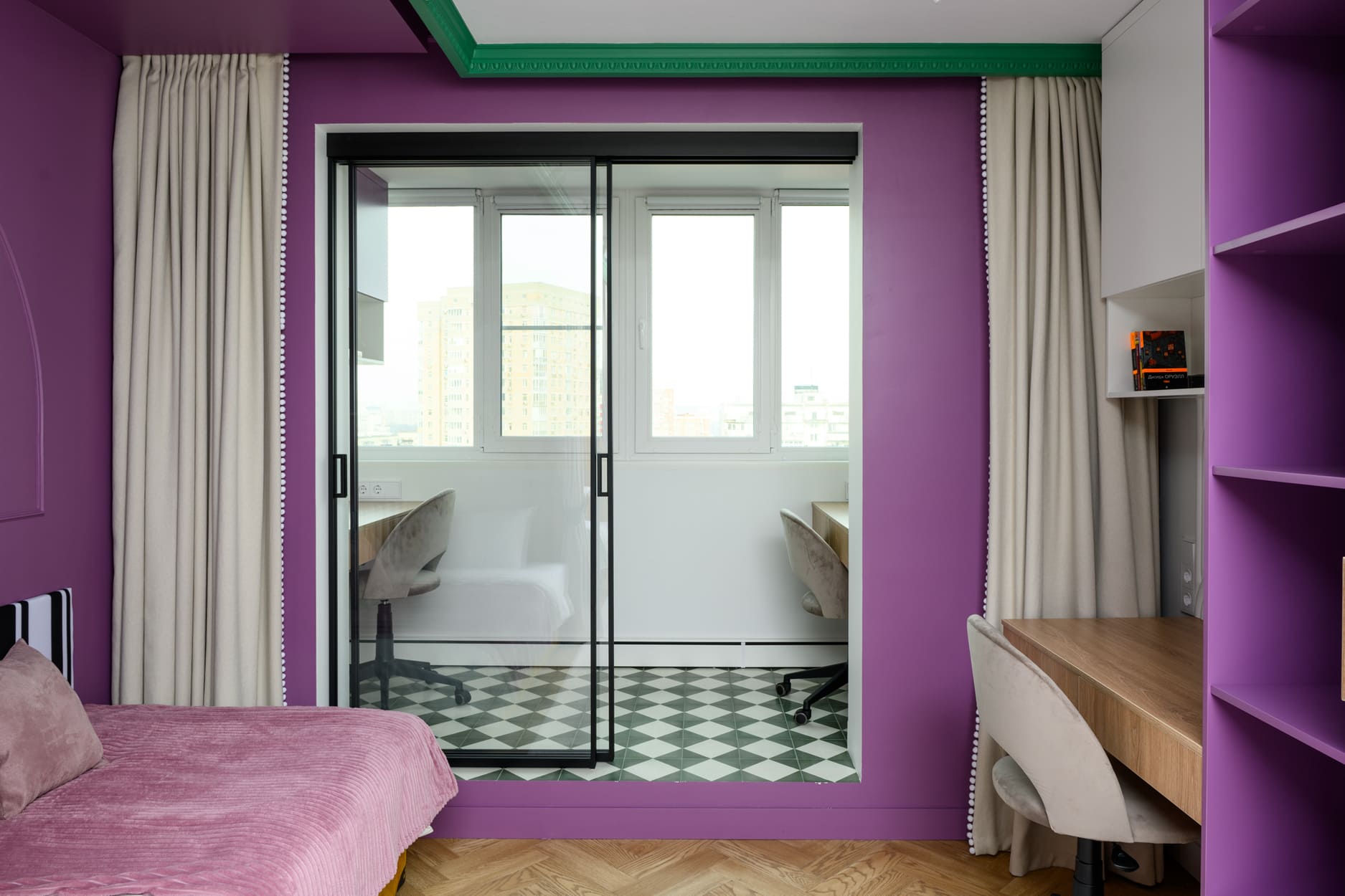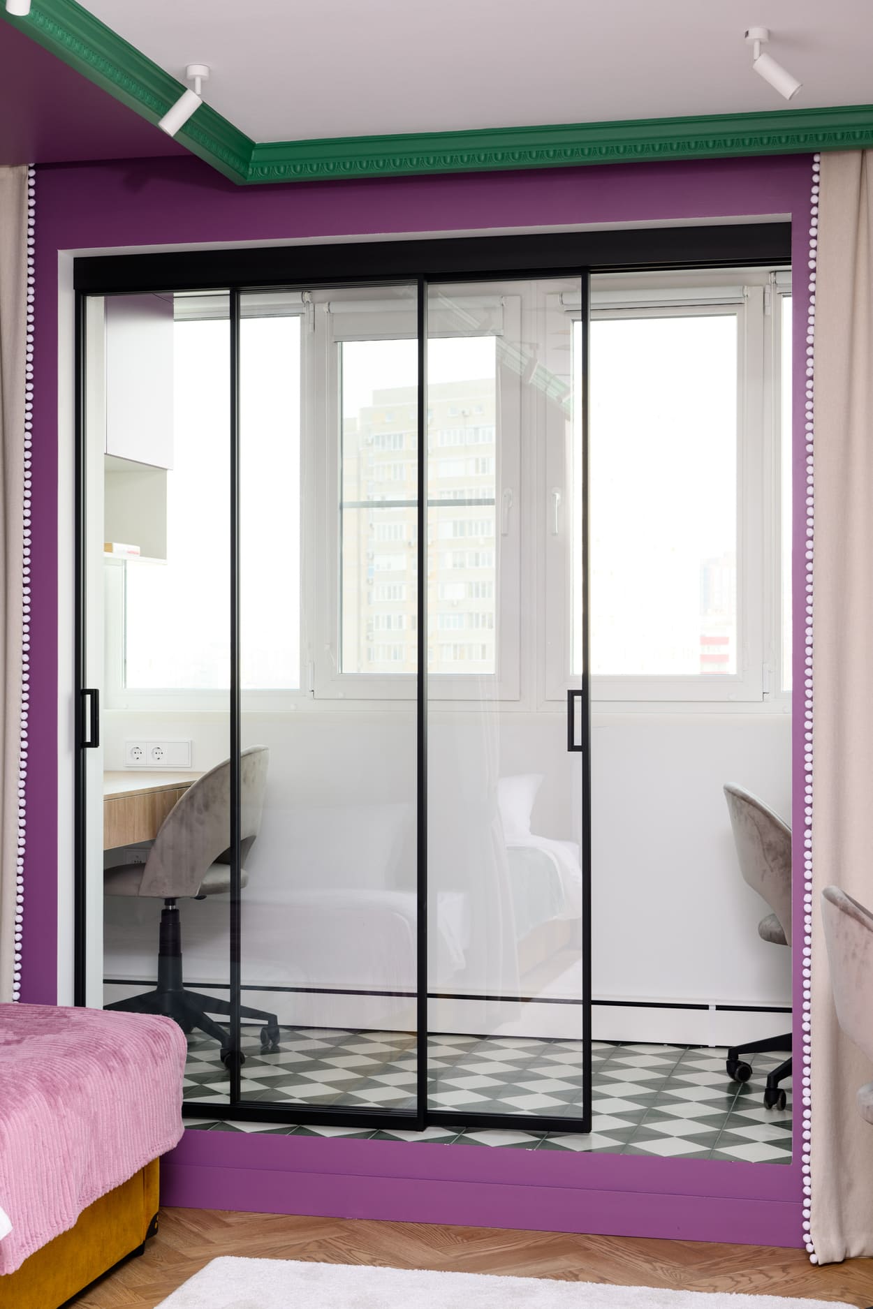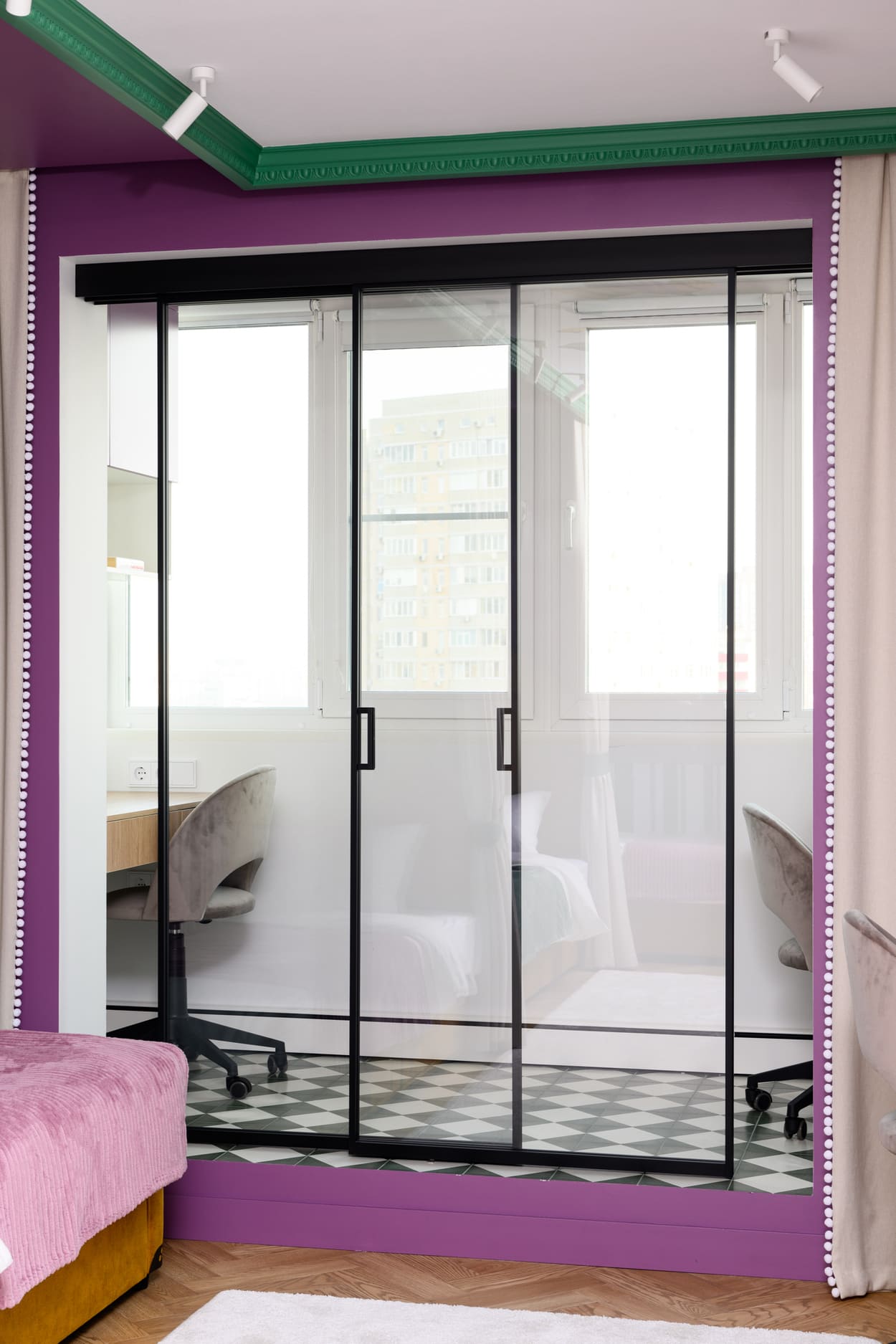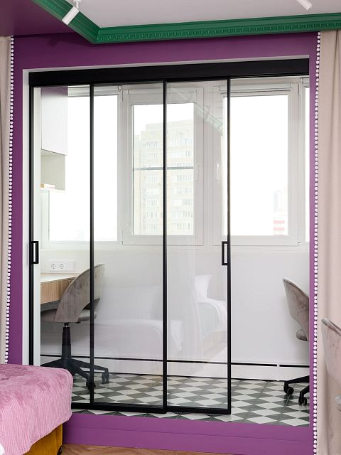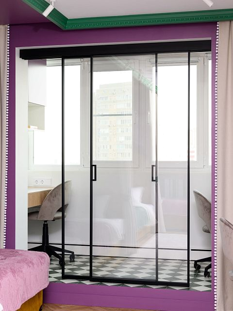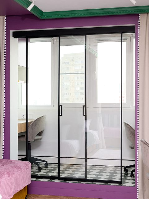 В этом проеме между комнатой и лоджией установлена перегородка Meta. Створки с анодированным алюминиевым профилем и безопасным стеклом триплекс открываются плавно и бесшумно благодаря итальянскому механизму с доводчиками.