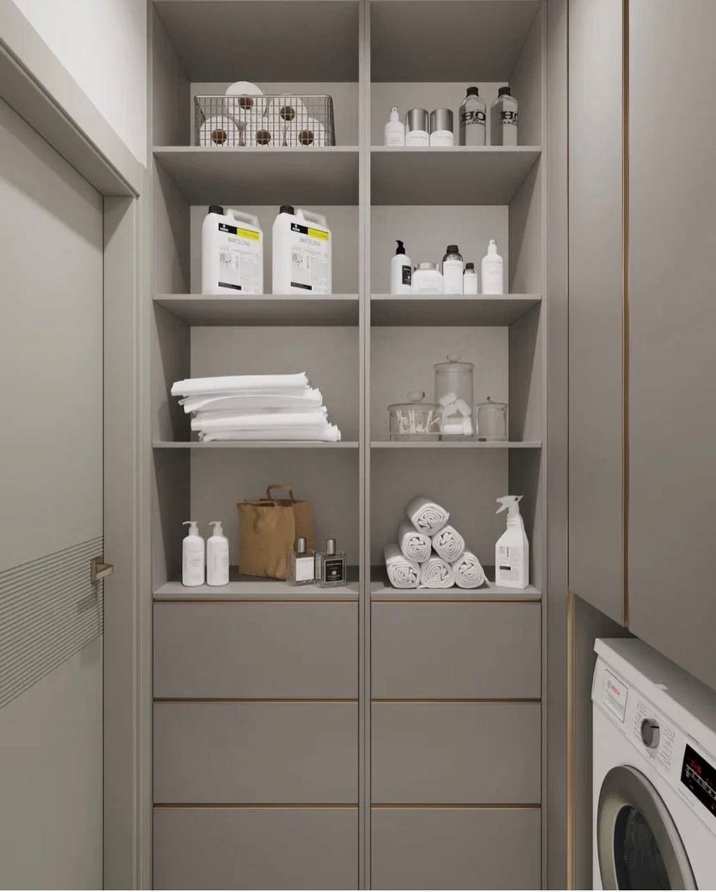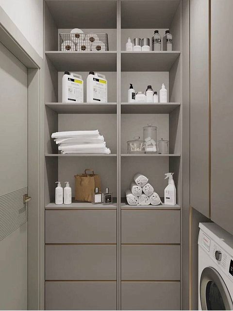 В данном проекте дизайнер Александра Усатова, исходя из пожеланий и потребностей клиентов предусмотрела в зоне прихожей еще и хоз. блок под их нужды, где расположилась стиральная машинка и система хранения для бытовых вещей. Пространство получилось не только очень красивым, стильным, но и функциональным.