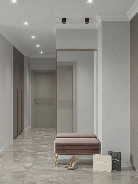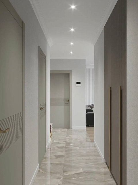 Для проекта была выбрана сдержанная цветовая гамма в серых благородных тонах, присутствуют трендовые рифленые поверхности. Рисунок с бороздками на межкомнатных дверях Mezzo в эмали гармонично перекликается с фасадами шкафов, тумб. Вся композиция выглядит целостной. Акцента и лоска добавляют латунные детали в виде фурнитуры, молдингов на стенах и ножек у мебели.