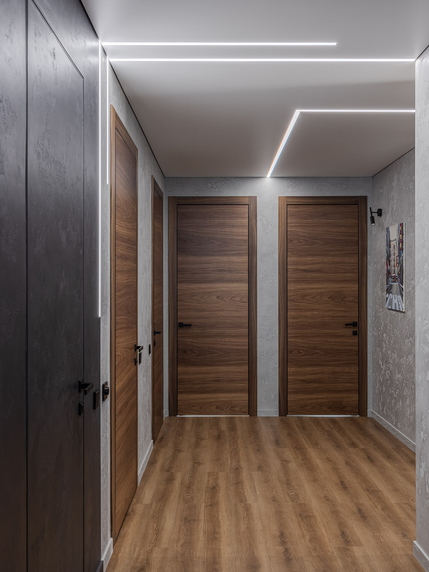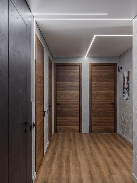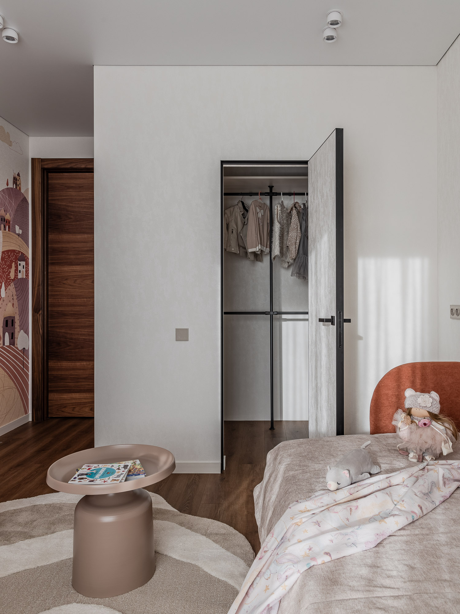 В проекте использованы межкомнатные двери Porte 39-00 с покрытием из натурального шпона. Это не только красиво, но и практично, так как такие двери отлично вписываются в общий стиль. Также была применена дверь скрытого монтажа под покраску, за которой спрятана детская гардеробная. Это — мечта каждой девочки, обеспечивающая порядок и достаточное пространство для хранения вещей.