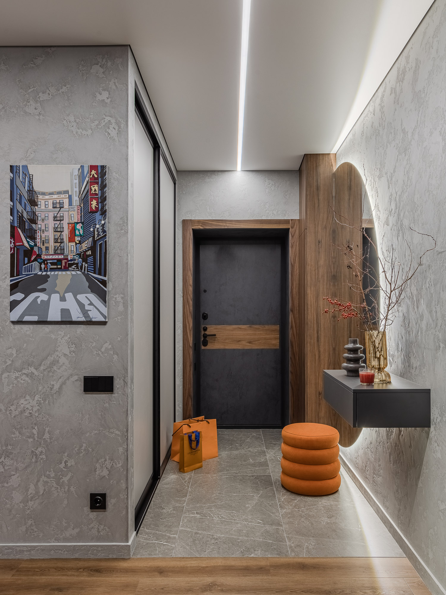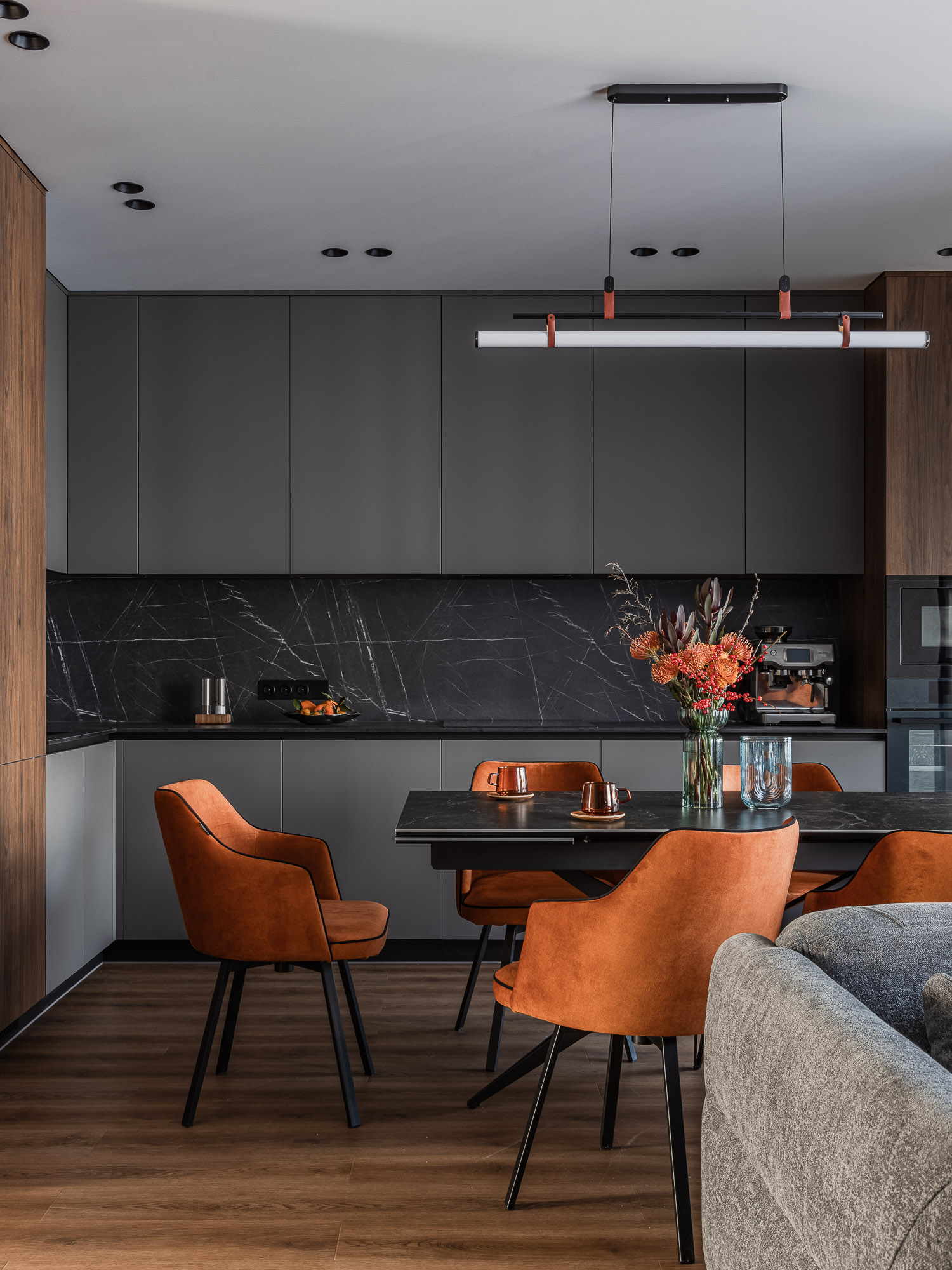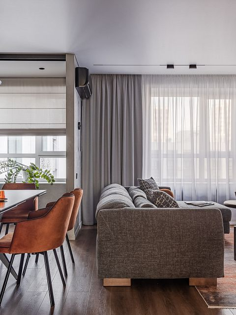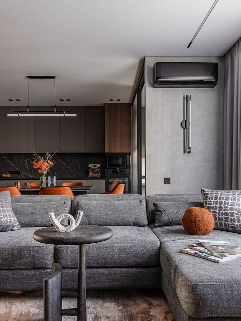Этот интерьер создан с заботой о комфорте и уюте для всей семьи. Он наполнен серыми, бежевыми и белыми тонами, которые создают атмосферу спокойствия и гармонии.