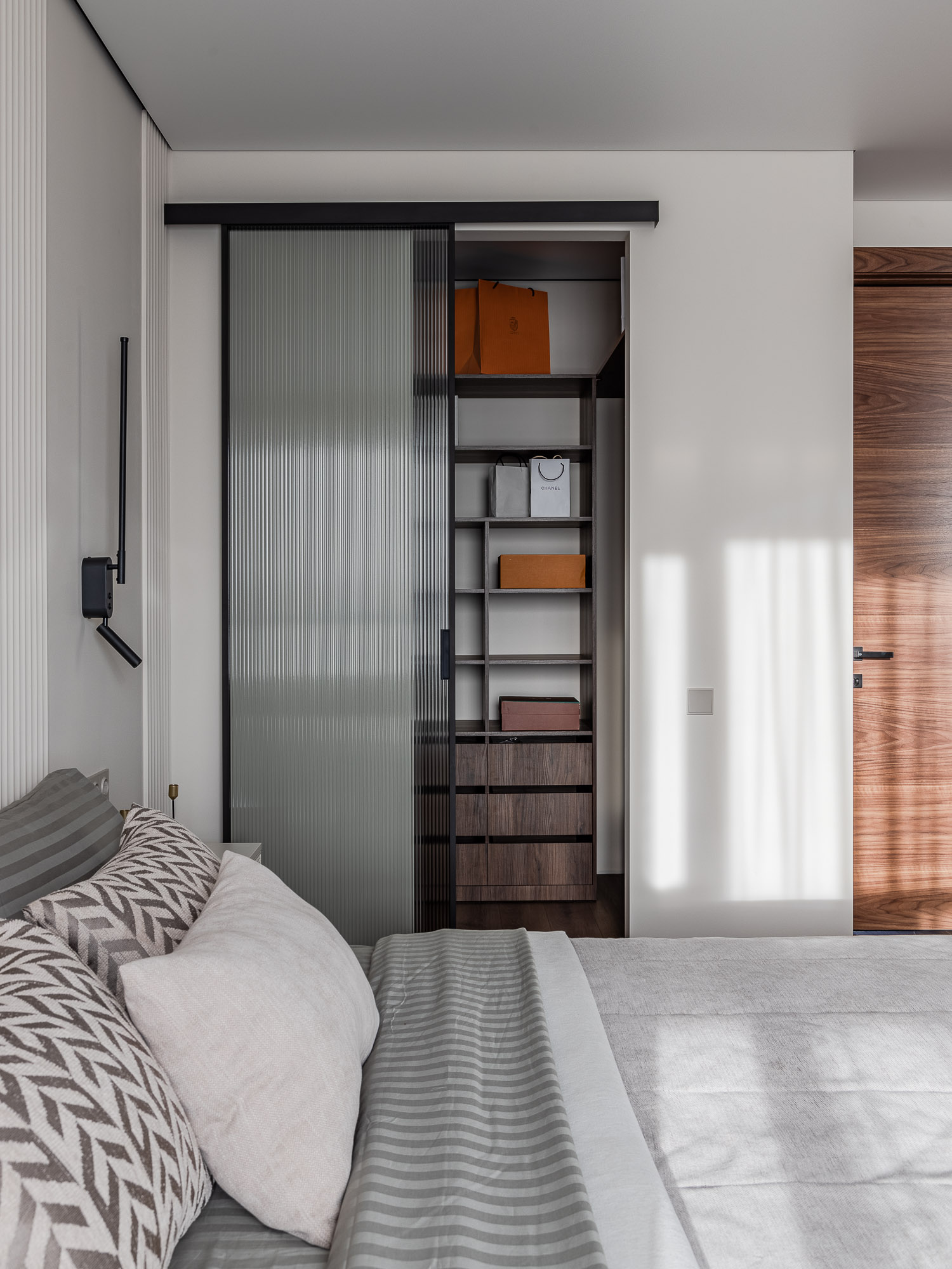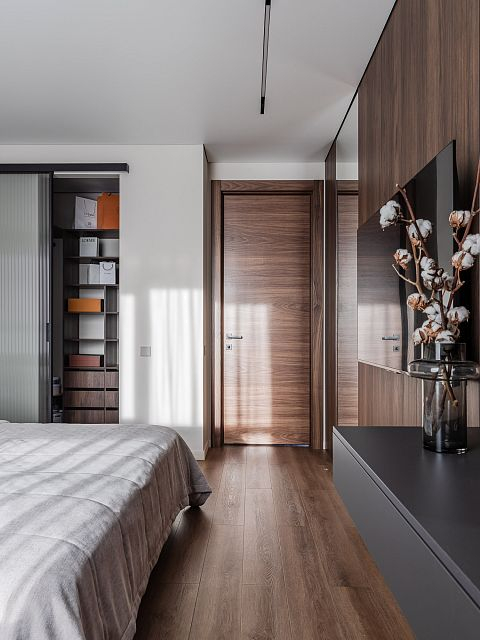Спальня хозяев украшена элементами из дерева, придающими интерьеру природность и теплый характер. Эти детали делают атмосферу еще более домашней и расслабляющей.