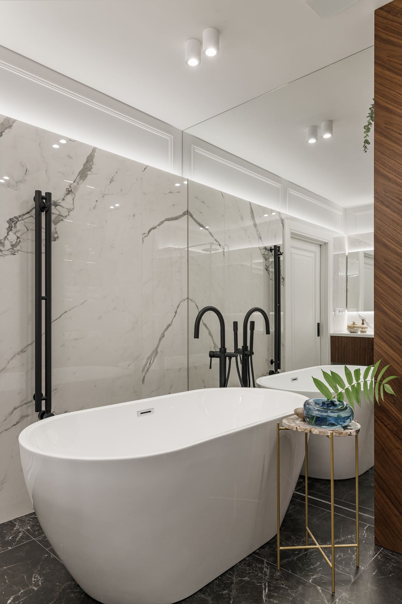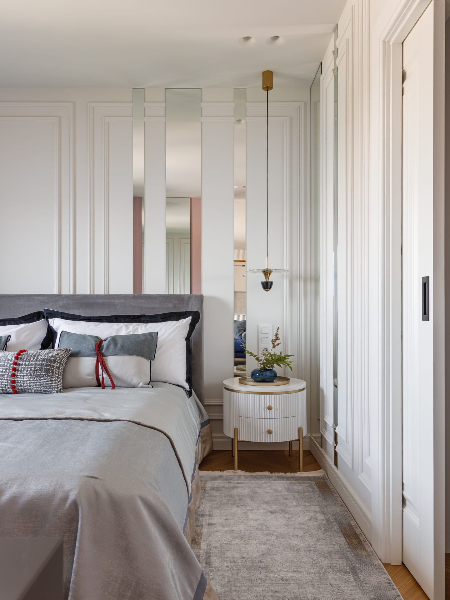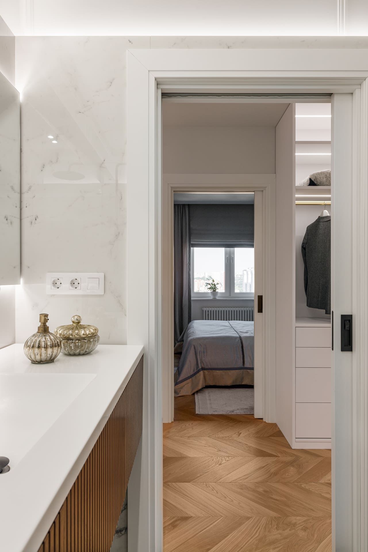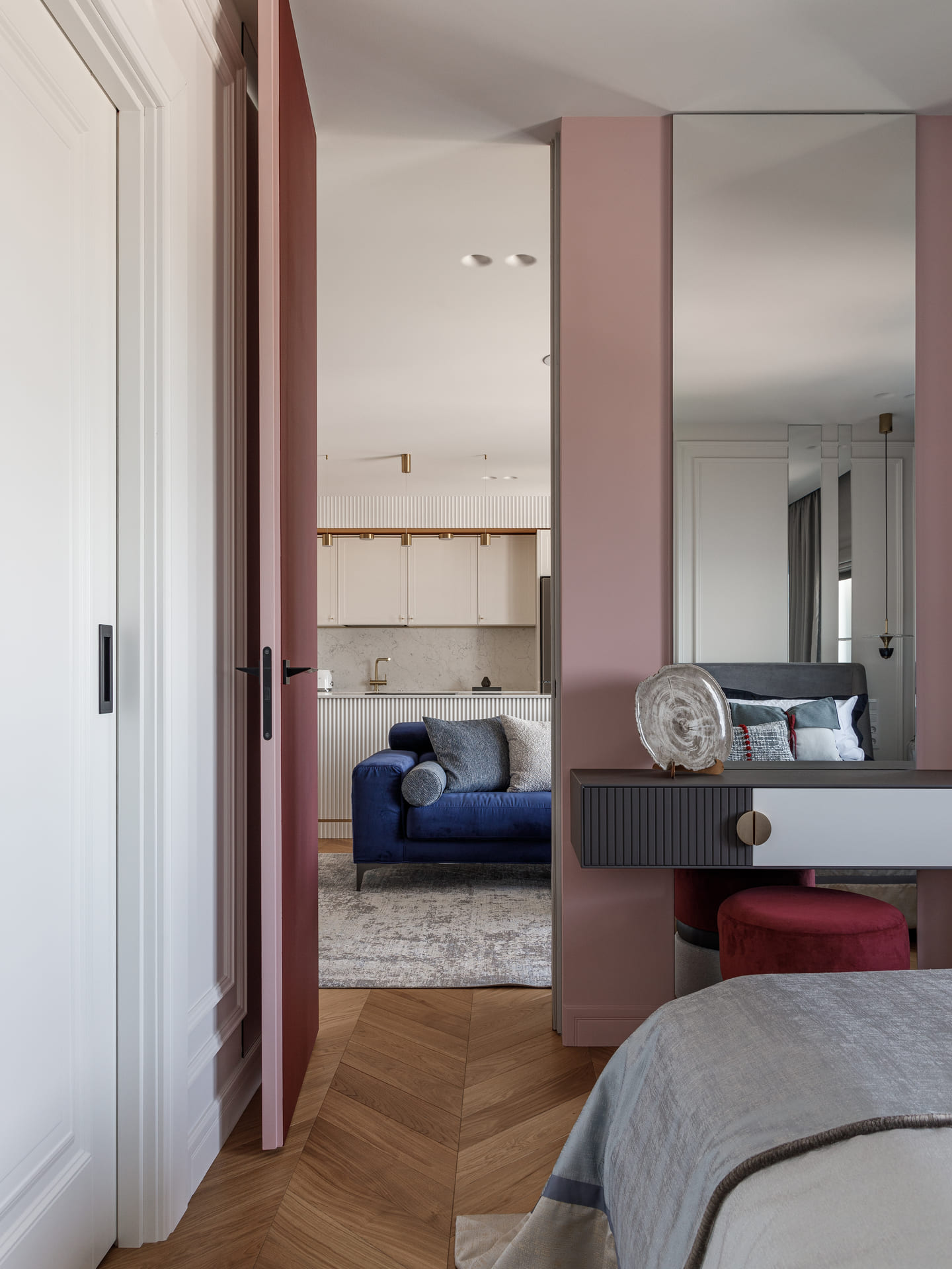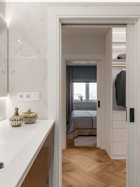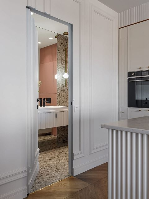 В проекте особое внимание уделено межкомнатным дверям. Двери Elegance 1 и Secret прекрасно вписываются в общий стиль, добавляя нотки изысканности и гармонии. Эти двери не только эффективны с точки зрения функциональности, но и становятся важными элементами декора, которые подчеркивают общую концепцию квартиры.