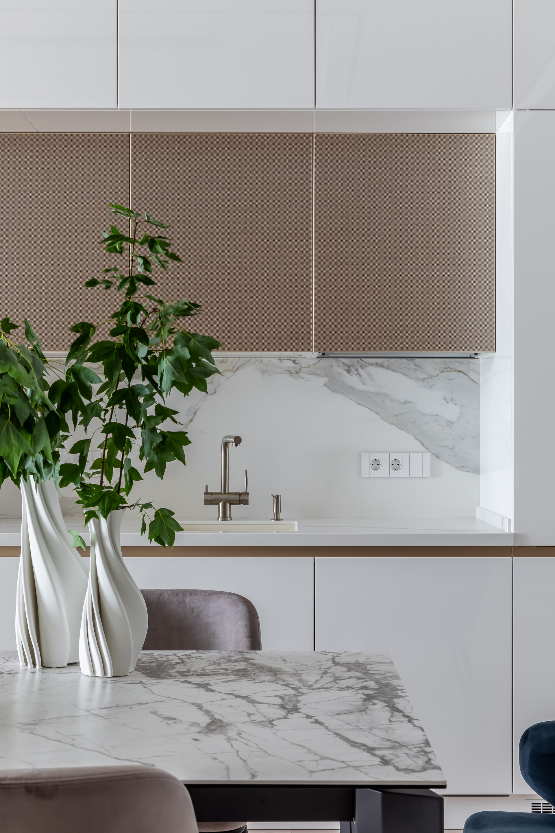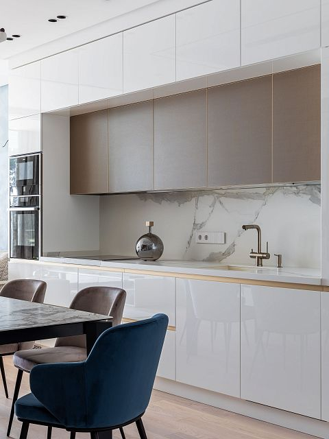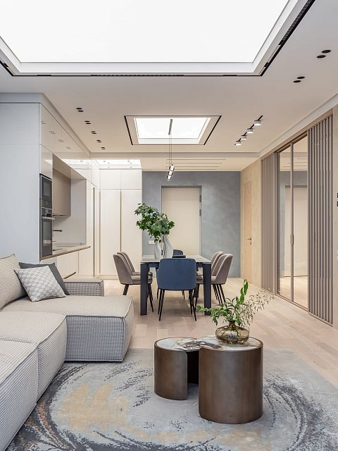 В интерьере преобладают мягкие, естественные оттенки, которые вызывают ассоциации с яркими пейзажами. Теплая цветовая палитра, в которую включены кремовые, песочные и нежные голубые тона, создает атмосферу спокойствия и уюта.