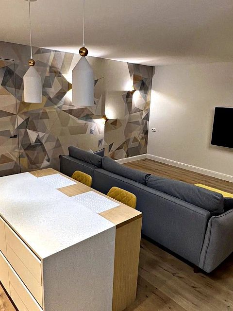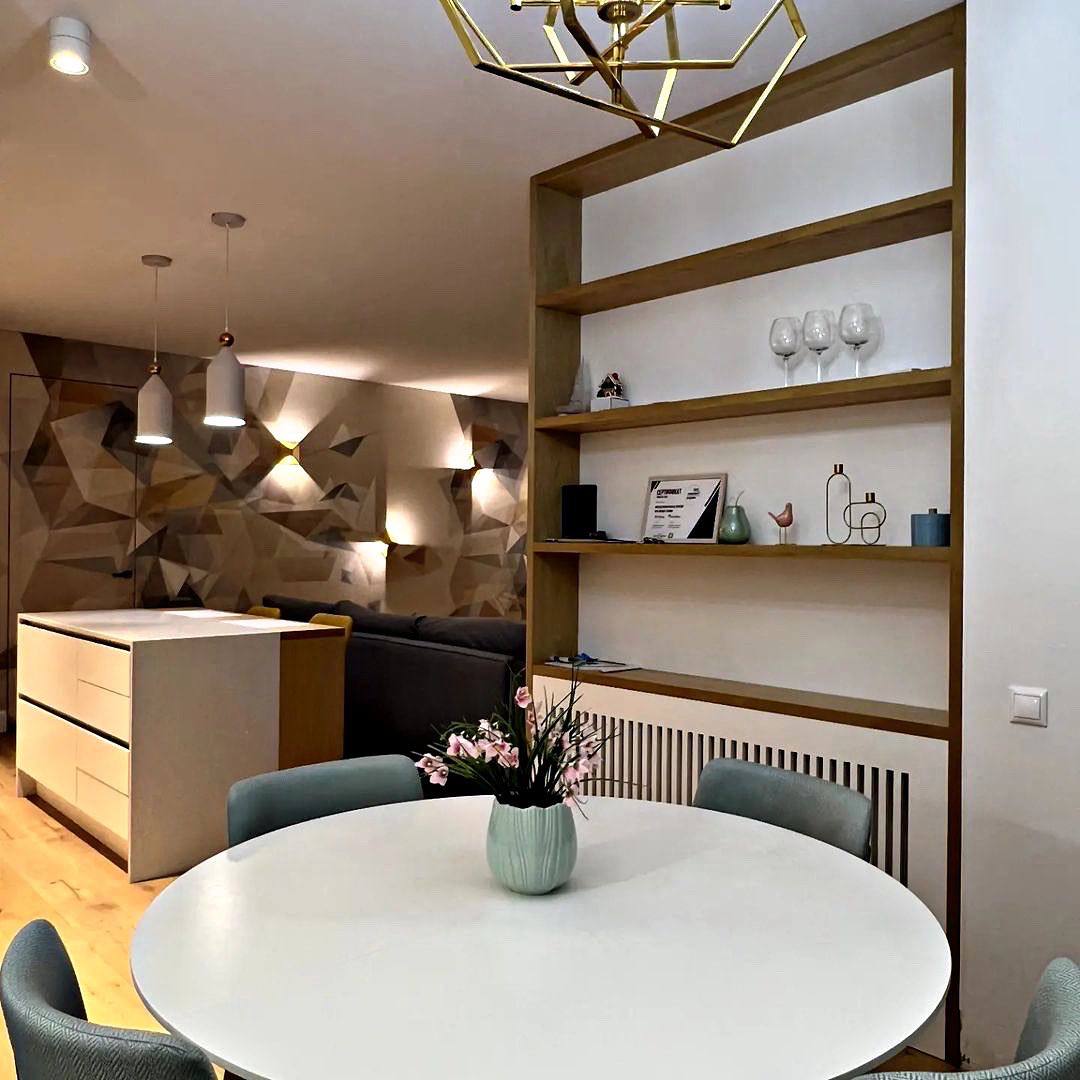 Своему новому проекту дизайнер Ирина Алексеева (г.Уфа) придала выразительности в первую очередь за счет яркой стены с геометрическим рисунком и стильных светильников в монохромной отделке. Использование дверей скрытого монтажа от фабрики Terem позволило сделать акцент на интересные дизайнерские задумки, а пространство более легким и графичным.