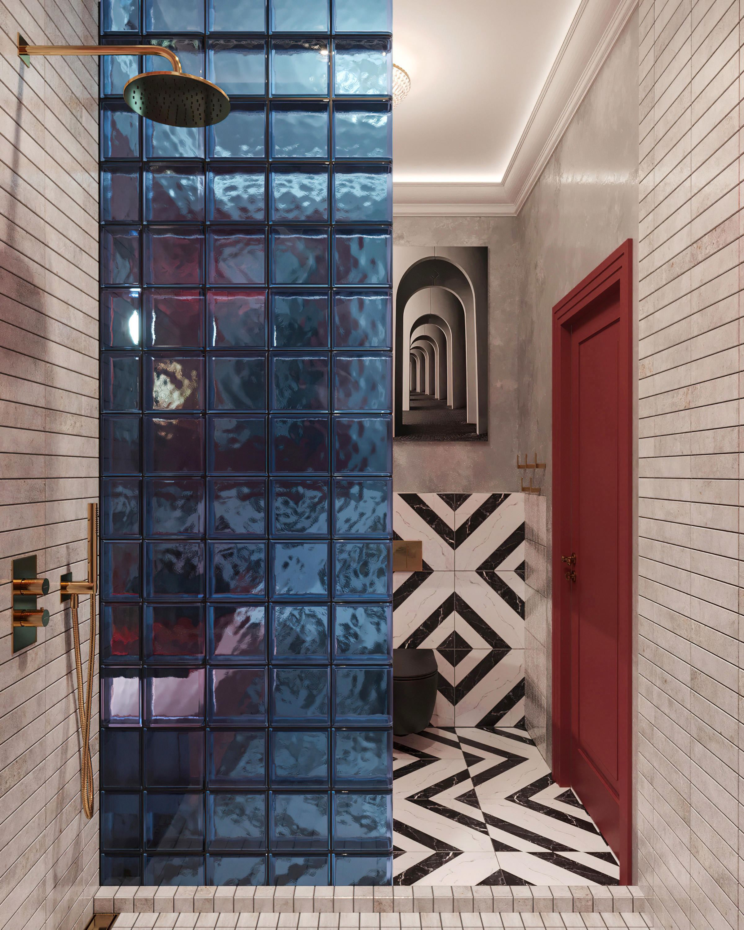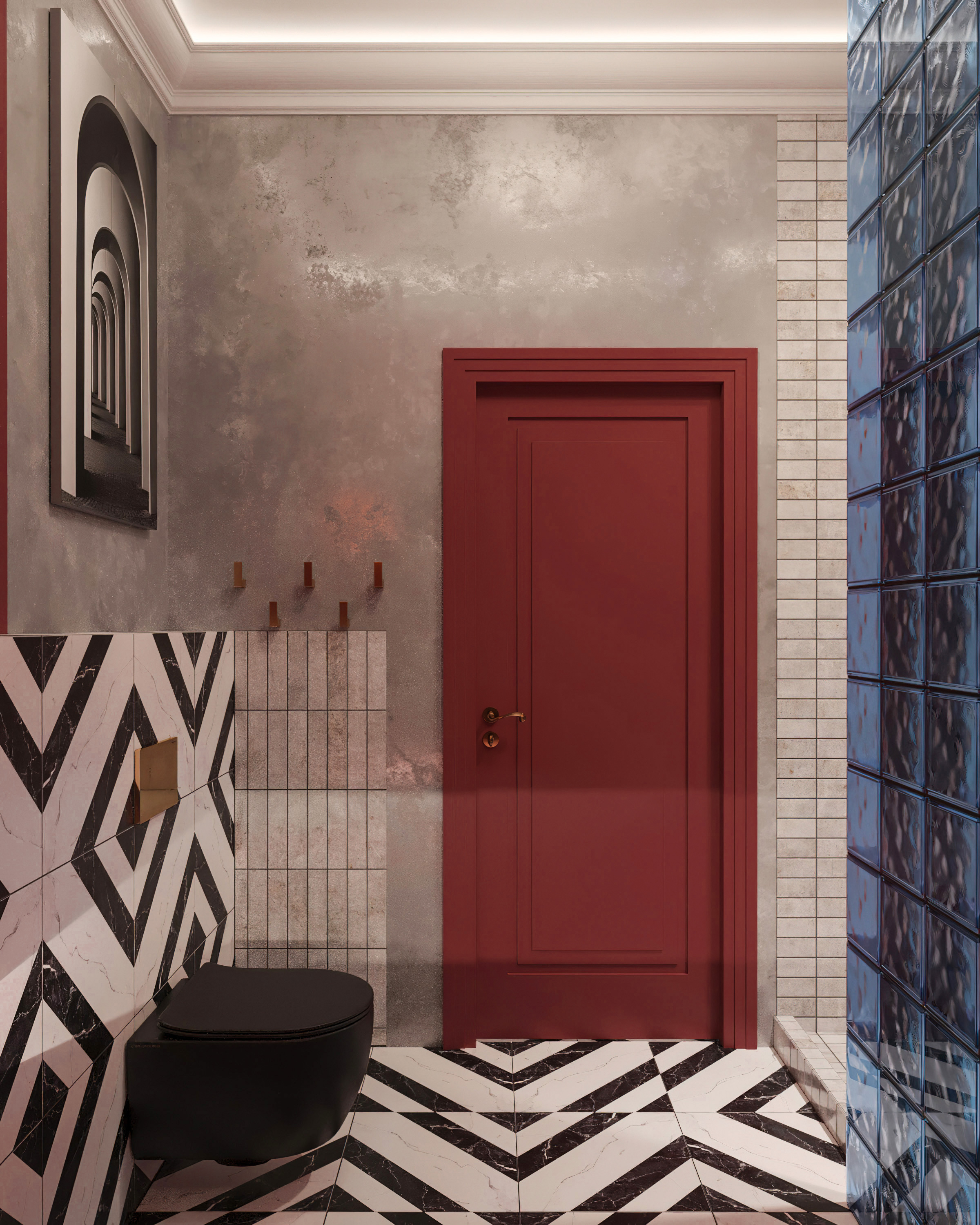 Санузел продолжает концепцию прихожей, делая акцент на оригинальные и нестандартные решения. Здесь можно увидеть смелые сочетания текстур, например, глянцевые и матовые поверхности, которые создают эффектный визуальный контраст. Зонирование пространства осуществляется с помощью оригинальных элементов декора, которые не только придают уникальность, но и делают функциональность максимально удобной.