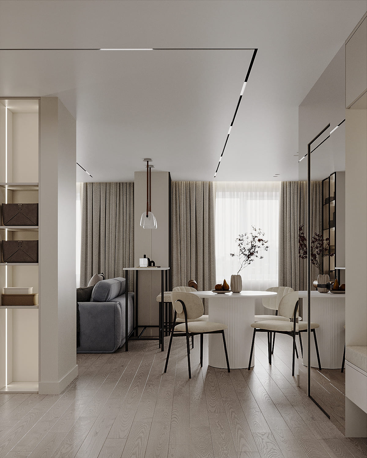 Интерьер наполнен светом и воздухом, что способствует ощущению простора, несмотря на размеры квартиры. Такой проект демонстрирует, как можно гармонично сочетать современные решения с теплотой домашнего уюта, создавая комфортное жилое пространство для всего семейного счастья.