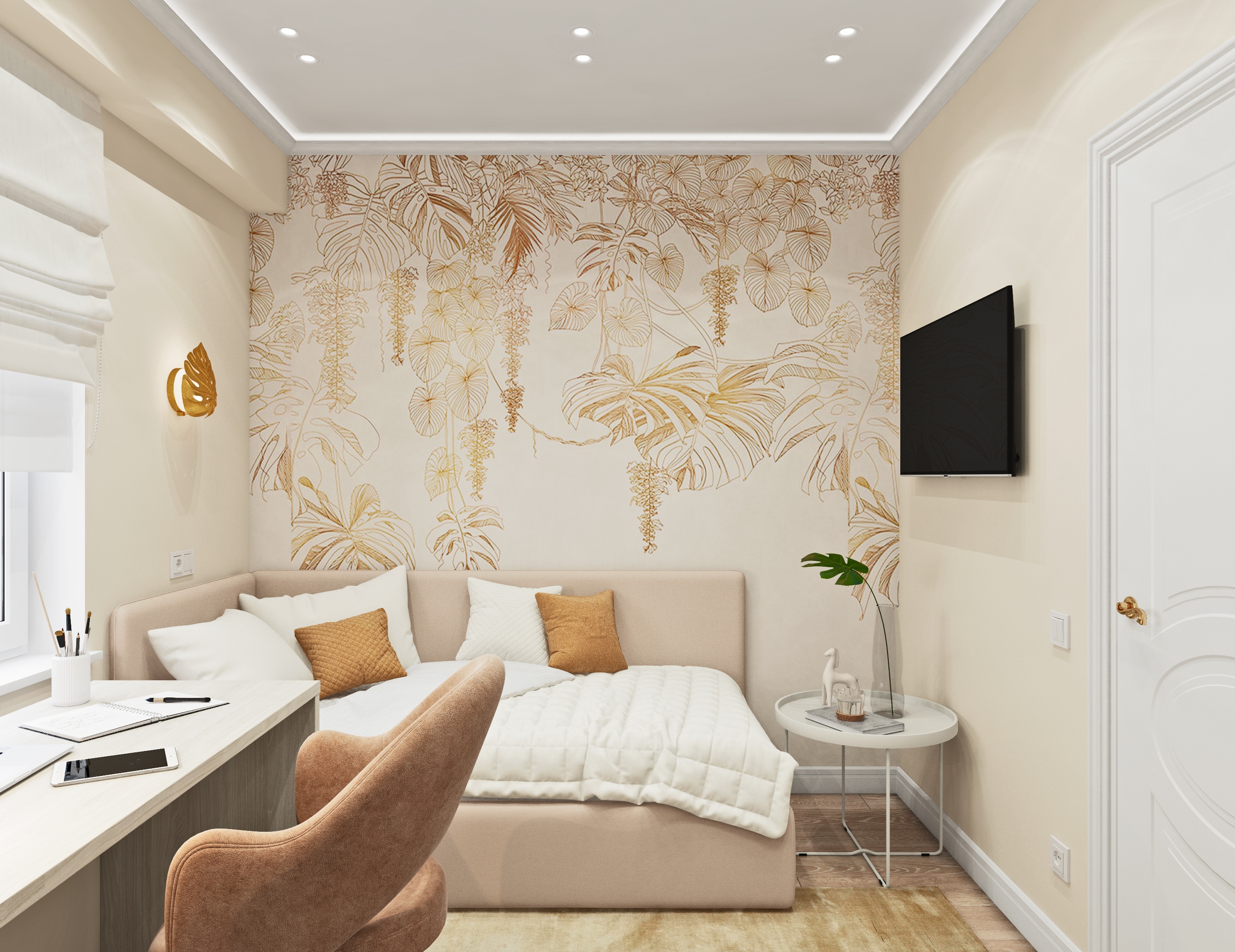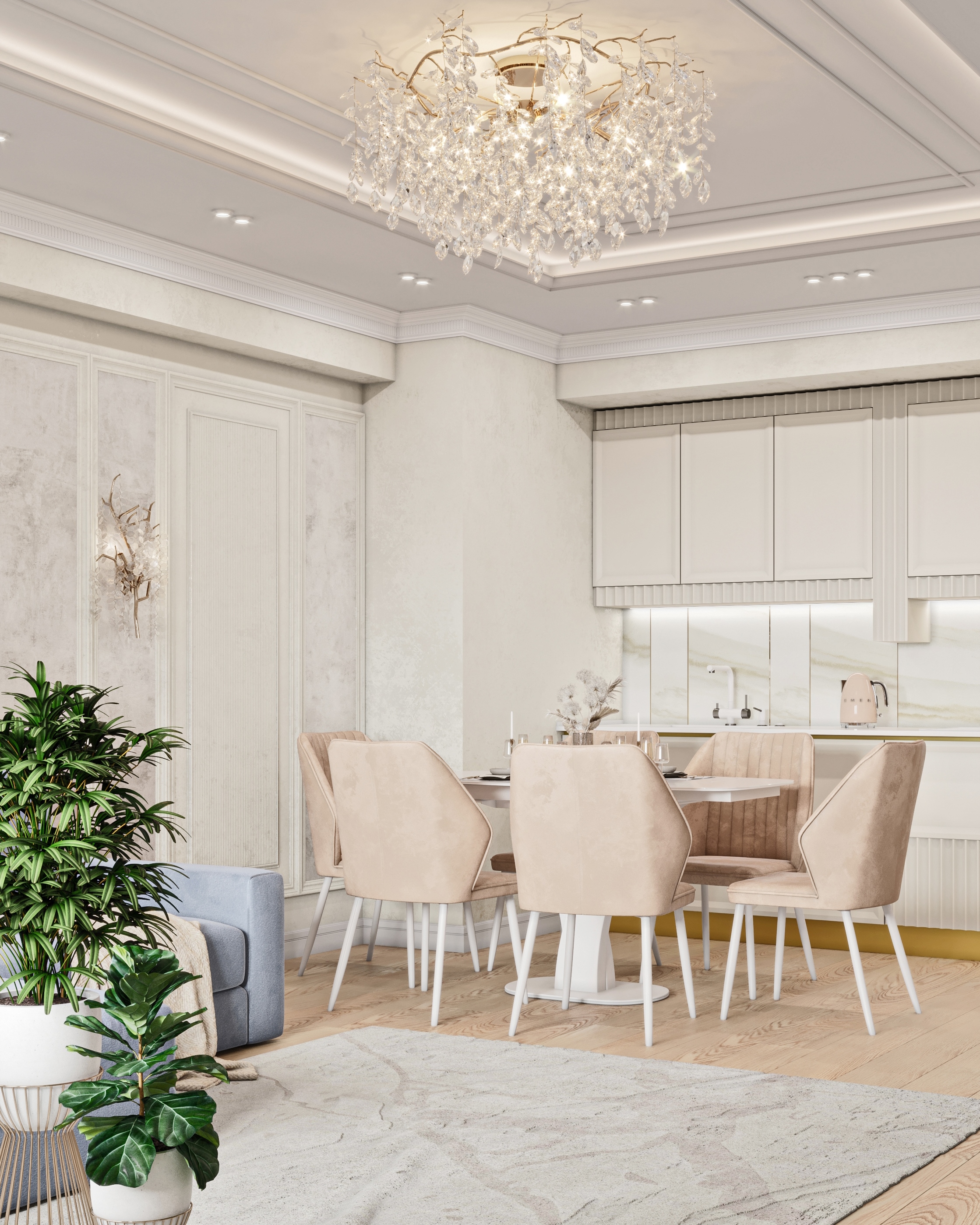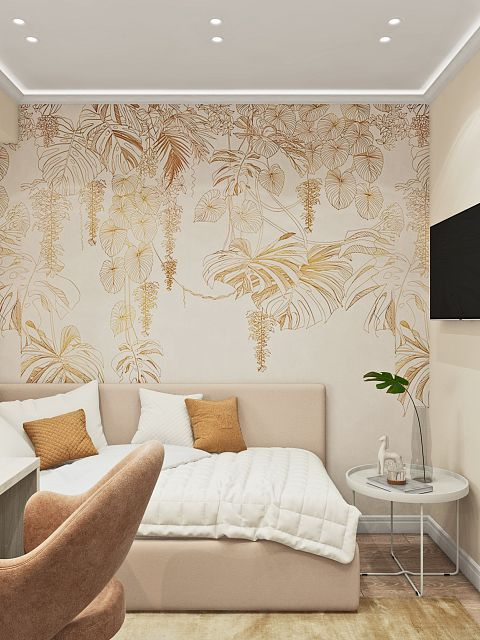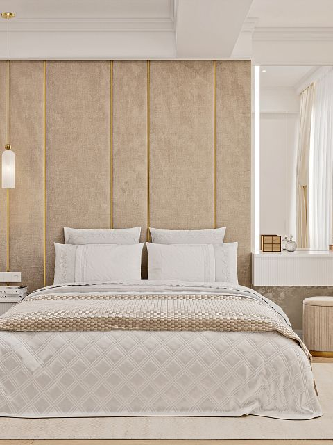 Нежная натуральная палитра цветов интерьера, растительные орнаменты, благородная и лаконичная мебель - все приятно глазу и гармонично.