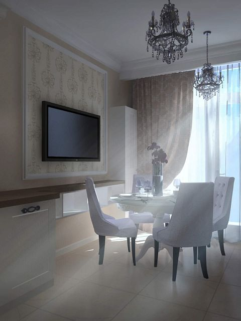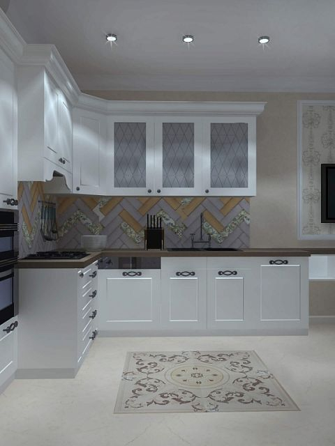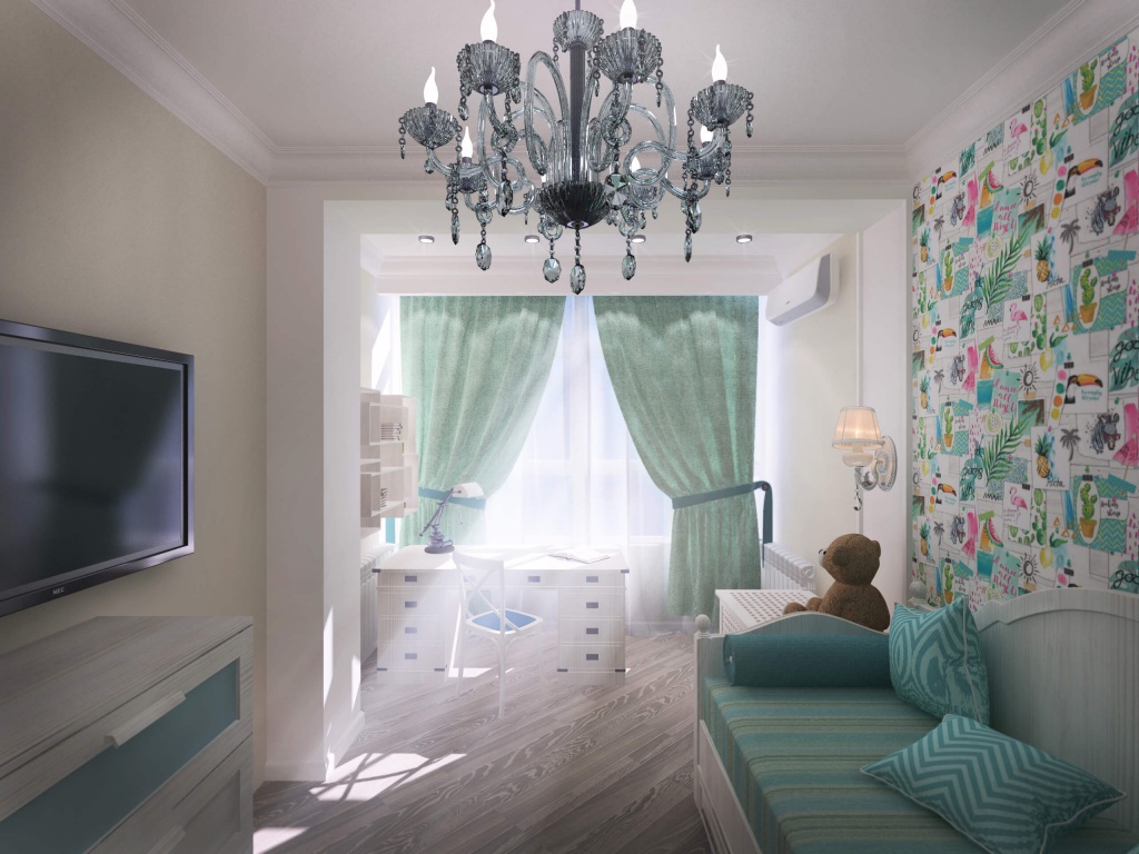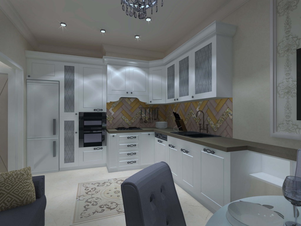 Целью было создать светлый интерьер в стиле «современная классика» с применением обоев на стенах, керамогранитом под мрамор сатуарио на полу в кухне и санузлах, ламинатом в комнатах, натяжными белыми матовыми потолками. Очень нарядной получилась кухня из белой немецкой плёнки с патиной а также сочетание рисунков обоев в столовой зоне. В детской комнате мы добавили цвета благодаря «веселым» обоям imaginarium, которые внесли нотку бирюзового цвета и ярких модных принтов в квартиру.