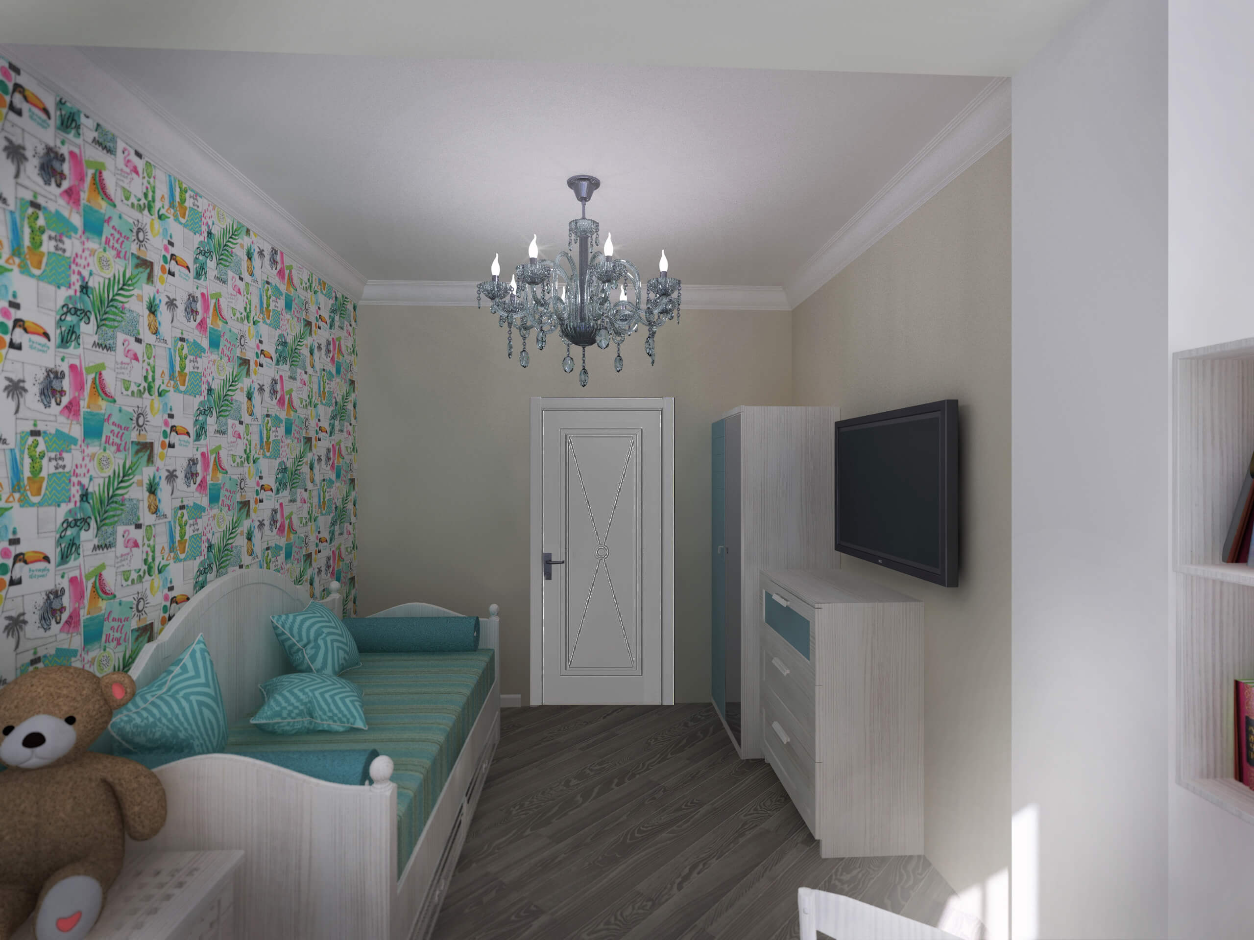 Двухкомнатная квартира с большой кухней была приобретена семьей из трёх человек с дочерью дошкольного возраста для собственного проживания. Но при этом необходимо мыло учесть размещение друзей и родственников, приезжающих в гости на лето. Поэтому в квартире была выполнена существенная перепланировка. Одну комнату (детскую) мы чуть уменьшили, отдав эту площадь прихожей для создания двух вместительных шкафов. В спальной хозяев отделили небольшой собственный санузел. Прихожая не осталась тёмной благодаря двустворчатым дверям с матовым стеклом, ведущим в кухню-столовую. Изначально заказчики хотели уменьшить детскую и сделать гардеробную. Но при этом решении детская значительно уменьшалась бы по площади. Новая планировка создала места хранения в прихожей без ущерба для детской. Спальная хозяев изначально имела вытянутую форму. Мы воспользовались этим и разбили её на две зоны: кровать и гостиная с диваном и телевизором. Отделили их шторой на случай если гости или родственники будут спать на диване (ничего не поделаешь, это специфика курортного города).