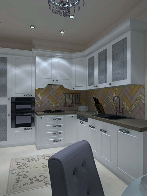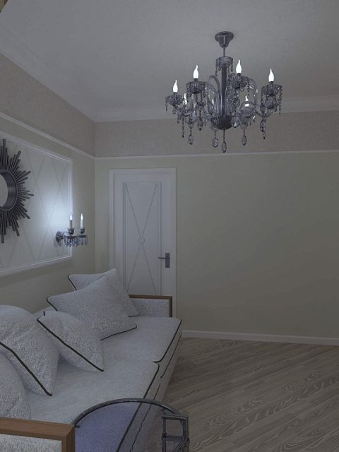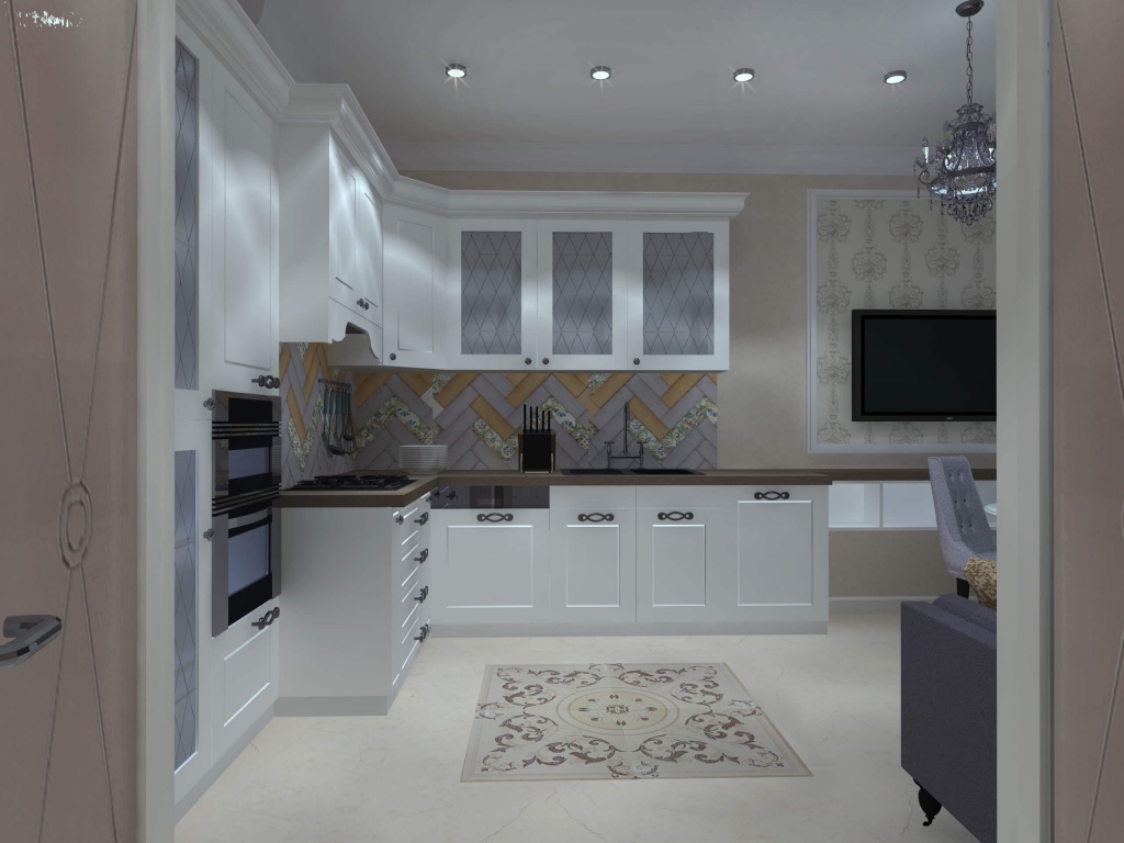 Для этой квартиры мы выбрали дверные полотна Marko 1 – одни из моих самых любимых – в белой эмали. Двухстворчатая дверь в кухню-столовую с матовым стеклом. Двери взяли стандартной высоты, с наличниками и доборами. Эта модель дверей стильная, заметная, диагонали придают ей солидности. Но в то же время дверь не настолько пафосная, чтобы подойти только в классические интерьеры. Единственное «но»: минимализм, лофт, хай-тек не для неё. Для кухни-столовой и комнат мы выбрали классические люстры с хрусталем. Они отлично подошли и к кухне и к рисунку обоев и к дверям.