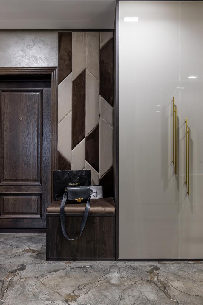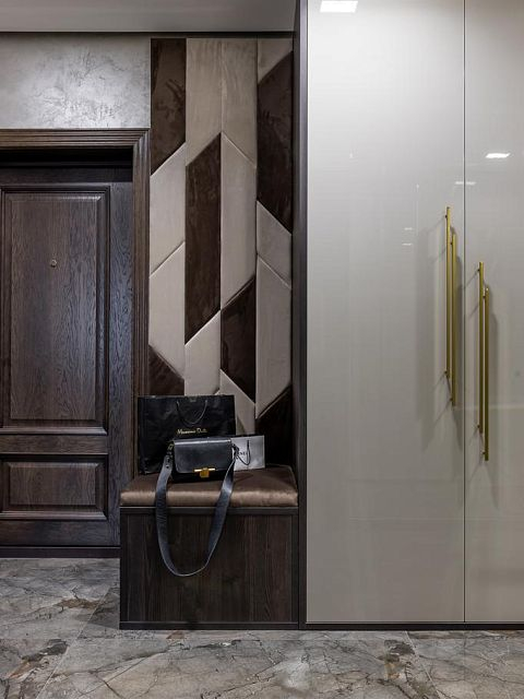 Глубина покрытия шпона достигается за счет поэтапного нанесения материалов. Сначала шпон тонируется в темный цвет, после высыхания основы двери покрываются более светлыми тонами эмали и лака. Полученный эффект вы можете увидеть на фото проекта.