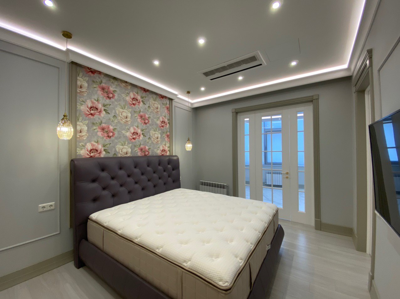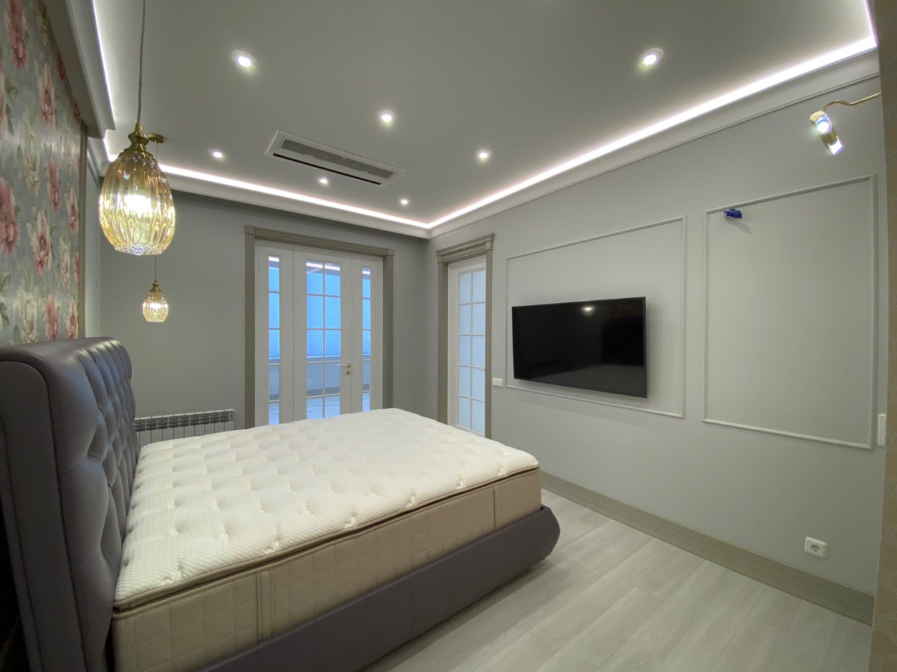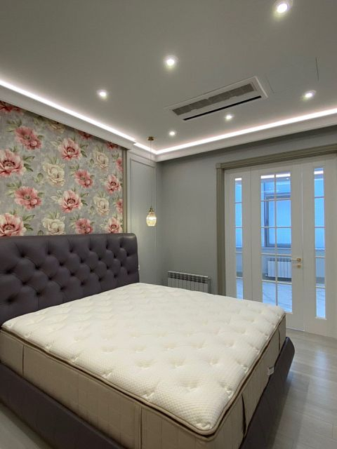 Немного нежности, немного цветов, но много света и уюта – всё это сочетает в себе спальня. Мягкое тепло золота отлично гармонирует с благородным холодным фоном. Основным акцентом декорирования комнаты является спальная зона – шикарное пано с цветами, подвесные светильники в виде нераскрывшихся бутонов и огромная кровать смелого тёмно-лилового оттенка. Из спальни есть два выхода через легкие остекленные двери: на террасу и в каминную комнату.