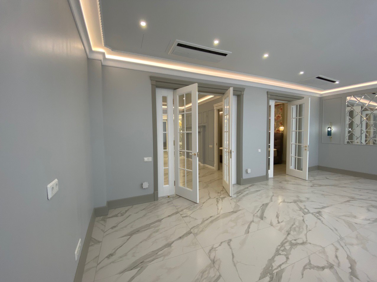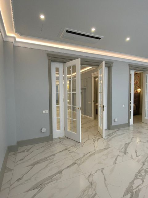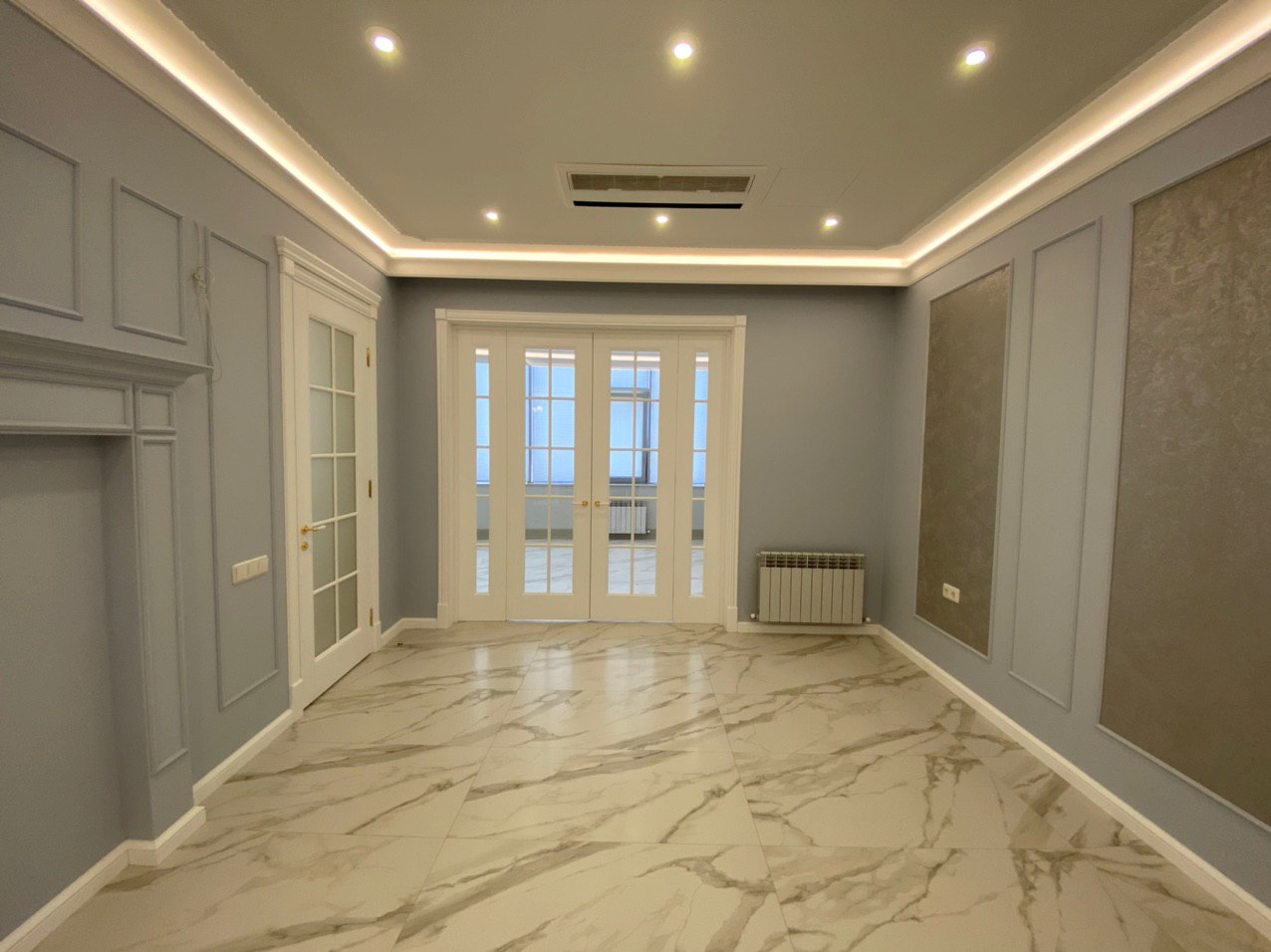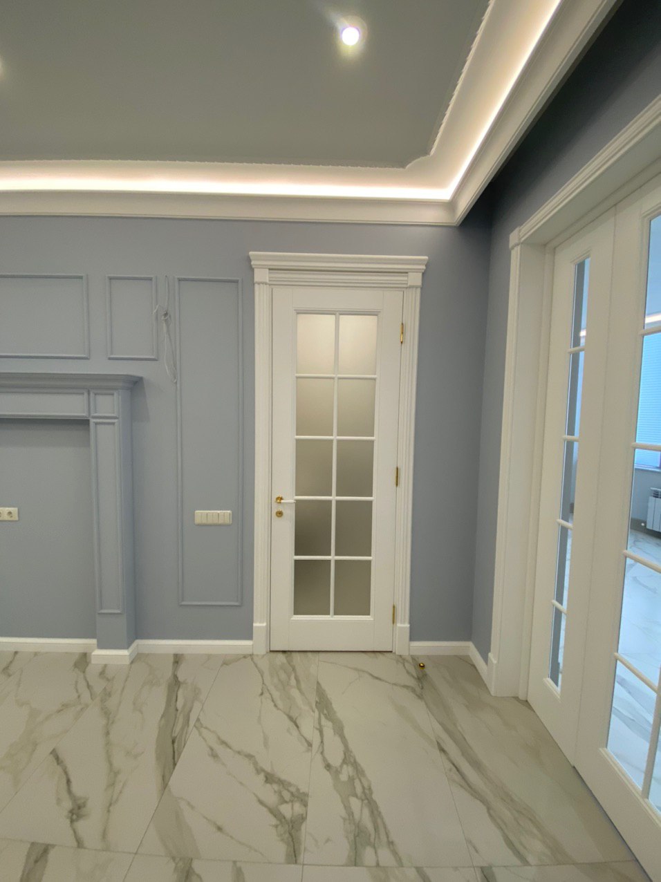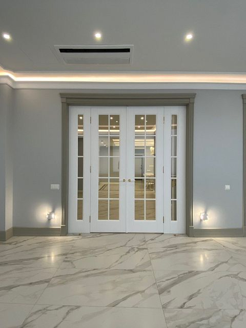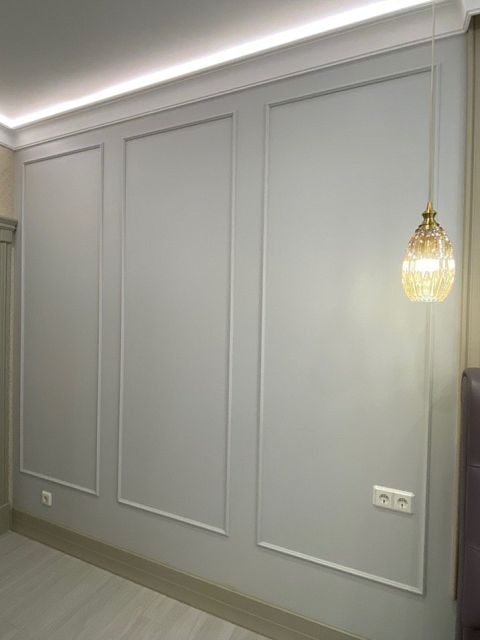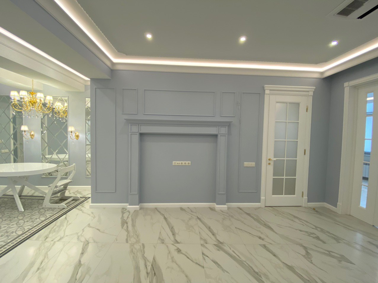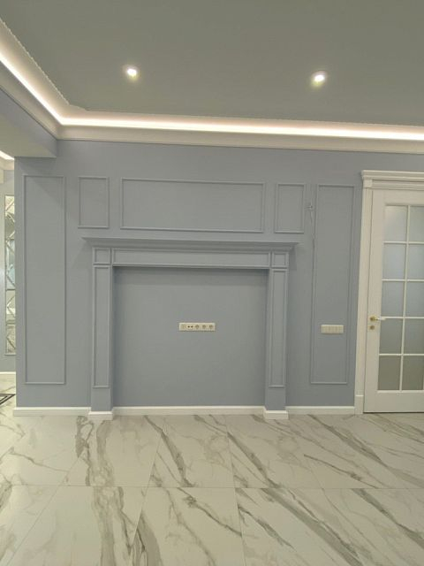 Каминная комната в холодное время года, по умолчанию, становится центром внимания и любимым местом времяпровождения всей семьи. Огонь притягивает и завораживает, создает уют и тепло. Нами выполнена отделка базовой комплектации каминной комнаты по желанию заказчика: неброское точечное освещение и светодиодная подсветка по периметру комнаты, декорирование стен рамками из молдингов и золотыми вставками, изящная ниша для электрокамина. Благодаря легким остекленным двустворчатым дверям, которые ведут на террасу, в каминной всегда много естественного света.