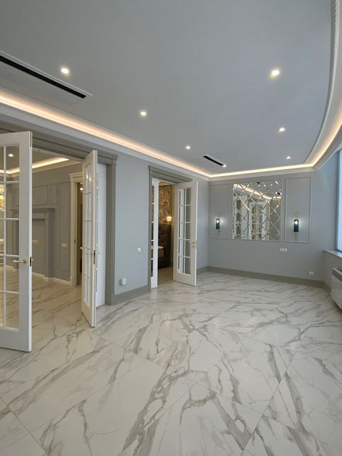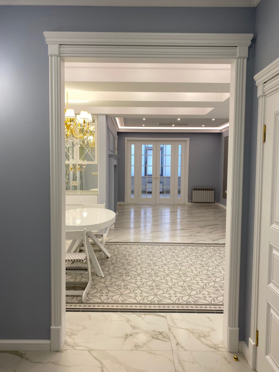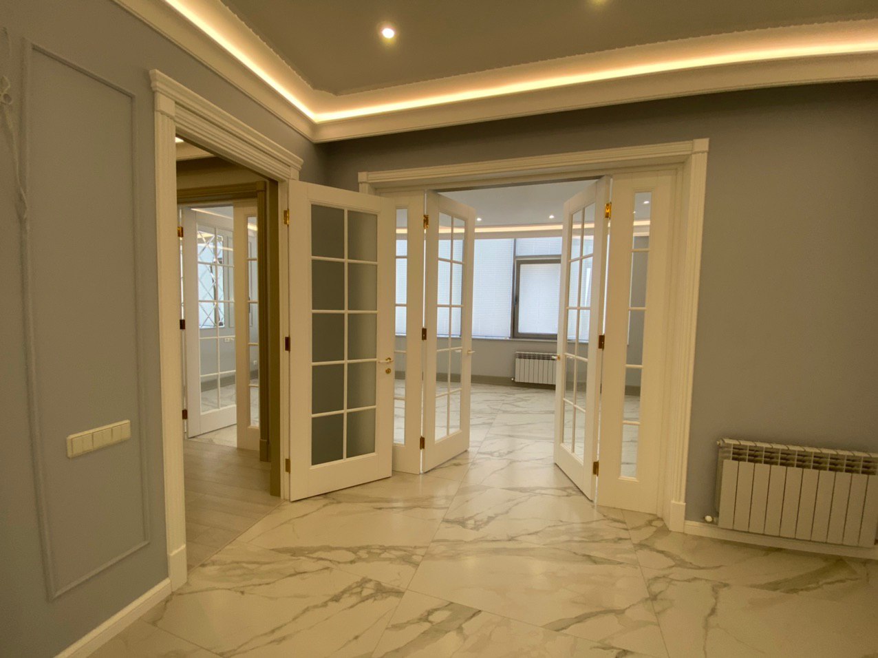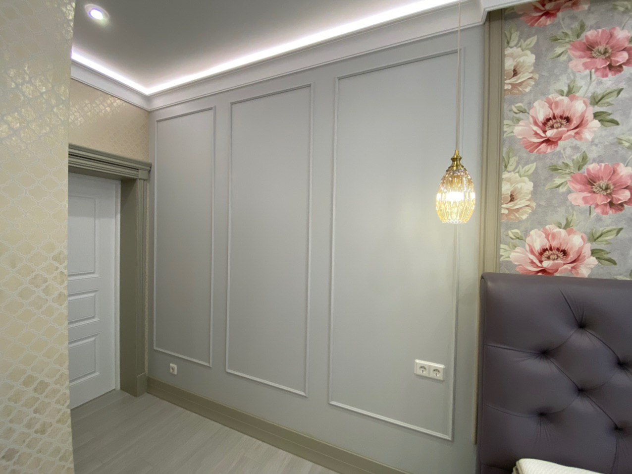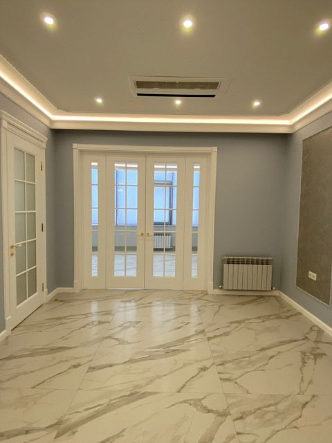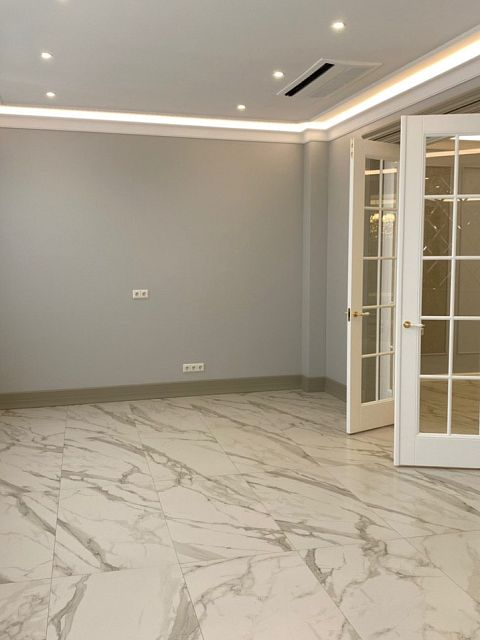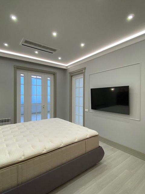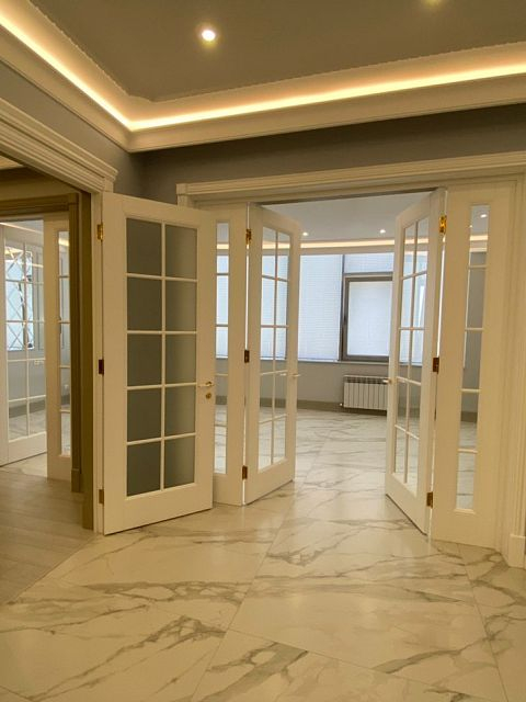 Каминная комната в холодное время года, по умолчанию, становится центром внимания и любимым местом времяпровождения всей семьи. Огонь притягивает и завораживает, создает уют и тепло. Нами выполнена отделка базовой комплектации каминной комнаты по желанию заказчика: неброское точечное освещение и светодиодная подсветка по периметру комнаты, декорирование стен рамками из молдингов и золотыми вставками, изящная ниша для электрокамина. Благодаря легким остекленным двустворчатым дверям, которые ведут на террасу, в каминной всегда много естественного света.