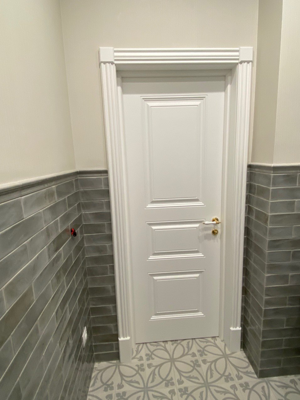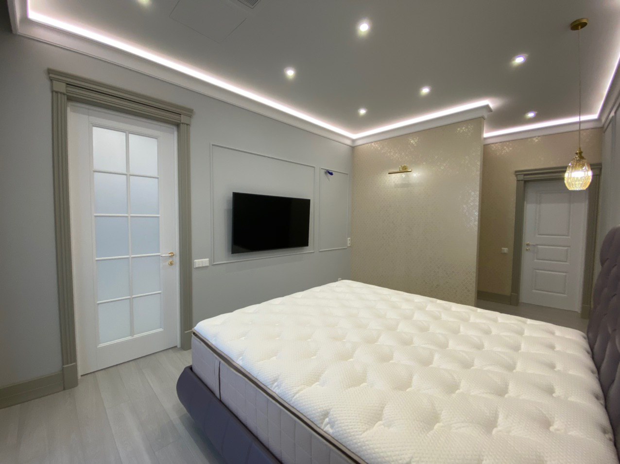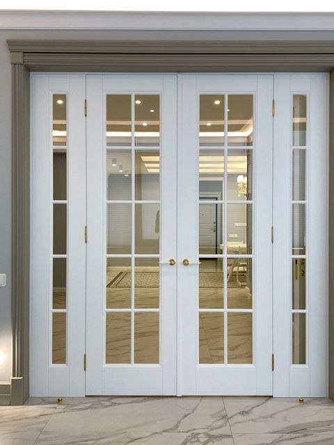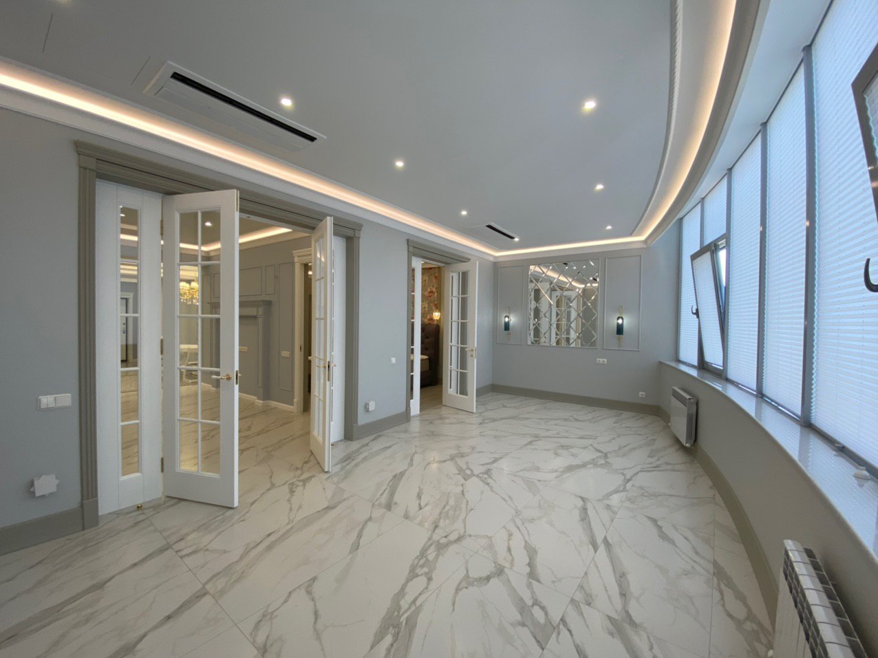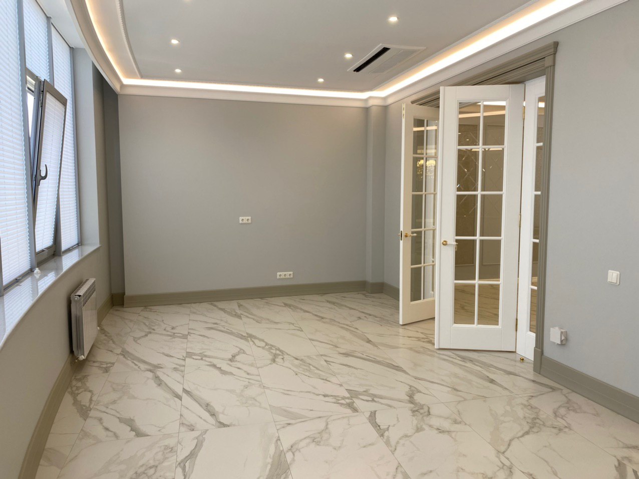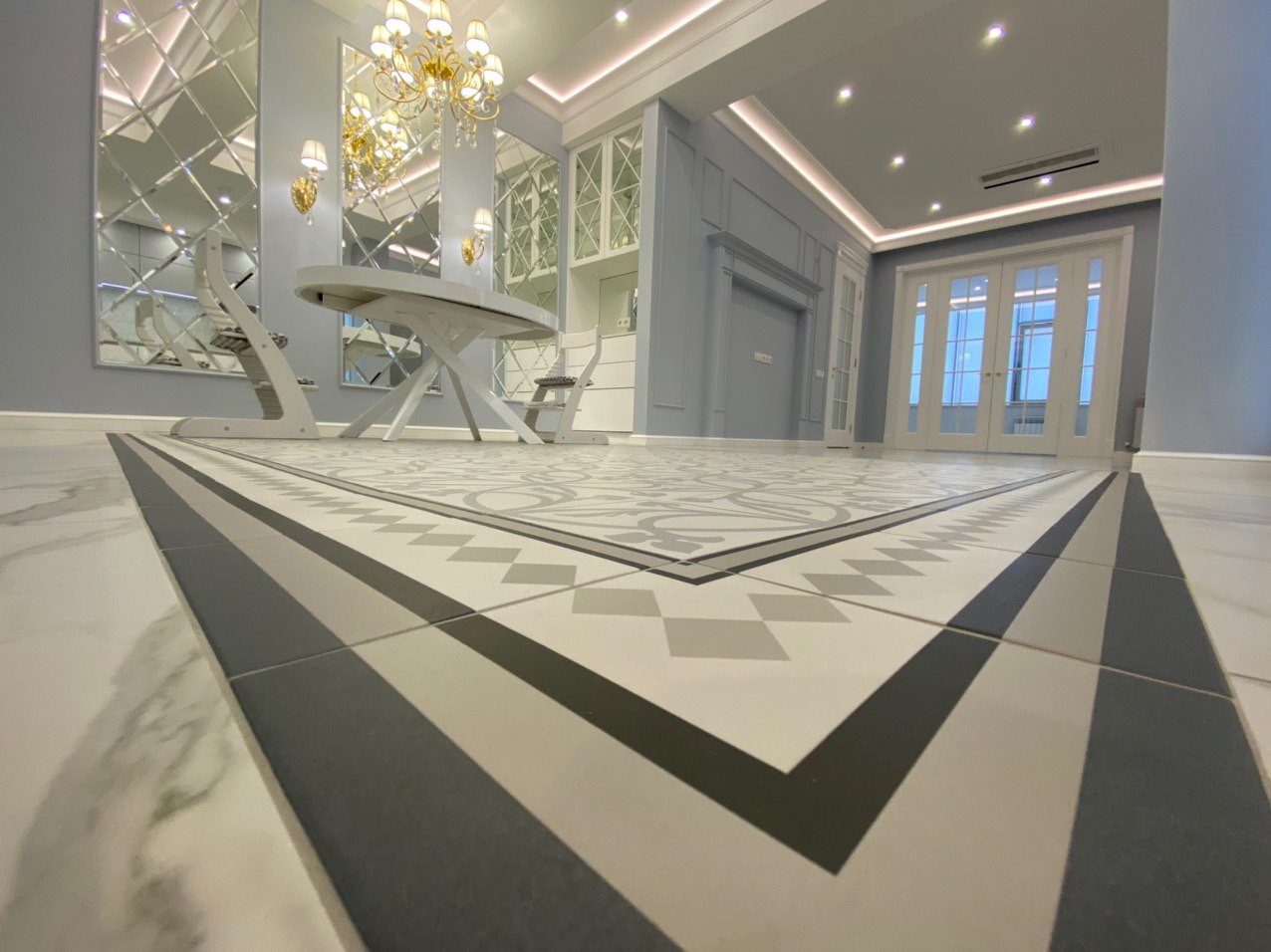 Каминная комната в холодное время года, по умолчанию, становится центром внимания и любимым местом времяпровождения всей семьи. Огонь притягивает и завораживает, создает уют и тепло. Нами выполнена отделка базовой комплектации каминной комнаты по желанию заказчика: неброское точечное освещение и светодиодная подсветка по периметру комнаты, декорирование стен рамками из молдингов и золотыми вставками, изящная ниша для электрокамина. Благодаря легким остекленным двустворчатым дверям, которые ведут на террасу, в каминной всегда много естественного света.