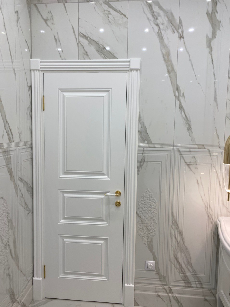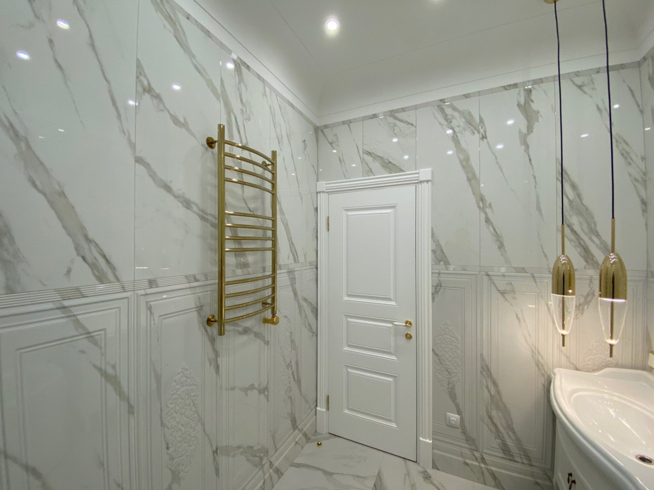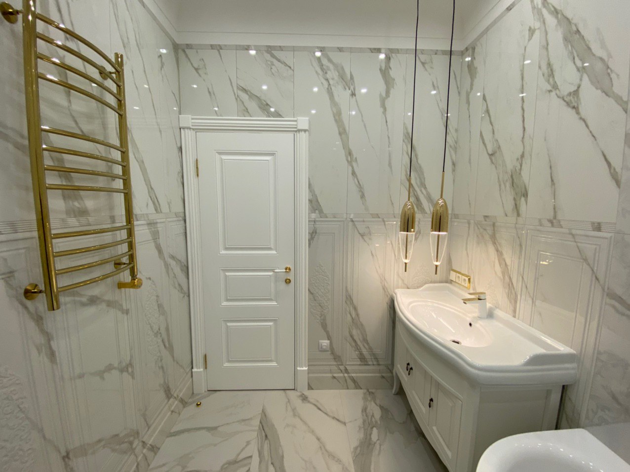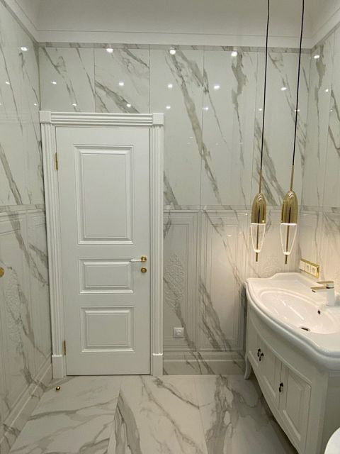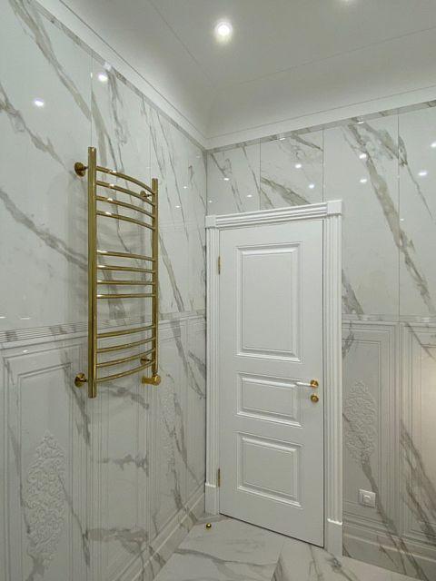 Белоснежный мрамор, немного золота и ничего лишнего – это изящное сочетание актуально во все времена и никого не оставит равнодушным. Современная сантехника и позолоченные элементы декора в композиции с благородной классической цветовой гаммой и мебелью - всегда беспроигрышный вариант для любителей неоклассики.