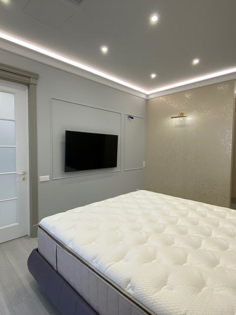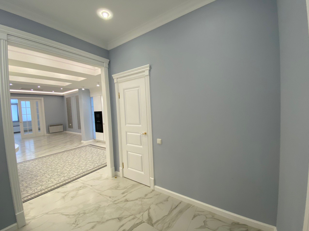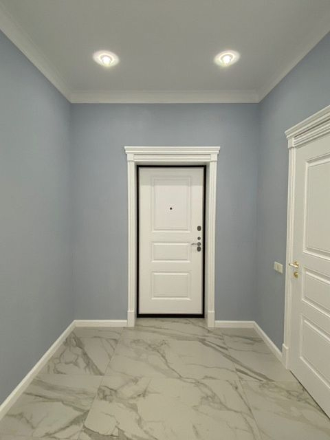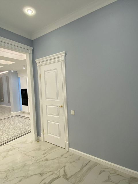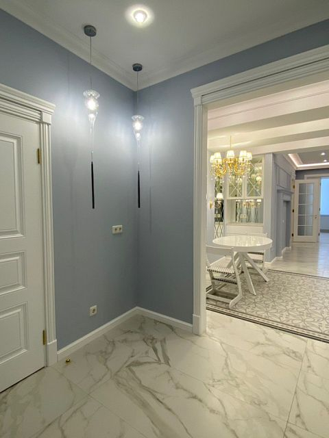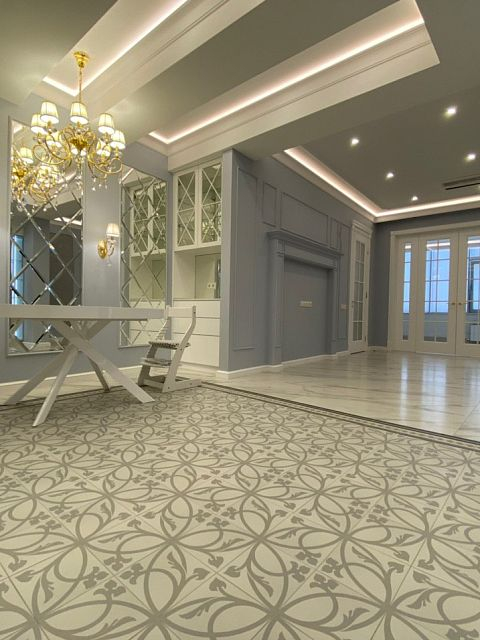Прекрасная двухкомнатная квартира выполнена в стиле неоклассика. Освежающие холодные тона, подобранные для этого проекта, смягчают позолоченные элементы декора и освещения. Квартира получилась очень светлой, утонченной, нежной и уютной. Наш проект состоит из: прихожей, хозблока, 2х санузлов, кухни-столовой, просторной каминной комнаты, светлой закрытой террасы и шикарной спальни.