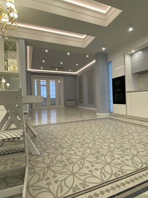 Просторная кухня-столовая встречает своих гостей морем света. Зона столовой группы декорирована зеркалами и встроенным буфетом, вся композиция создает чувство легкости, изящности и невесомости. А вот рабочая зона получилась весьма лаконичной и практичной. Особое внимание хочется уделить световому решению для данного помещения. Очень гармонично и выгодно в одной композиции сочетается современная потолочная конструкция с светодиодной подсветкой, точечные светильники в рабочей зоне и классическая группа из люстры и бра с столовой зоне. А сочетание зеркал и огромного количества света в данном случае не просто расширяют пространство, но и создают атмосферу уюта и тепла.