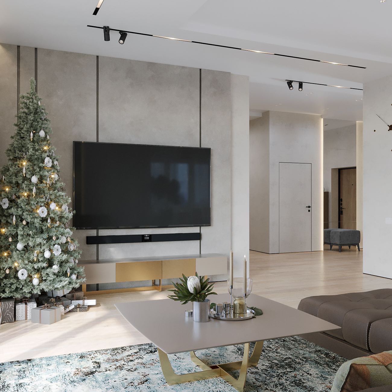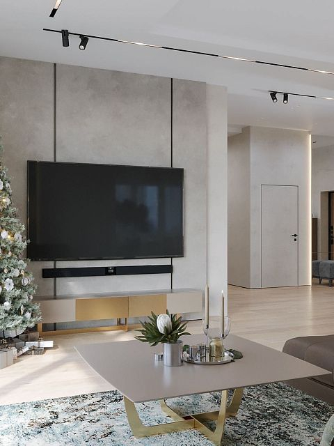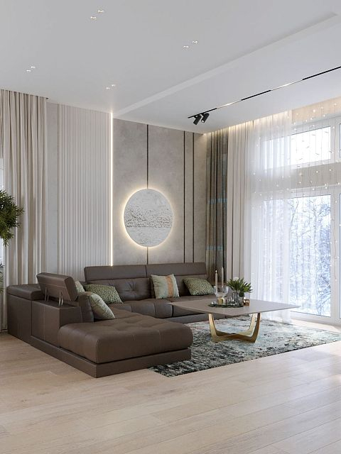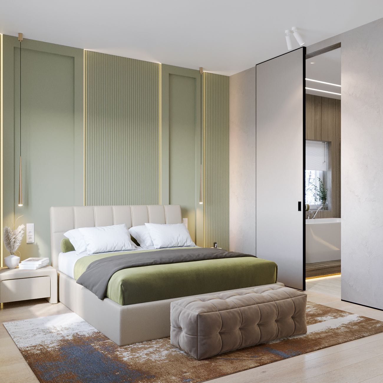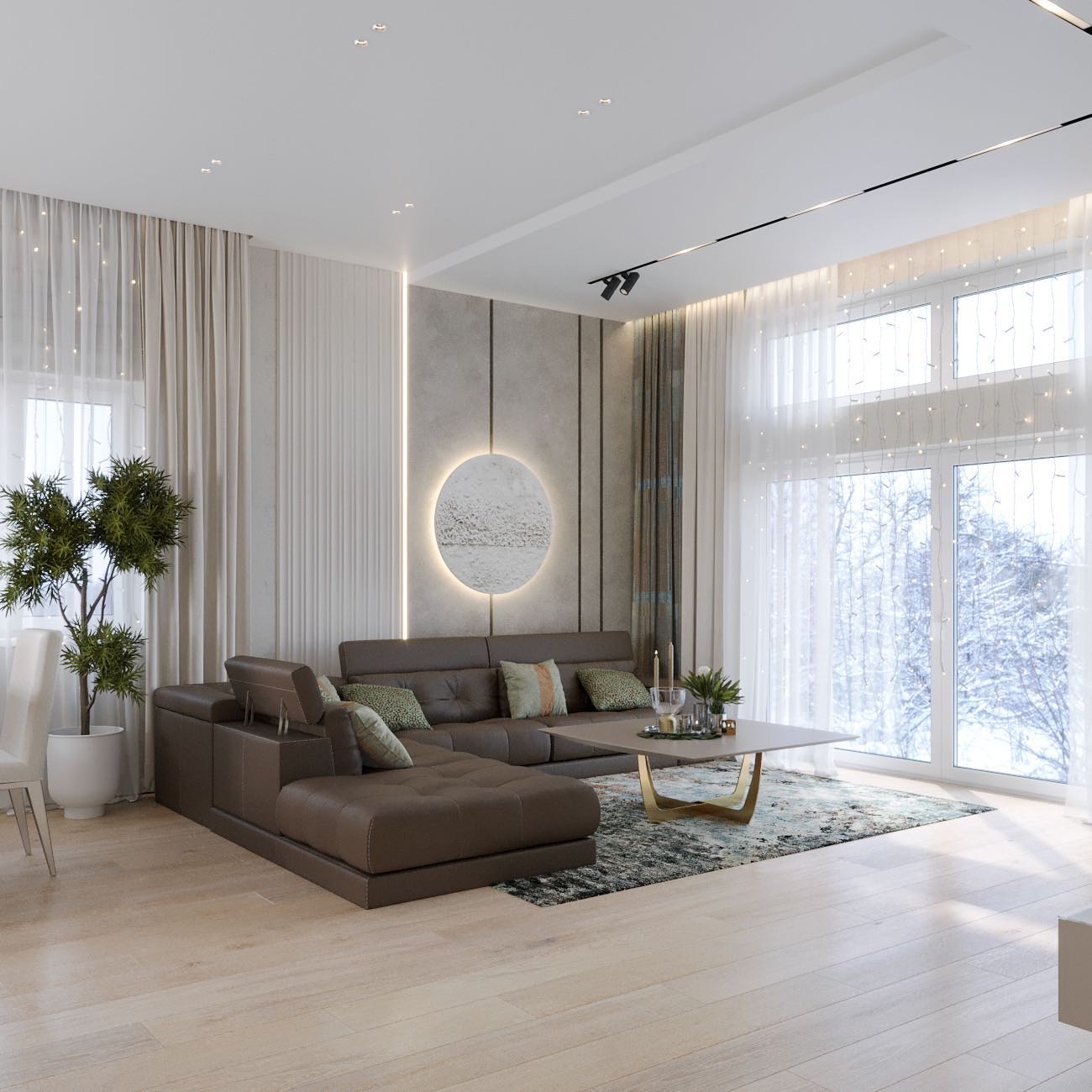 Стильный современный интерьер, выдержанный в мягких природных тонах – оливковом, сером, песочном.