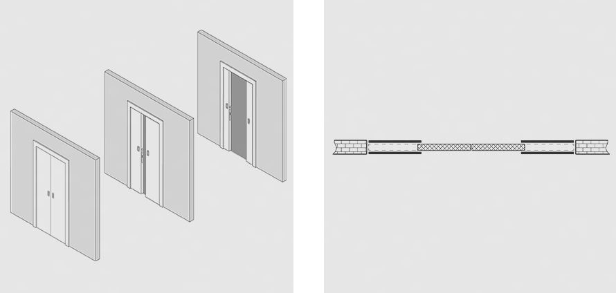Для корректной работы системы в стене необходимо сделать специальный пенал, в который будет заходить дверное полотно. Пенал монтируется непосредственно в стену, зачастую с помощью гипсокартонной конструкции. Так получается, что дверь полностью скрыта в стене, а освободившееся пространство можно использовать по своему усмотрению. Можно заказать одно или два дверных полотна.