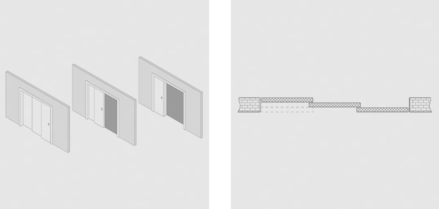 Каскадные системы устанавливаются в нестандартно широкие проемы и включают 3, 4 и больше полотен. Чаще всего это решение используется для гостиных, столовых, гардеробных, зонирования квартир-студий.
