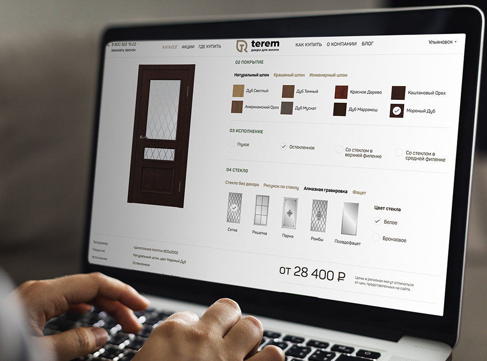 На сайте реализован конфигуратор дверей, позволяющий «примерить» разные покрытия, стекла и обрамления для выбранной модели.